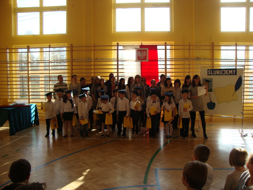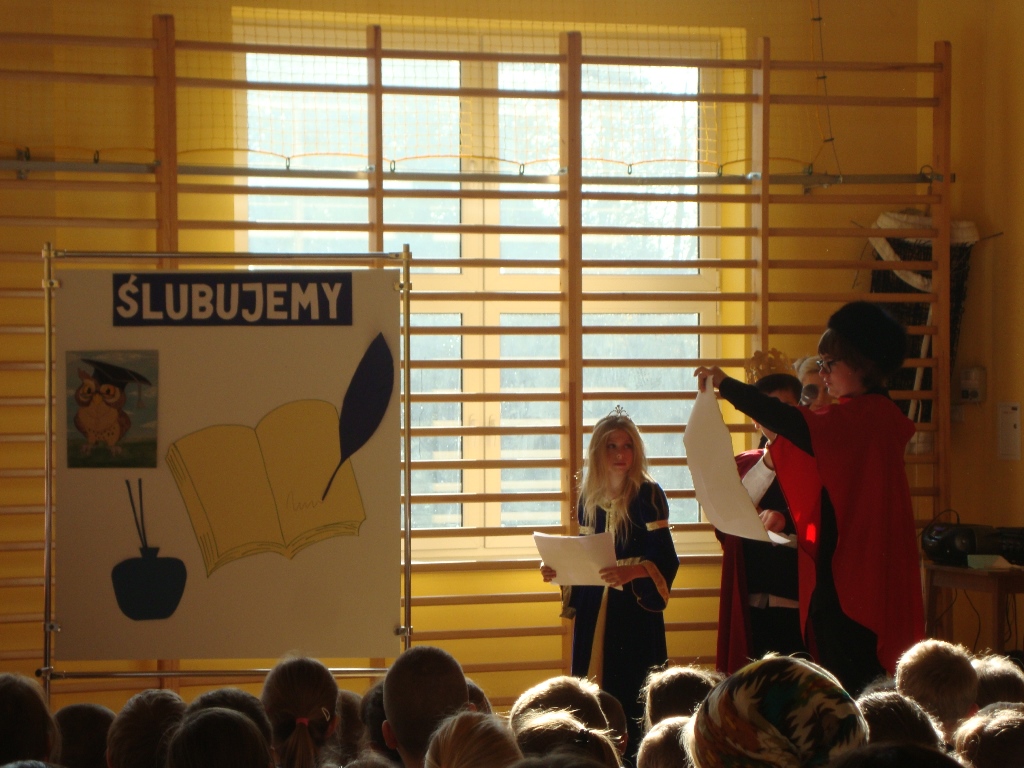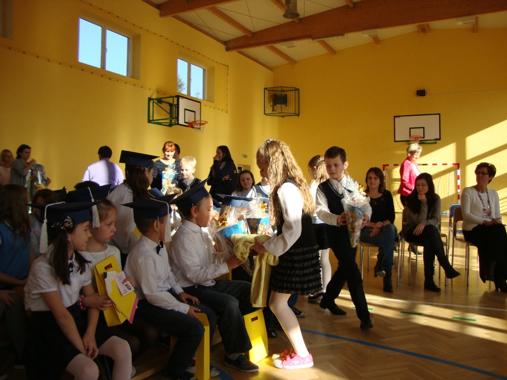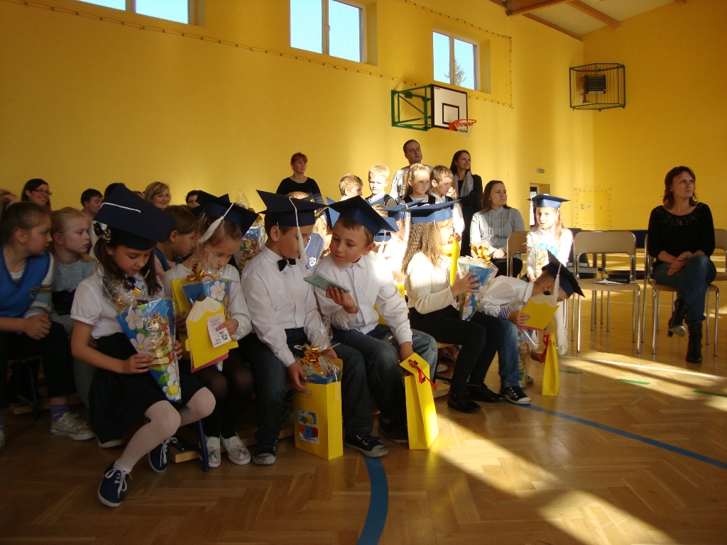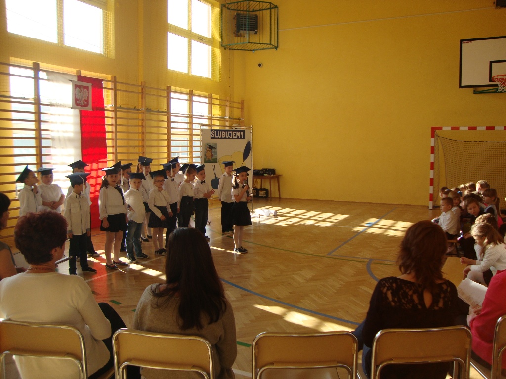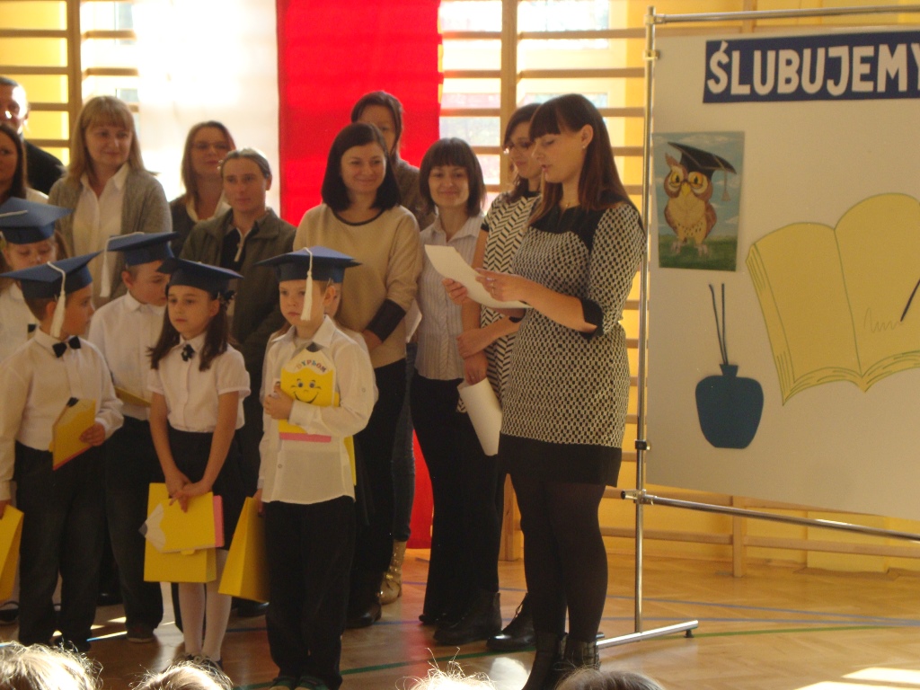 Ważnym punktem uroczystości była obietnica złożona przez rodziców pierwszoklasistów, którzy zobowiązali się do doceniania każdego wysiłku swego dziecka i wspomagania szkoły w jego rozwoju. Niespodziankę dla młodszych kolegów przygotowali uczniowie klasy drugiej. Najpierw zaprezentowali krótki występ, później obdarowali ich prezentami, a po uroczystości zaprosili na słodki poczęstunek.