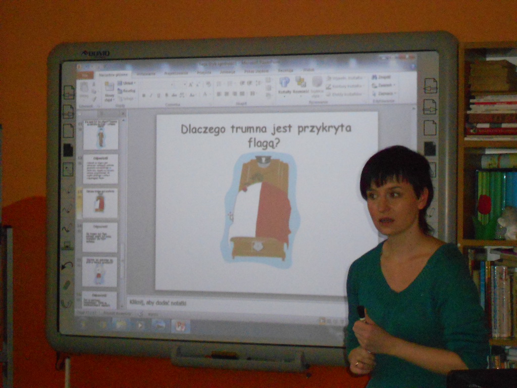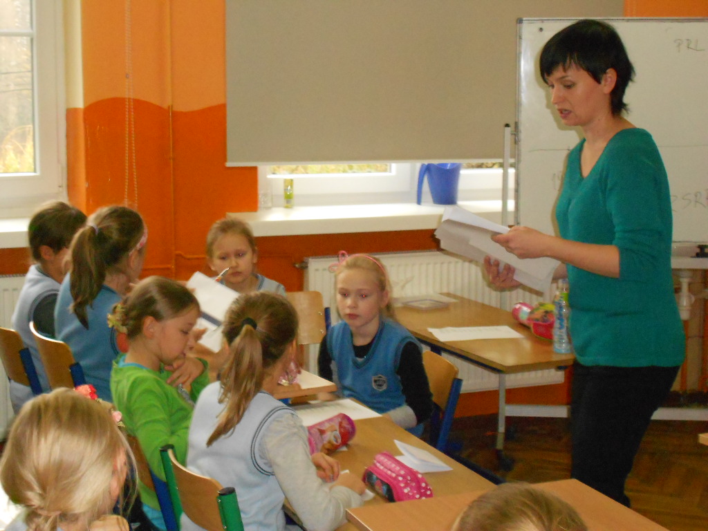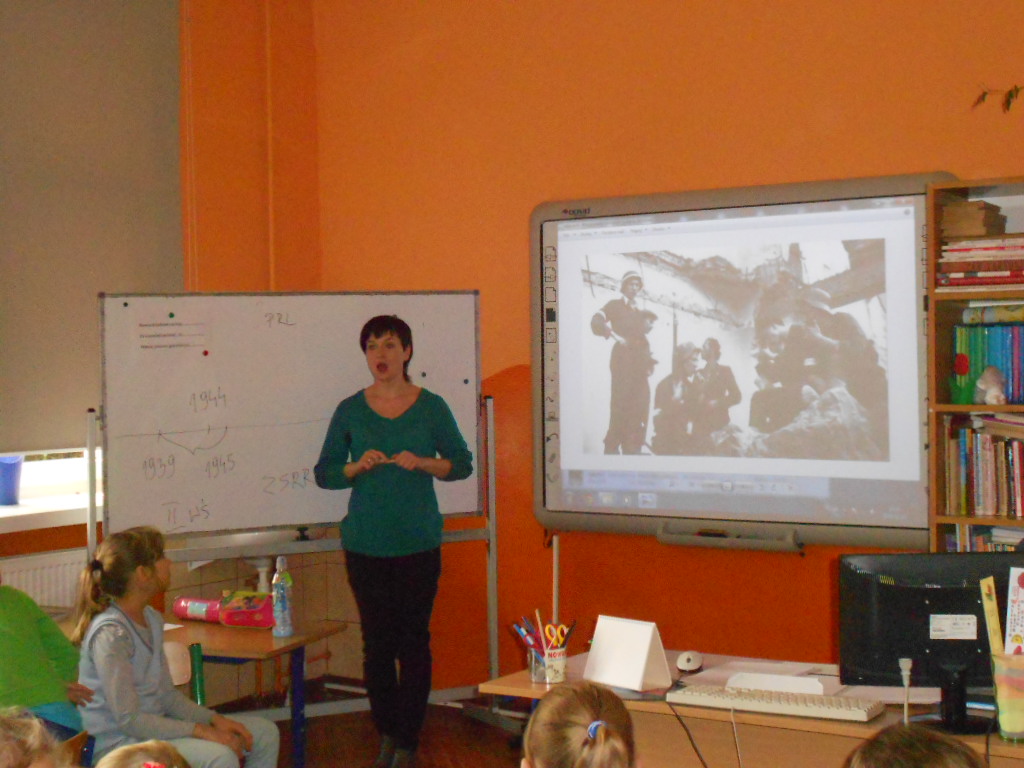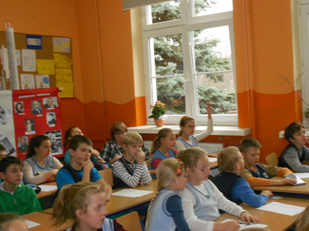 Obchody Święta Niepodległości miały w tym roku nietypowy charakter. Zamiast akademii lub apelu odbyła się dwugodzinna lekcja historii ,,Z flagą narodową przez najnowszą historię Polski”. Lekcję przeprowadziła Pani Magdalena Zapolska –Downar z Referatu Edukacji Historycznej z łódzkiego oddziału Instytutu Pamięci Narodowej. Celem lekcji było zapoznanie z najważniejszymi wydarzeniami z historii najnowszej, dlatego uczniowie wysłuchali krótkiego wykładu o systemie politycznym i realiach PRL-u, wykonywali karty pracy w oparciu o materiał źródłowy (teksty i fotografie) ustalając przyczyny, przebieg i skutki takich wydarzeń jak Powstanie Warszawskie, Poznań’56, Marzec’68, Grudzień’70 i Czerwiec’76 . Ważnym aspektem lekcji było przypomnienie historii polskich symboli narodowych i określenie ich roli, szczególnie polskiej flagi, w omawianych wydarzeniach z okresu PRL-u. Dzieci obejrzały film animowany ilustrujący genezę każdego z symboli narodowych oraz prezentację multimedialną pokazującą różne sytuacje i miejsca, w których obecna jest narodowa symbolika.