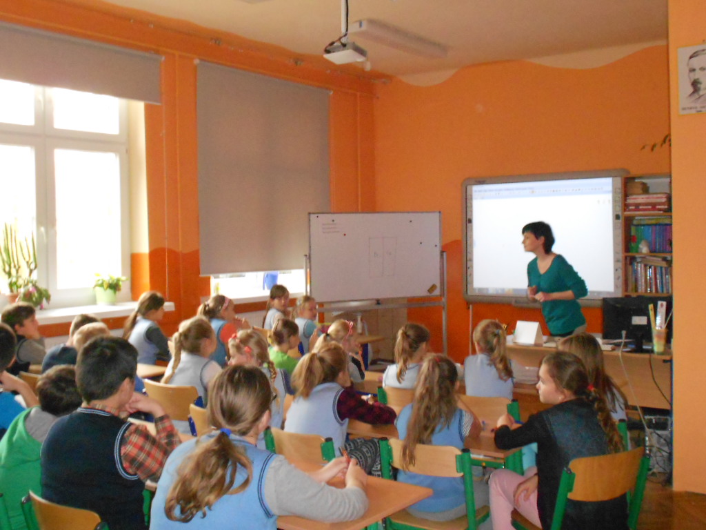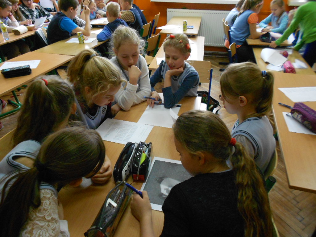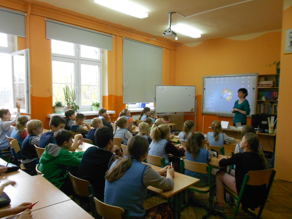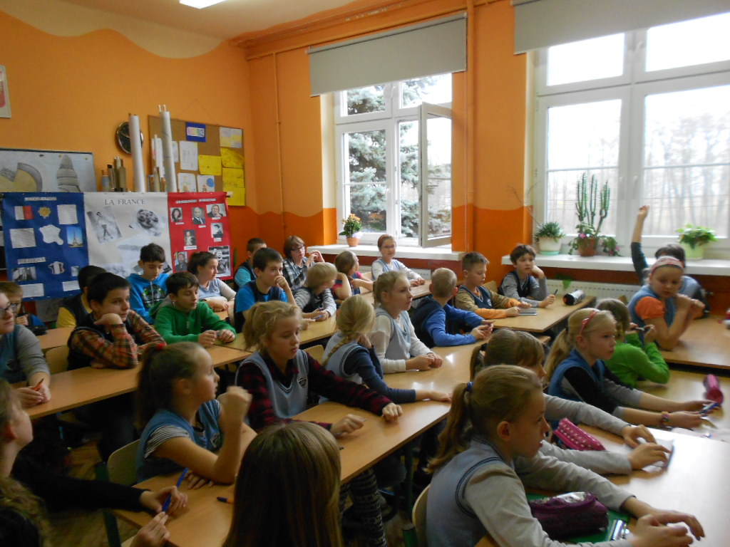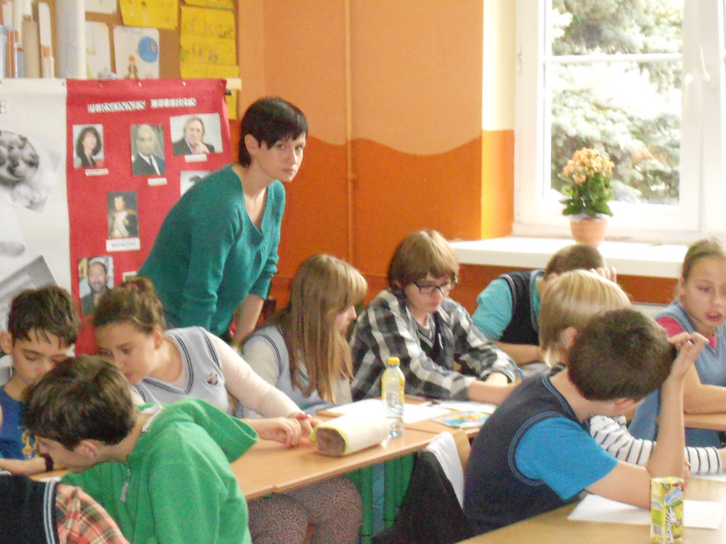 Obchody Święta Niepodległości miały w tym roku nietypowy charakter. Zamiast akademii lub apelu odbyła się dwugodzinna lekcja historii ,,Z flagą narodową przez najnowszą historię Polski”. Lekcję przeprowadziła Pani Magdalena Zapolska –Downar z Referatu Edukacji Historycznej z łódzkiego oddziału Instytutu Pamięci Narodowej. Celem lekcji było zapoznanie z najważniejszymi wydarzeniami z historii najnowszej, dlatego uczniowie wysłuchali krótkiego wykładu o systemie politycznym i realiach PRL-u, wykonywali karty pracy w oparciu o materiał źródłowy (teksty i fotografie) ustalając przyczyny, przebieg i skutki takich wydarzeń jak Powstanie Warszawskie, Poznań’56, Marzec’68, Grudzień’70 i Czerwiec’76 . Ważnym aspektem lekcji było przypomnienie historii polskich symboli narodowych i określenie ich roli, szczególnie polskiej flagi, w omawianych wydarzeniach z okresu PRL-u. Dzieci obejrzały film animowany ilustrujący genezę każdego z symboli narodowych oraz prezentację multimedialną pokazującą różne sytuacje i miejsca, w których obecna jest narodowa symbolika.