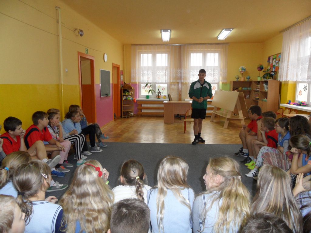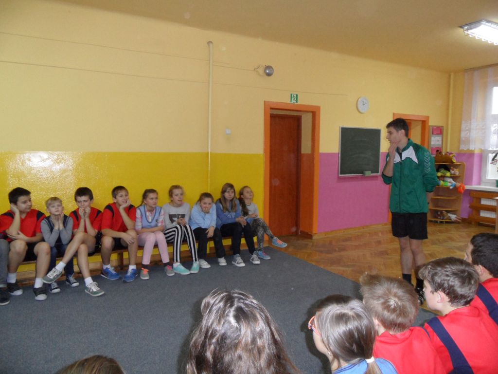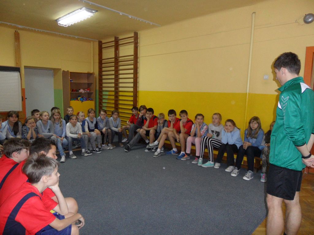 Podwójny chwyt, naruszenie pola bramkowego, błąd odbicia i kozłowania- to tylko niektóre określenia sygnalizacji sędziowskiej obowiązującej w czasie gry w piłkę ręczną. Te i inne szczegóły dotyczące sędziowania przedstawił uczniom Pan Daniel Przybysz- licealista, który pracuje jako sędzia okręgowy. Mimo swojego młodego wieku umiejętnie łączy on naukę ze swoją pasją, a dodatkowo jest zawodnikiem w drużynie piłki ręcznej.Podczas prelekcji Pan Daniel przybliżył uczniom zasady gry w piłkę ręczną. Mówił też jak ważne jest przestrzeganie zasad fair play w czasie gry oraz podkreślił wagę zachowania bezpieczeństwa, które odgrywa najważniejszą rolę w uprawianiu sportu na każdym poziomie.