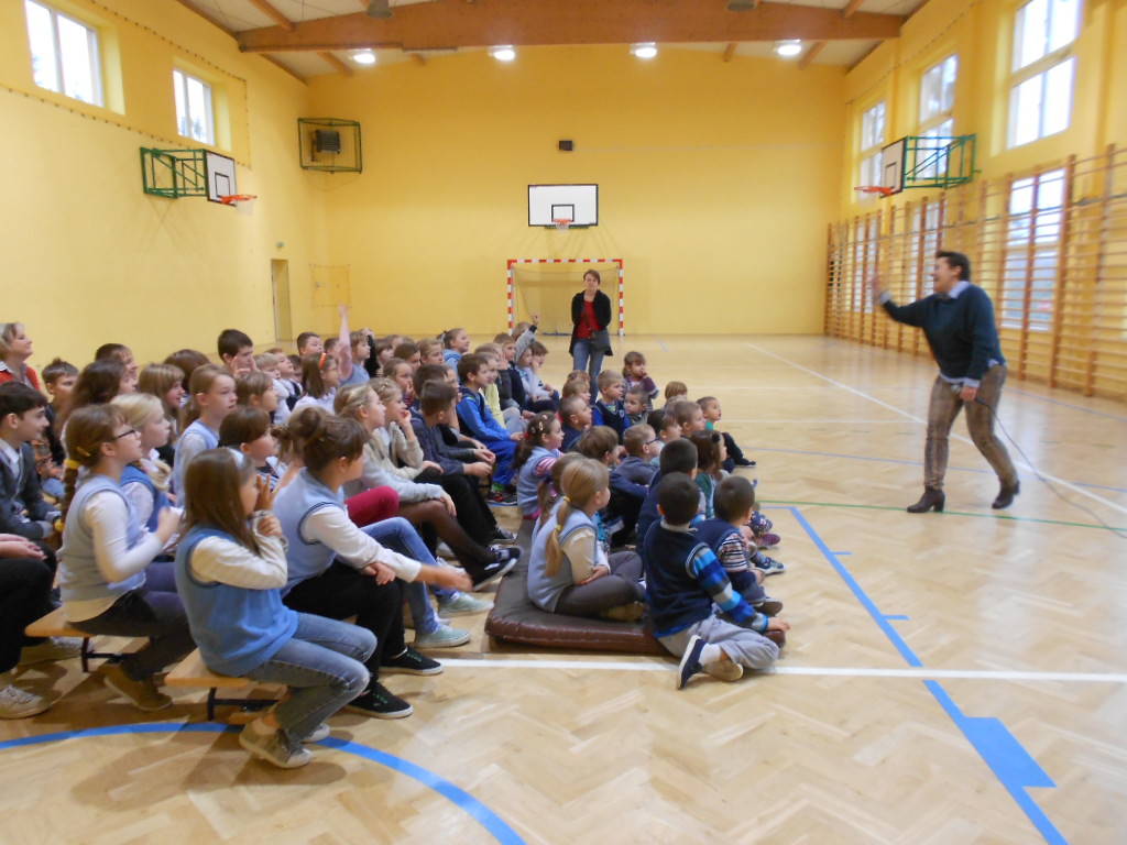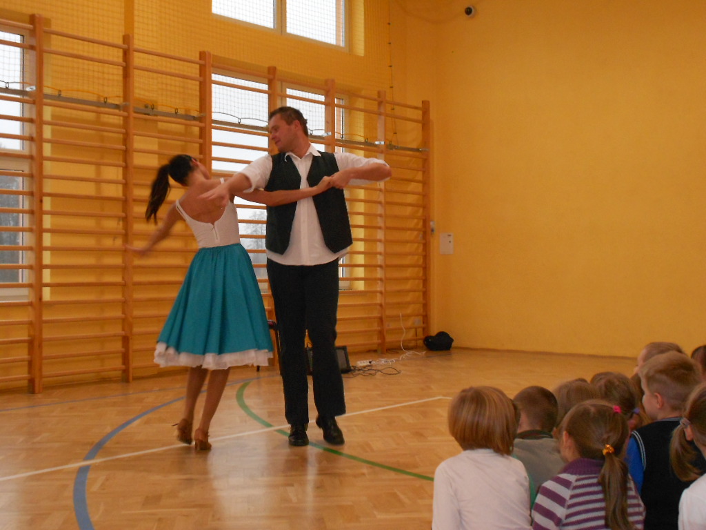 20 listopada przez 45 min. byliśmy uczniami ,,wędrownej szkoły tańca”. Pani Ewa Kowalska- Lipska i towarzyszący jej tancerze opowiedzieli nam ciekawą historię . Dowiedzieliśmy się, że taniec powstał dzięki wierzeniom religijnym ; ludzie tańczyli po to, by sprowadzić deszcz w czasie suszy. Od tysięcy lat ludzie przekazywali swe opowieści w formie tańca, a wojownicy tańczyli, żeby wzbudzić w sobie odwagę przed walką. Poznaliśmy podstawowe kroki wielu znanych i uprawianych od wieków tańców np. stylu tańca towarzyskiego zwanego swingiem, pochodzącego z USA i tańczonego do muzyki jazzowej.