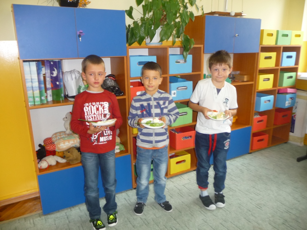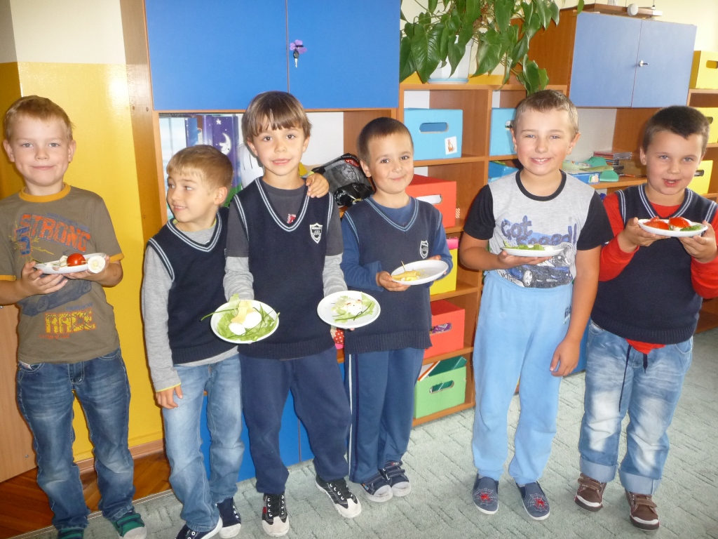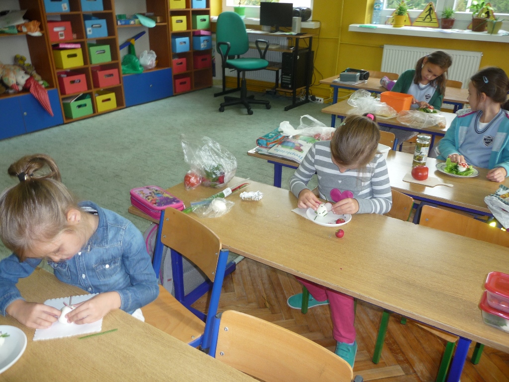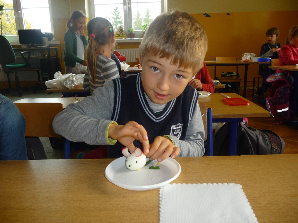 Na jednej z lekcji w klasie I uczniowie poznając literkę J jak jajko przygotowali różne przysmaki z jaj. Było zabawnie i kolorowo. Pojawiły się myszki, grzybki, misie, żaglówki, a to wszystko z jajek, sera i warzyw. Na koniec było smacznie, gdyż z apetytem uczniowie zjedli przekąski.
