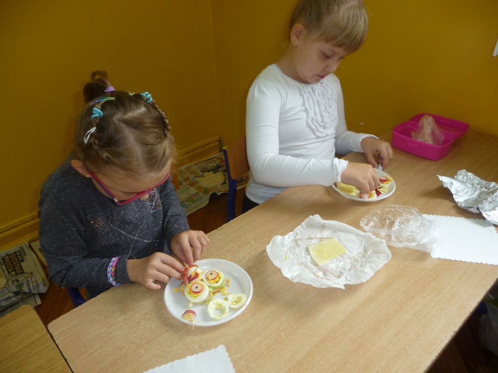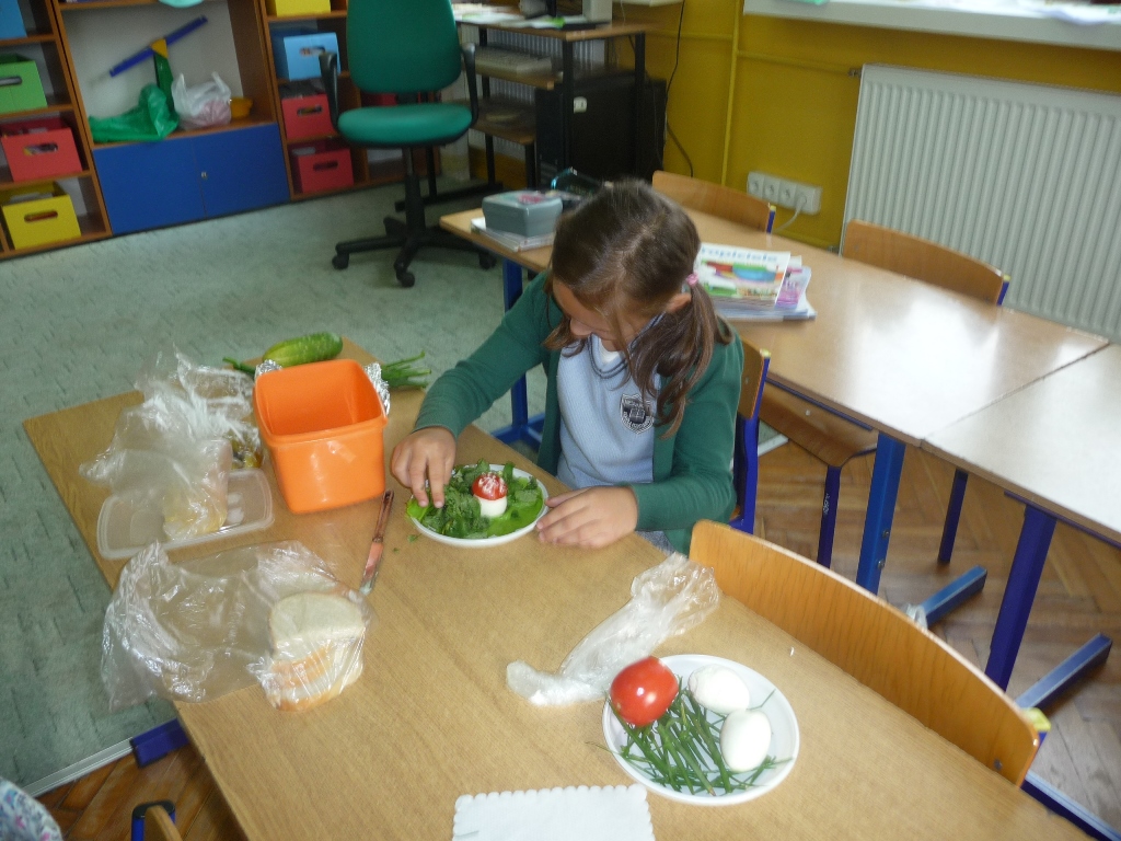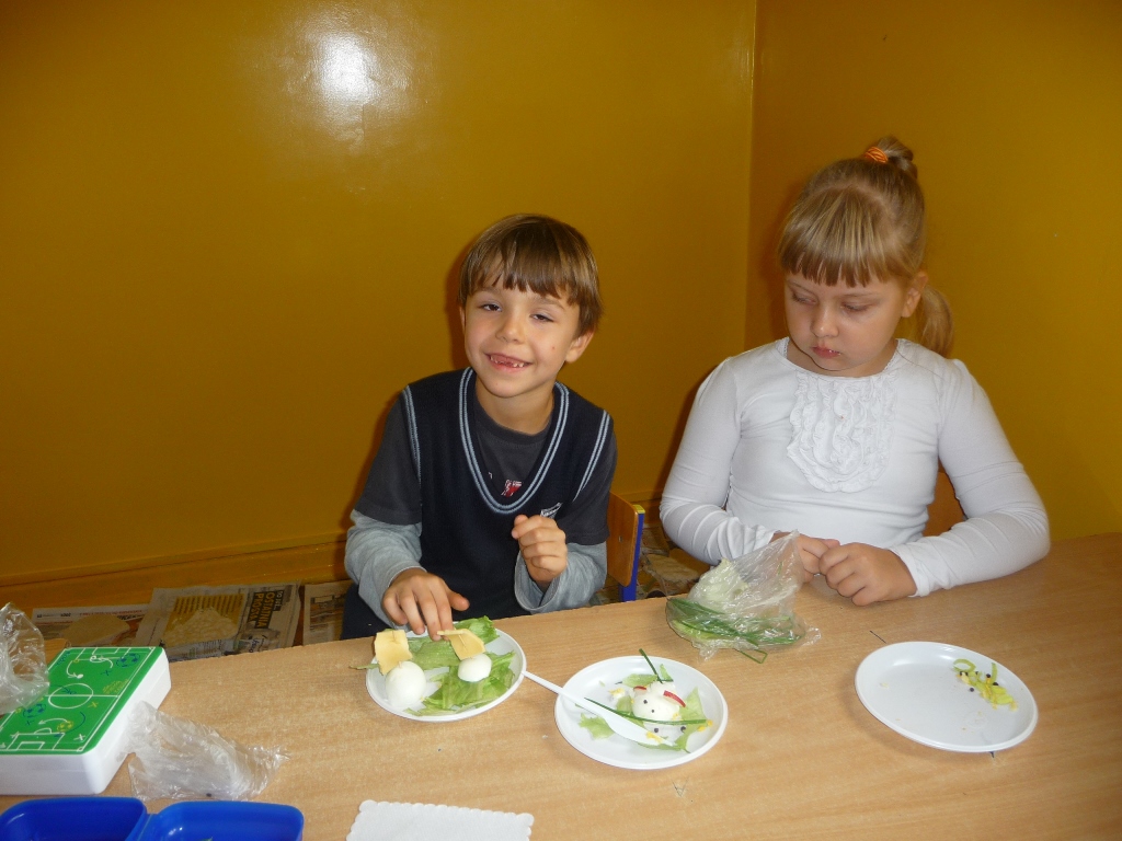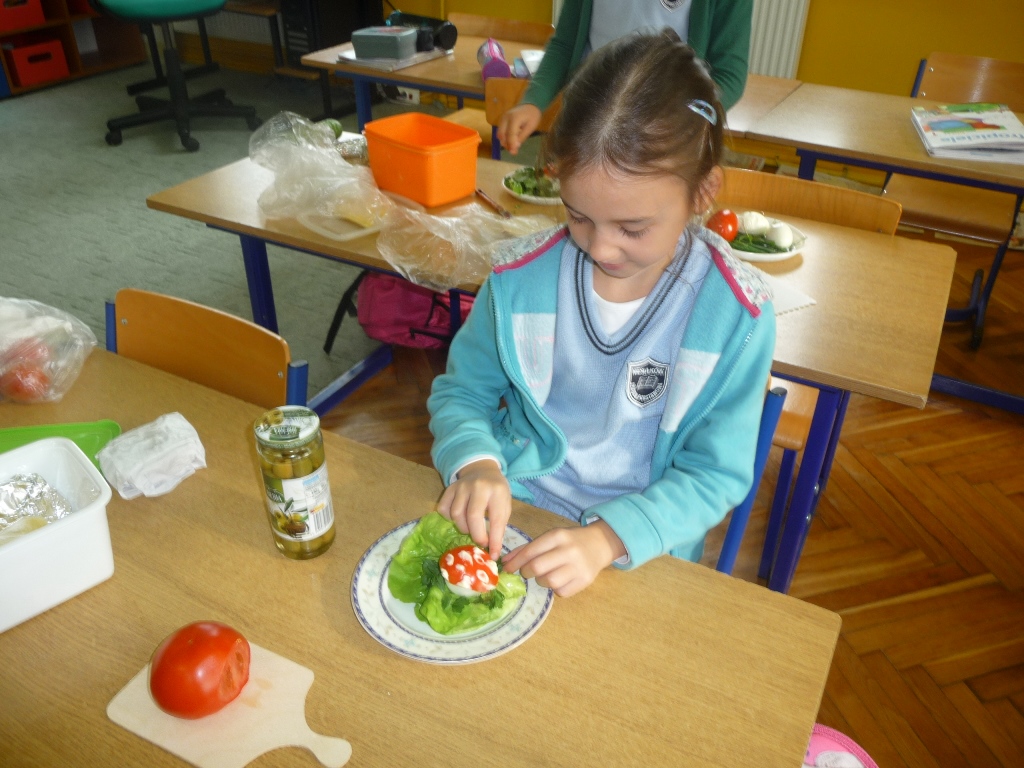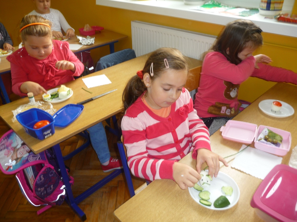Na jednej z lekcji w klasie I uczniowie poznając literkę J jak jajko przygotowali różne przysmaki z jaj. Było zabawnie i kolorowo. Pojawiły się myszki, grzybki, misie, żaglówki, a to wszystko z jajek, sera i warzyw. Na koniec było smacznie, gdyż z apetytem uczniowie zjedli przekąski.
