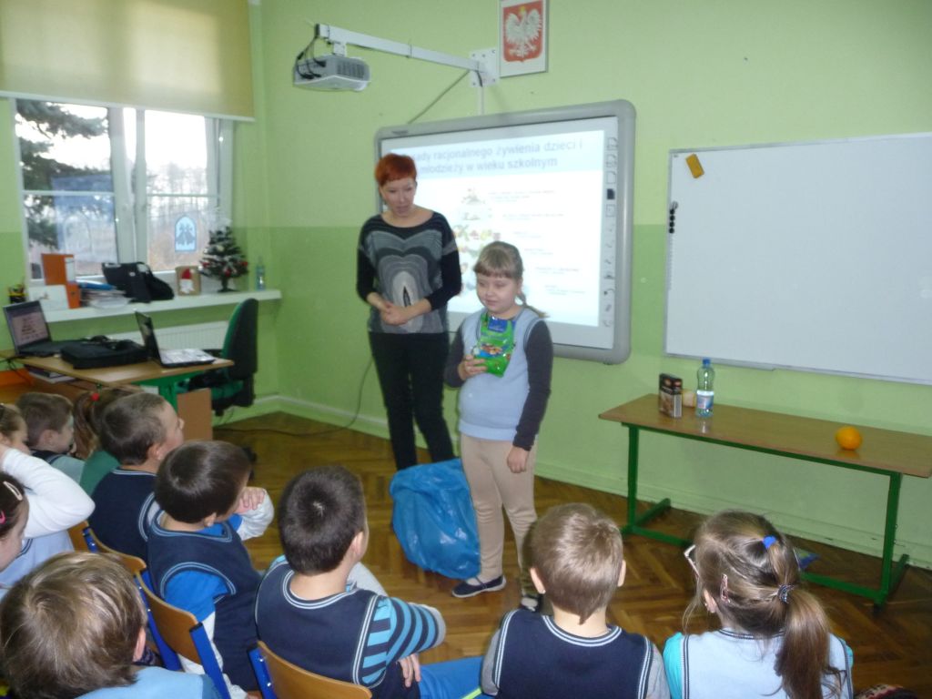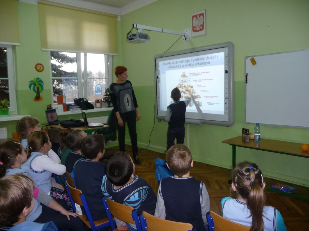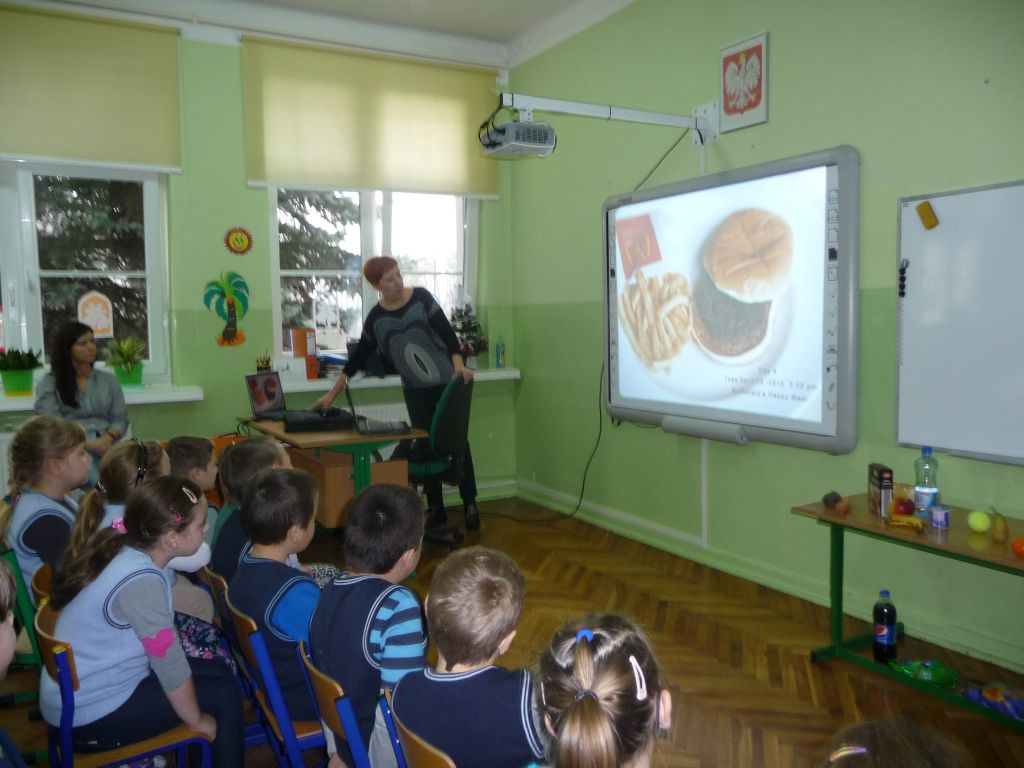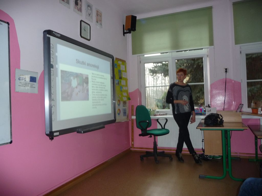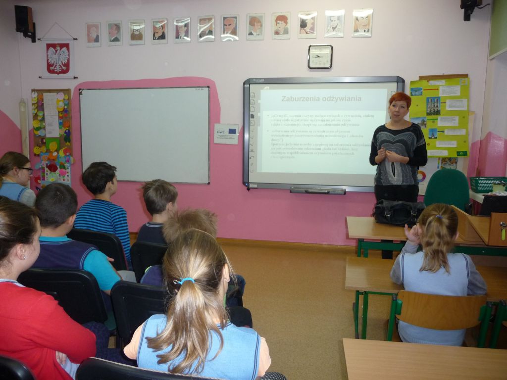Nasza szkoła przystąpiła do Ogólnopolskiego Konkursu Aktywna Szkoła - Aktywny Uczeń. Aby spełnić wymagania konkursu należy podjąć szereg działań ukierunkowanych na promocję zdrowego trybu życia wśród uczniów i rodziców. W tym celu zorganizowano spotkanie ze specjalistką do spraw żywienia Panią Ewą Piszczyńską. Główny temat konwersatorium brzmiał "Zaburzenia stanu zdrowia i rozwoju związane z nieprawidłowym odżywianiem". Spotkanie podzielone było na dwie części. W pierwszej z nich młodsi uczniowie dowiedzieli się jak wygląda piramida zdrowego żywienia. Dzieci, poprzez zabawę, uczyły się, które produkty żywnościowe szkodzą zdrowiu, a które należy spożywać w dużych ilościach i dlaczego. W czasie drugiego spotkania, ze starszymi uczniami, poruszane były tematy związane z otyłością, anoreksją i bulimią. Pani dietetyk zwracała uwagę uczniów jak ważne jest prawidłowe odżywianie i jakie mogą być zgubne konsekwencje dążenia za wszelką cenę do osiągnięcia idealnej sylwetki.
