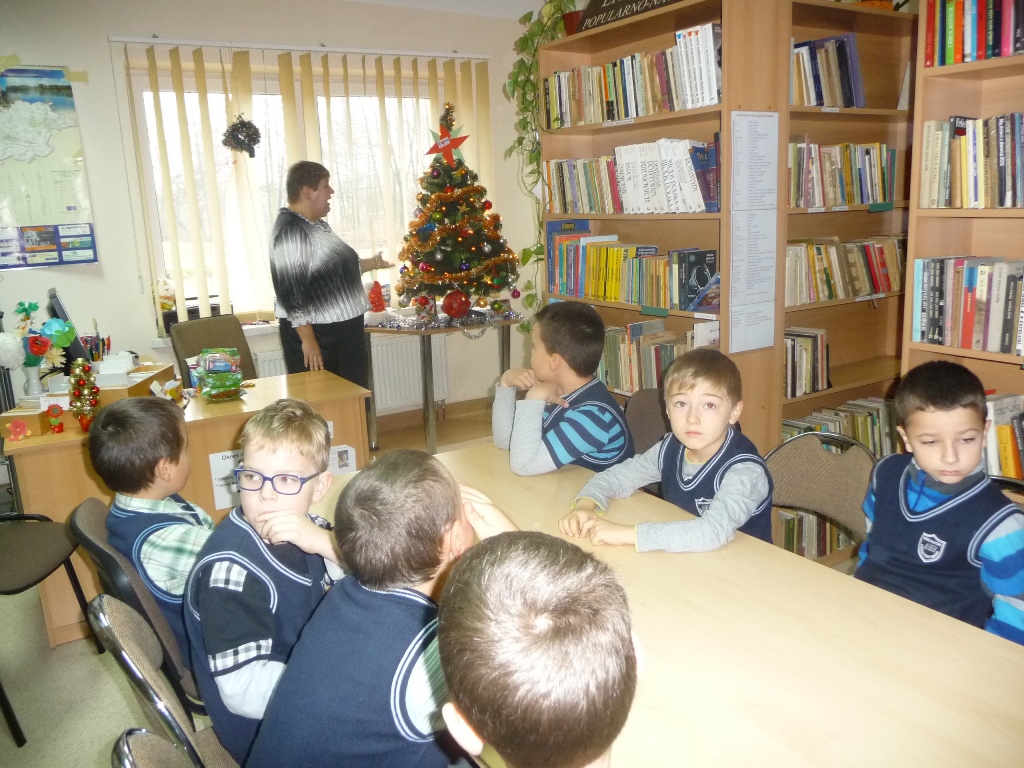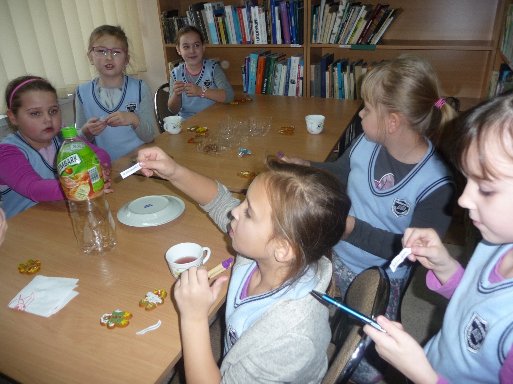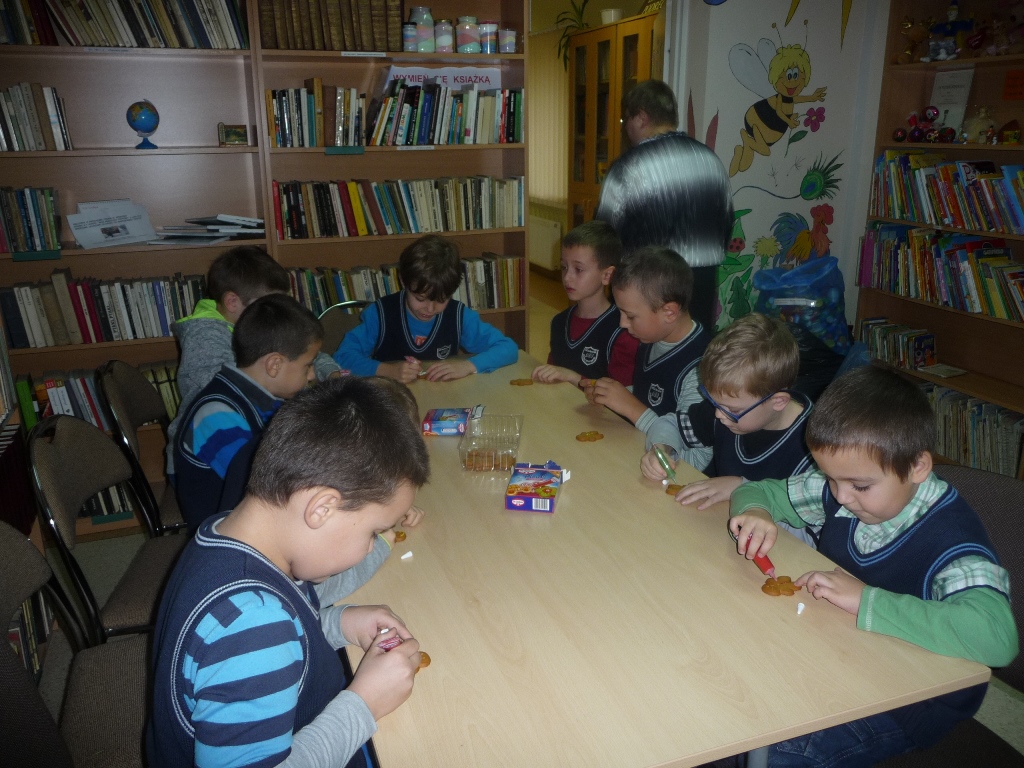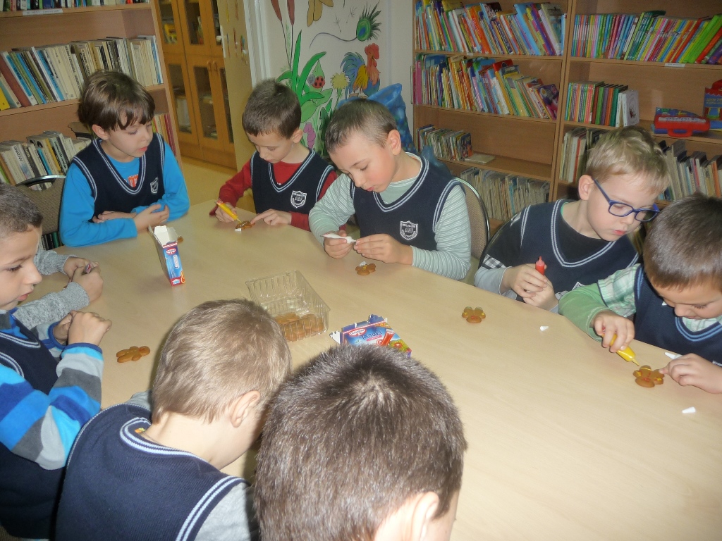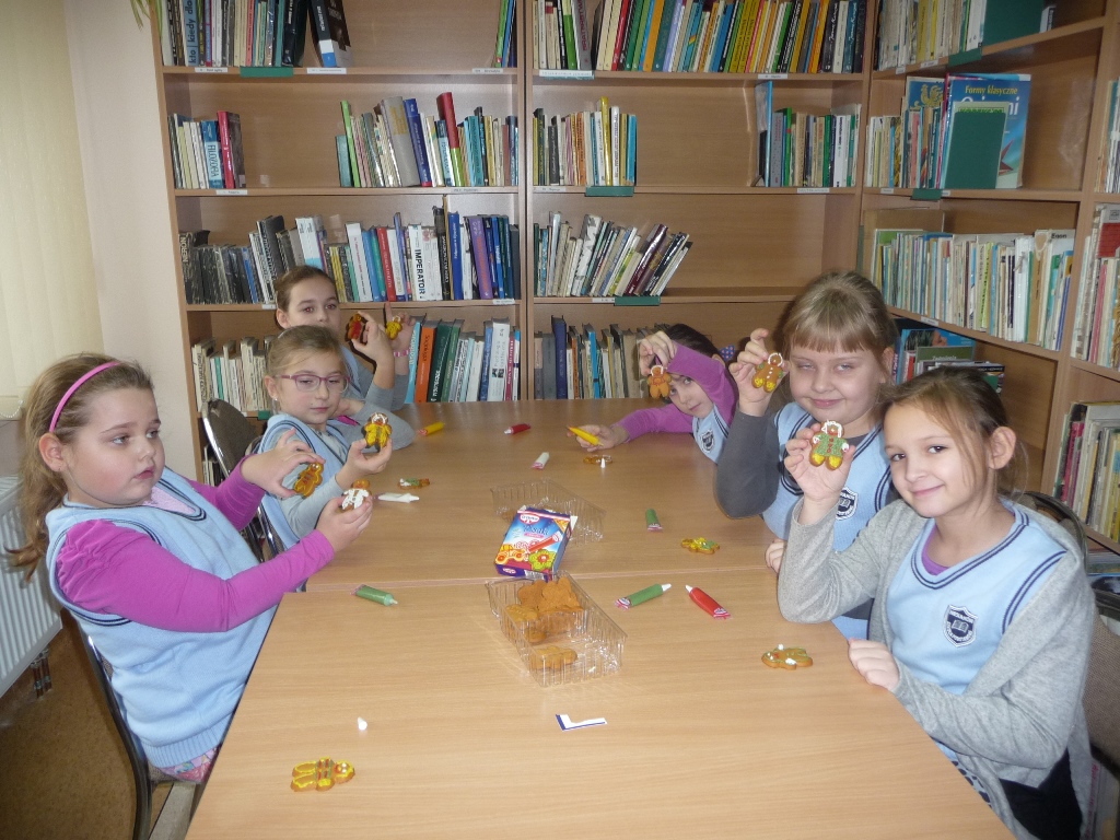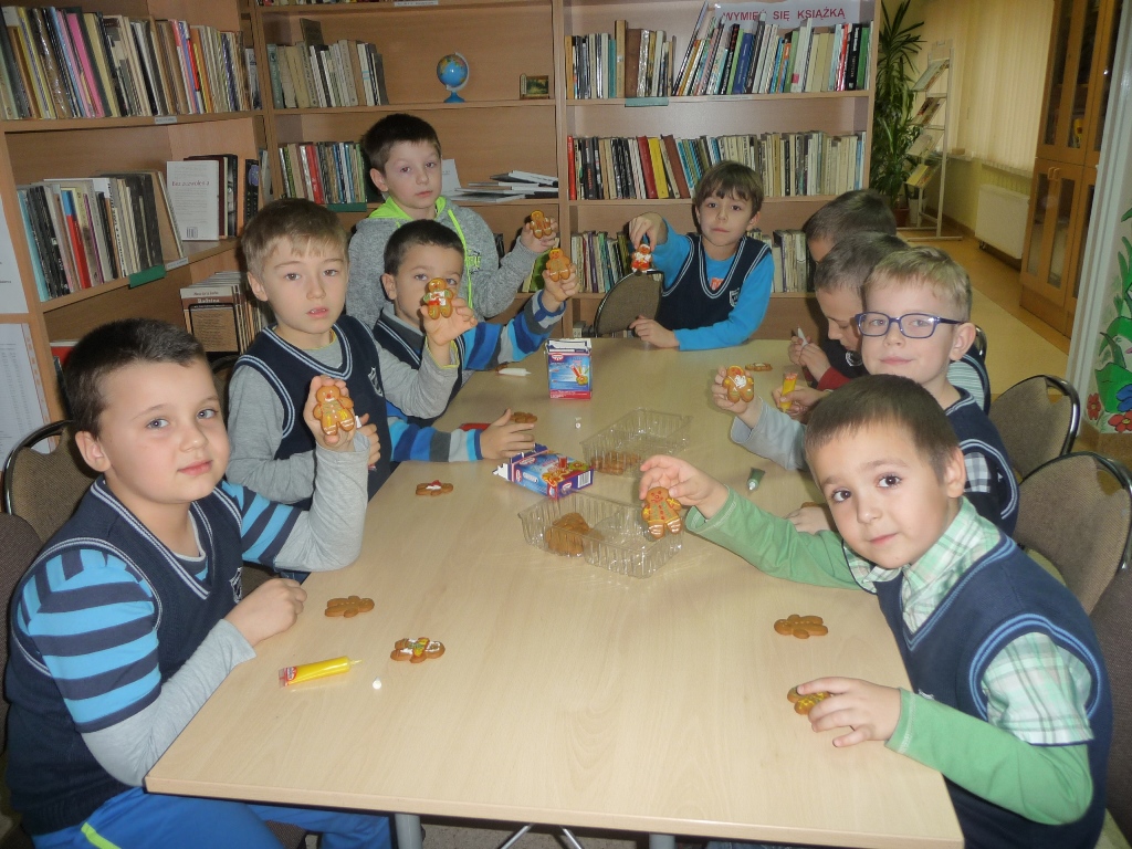 16 grudnia 2014r uczniowie klasy I odwiedzili Bibliotekę Publiczną w Niesułkowie. Celem przedświątecznego spotkania z panią Renatą Szydlik było malowanie pierników słodkim i kolorowym lukrem. Wszyscy pięknie udekorowali swoje pierniczki – misie, które potem mogli skosztować. Dla najlepszych za ciekawe pomysły czekały dyplomy i nagrody w postaci pluszaków. Otrzymali je Jagoda Szychowska i Mateusz Szymański.