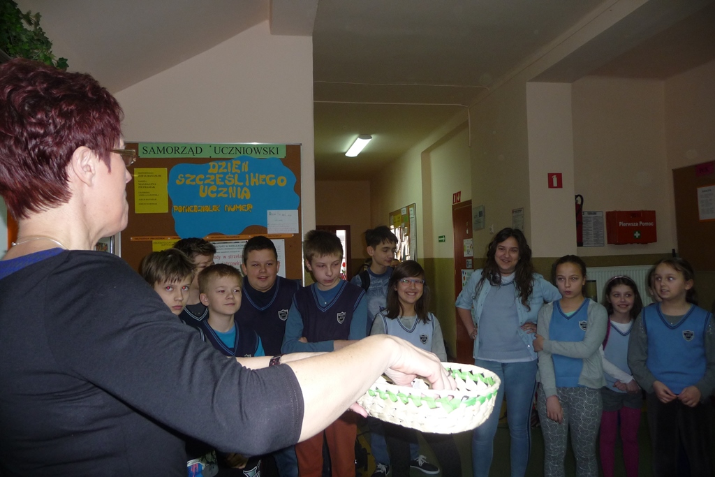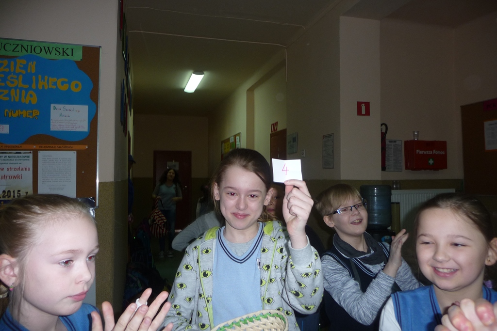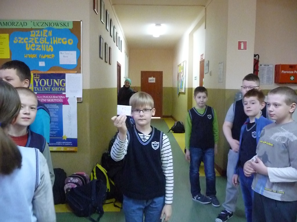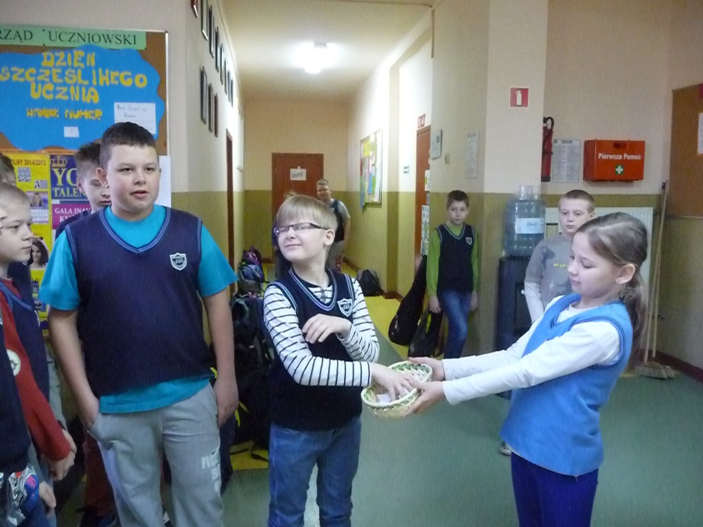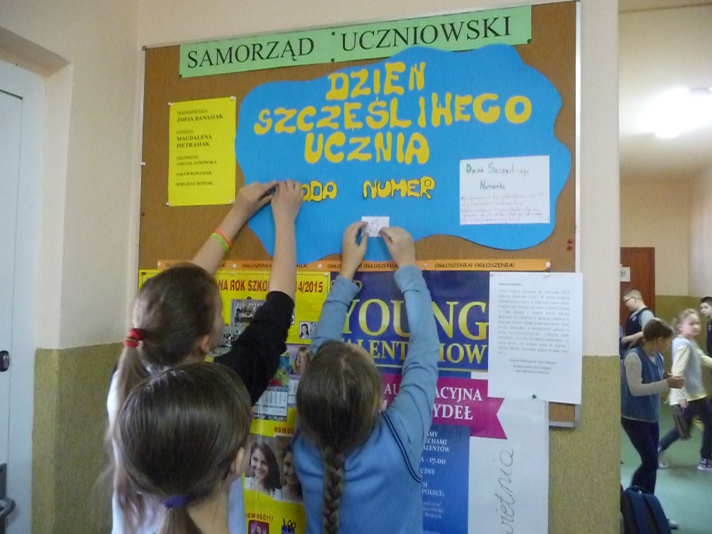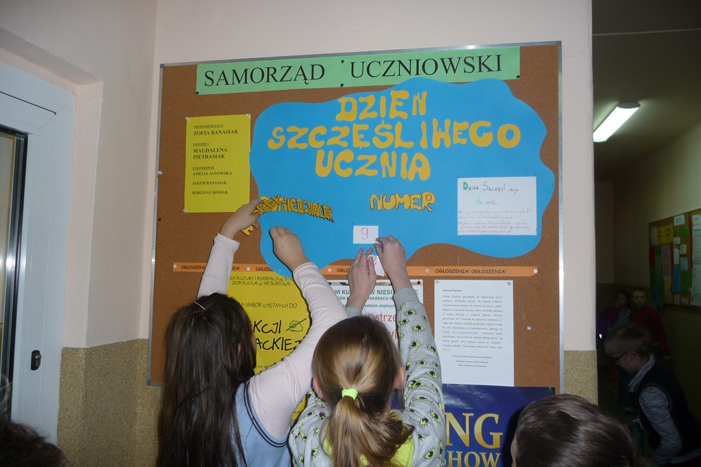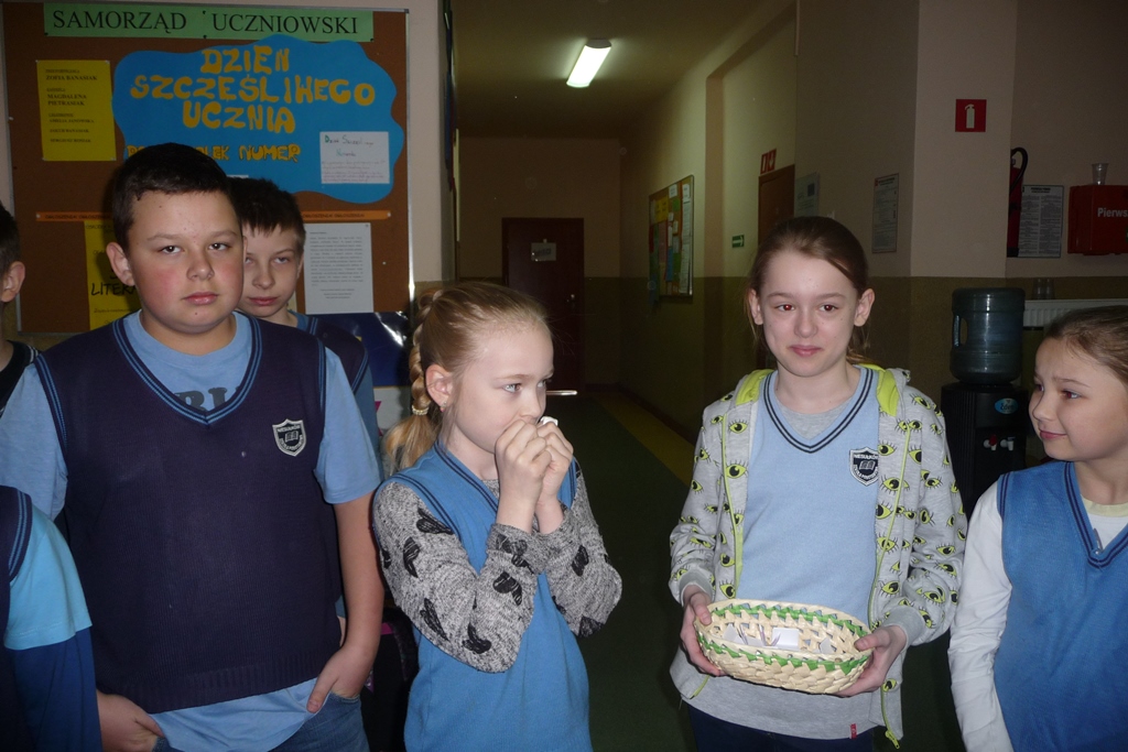 Uczniowie lubią przychodzić do szkoły, ale już nie zawsze przepadają za ustnymi odpowiedziami, dlatego na zebraniu Samorządu Uczniowskiego powstał pomysł zorganizowania Dnia Szczęśliwego Ucznia. W poniedziałek 20 kwietnia, wszyscy z nieukrywaną ciekawością oczekiwali pierwszego losowania, w którym Pani Dyrektor wyłoniła pierwszych szczęśliwców. Uczniowie wszystkich klas mający dziewiąty numer w dzienniku byli zwolnieni w tym dniu z ustnych odpowiedzi. Przez cały tydzień o ustalonej godzinie losowane były kolejne numery, dzięki którym wybrańcy nie musieli martwić się niespodziewanym pytaniem i z jeszcze większą radością uczestniczyli w lekcjach.