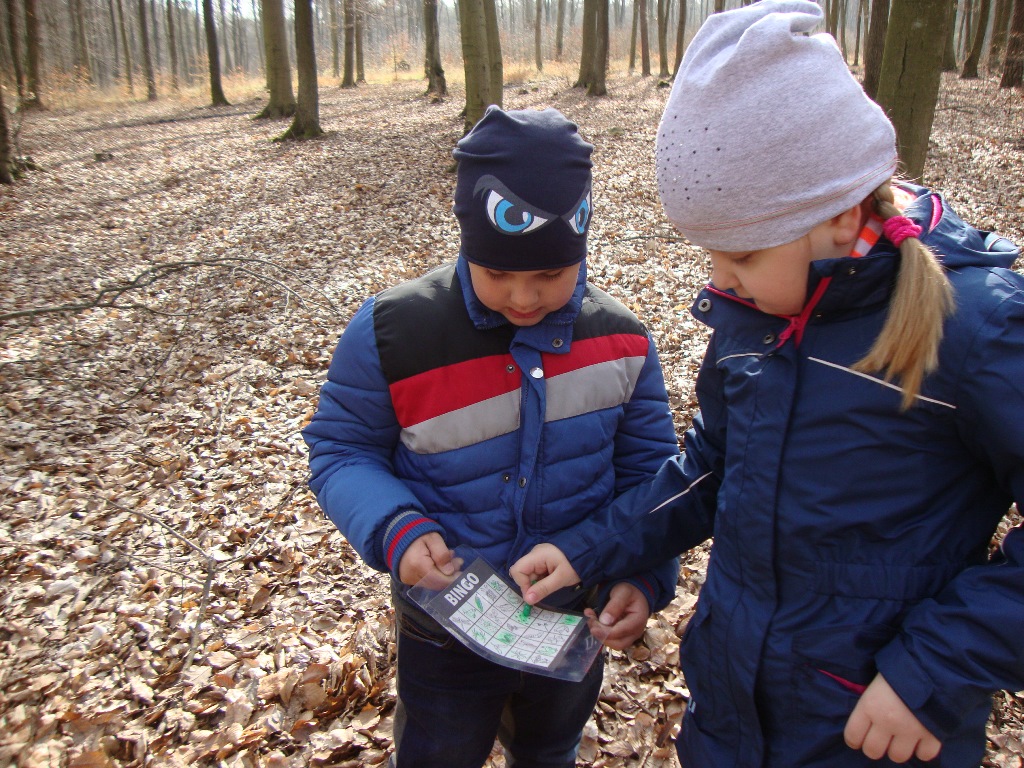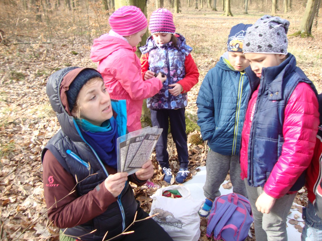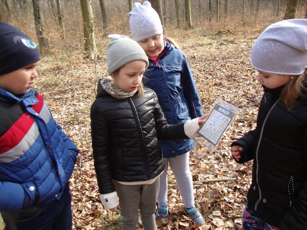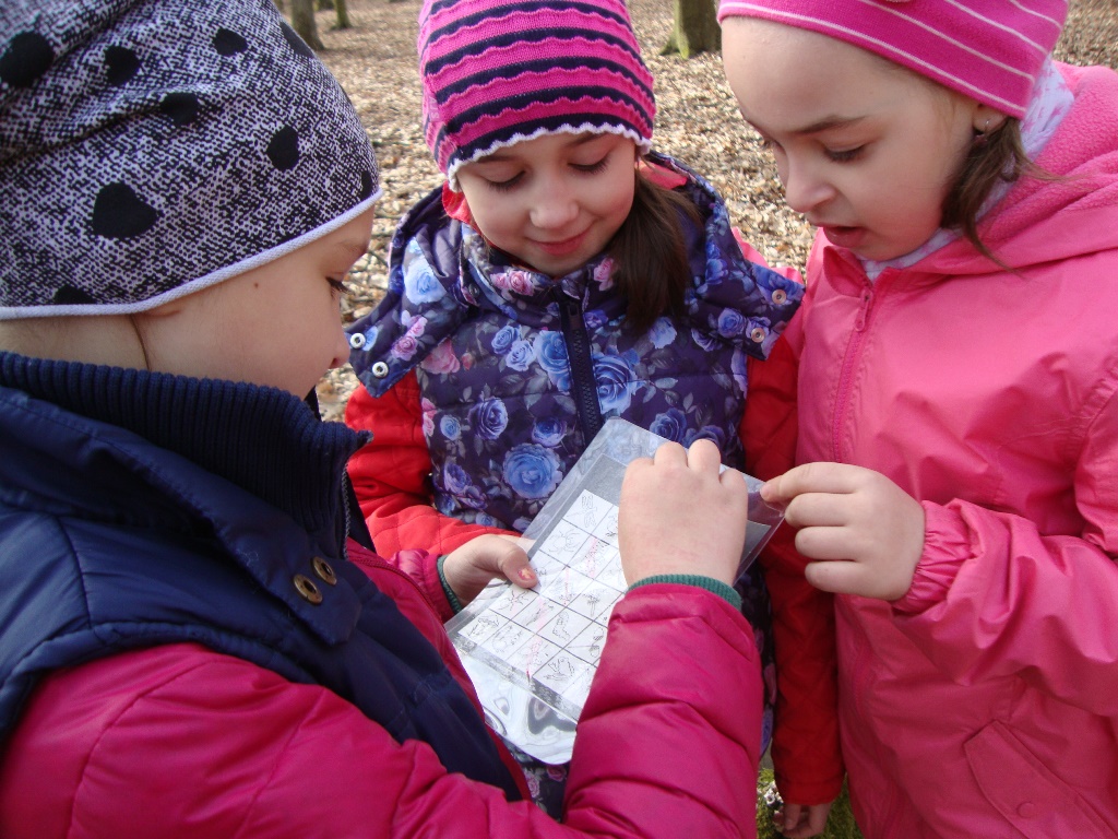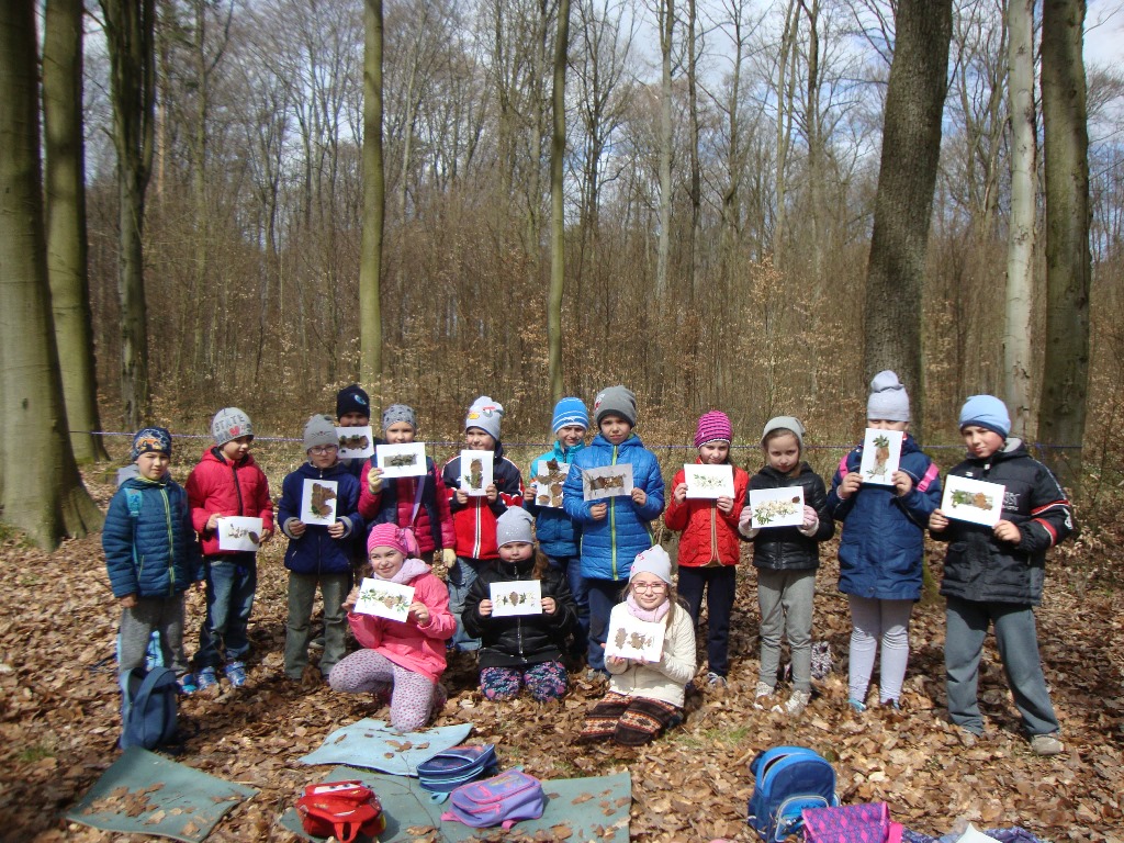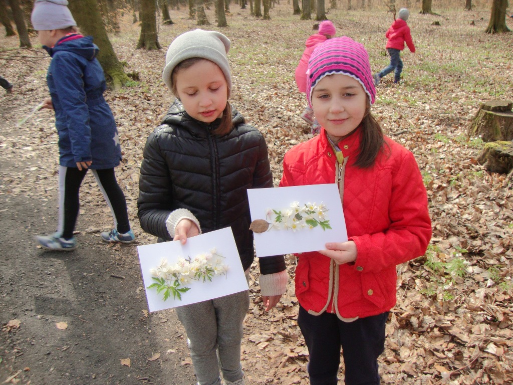 17 kwietnia odbyły się kolejne zajęcia w rezerwacie przyrody Parowy Janinowskie dla uczniów klasy I. Na początku uczniowie zostali podzieleni na 4 grupy. Każda grupa dostała kartkę Bingo, a na niej różne obrazki przyrody. Zadaniem grupy było odnalezienie i zamalowanie pastelami tylko tych obrazków, które udało się zobaczyć np. biedronkę, motyla czy piórko. Kolejnym zadaniem było rozpoznawanie po dotyku dowolnego elementu przyrody ( szyszki, igły czy patyka) oraz zabawa w fotografowanie, czyli przyglądanie się wybranemu okazowi przyrody przez chwilę, a następnie z pamięci namalowanie go pastelami na kartonie. Dzieci malowały zawilce, biedronki, motyle czy też młode drzewka.
