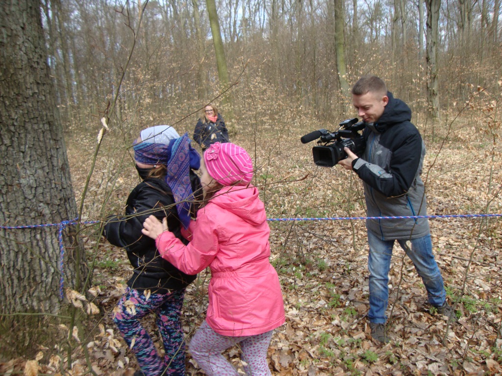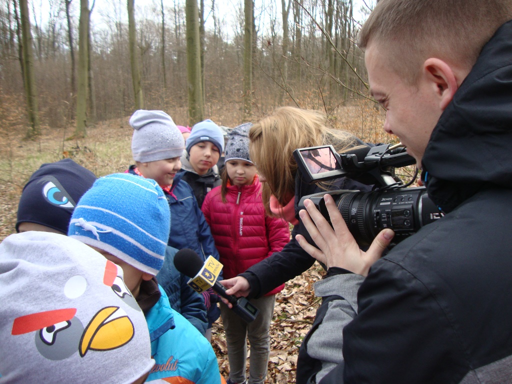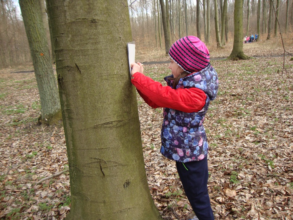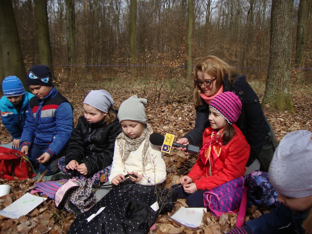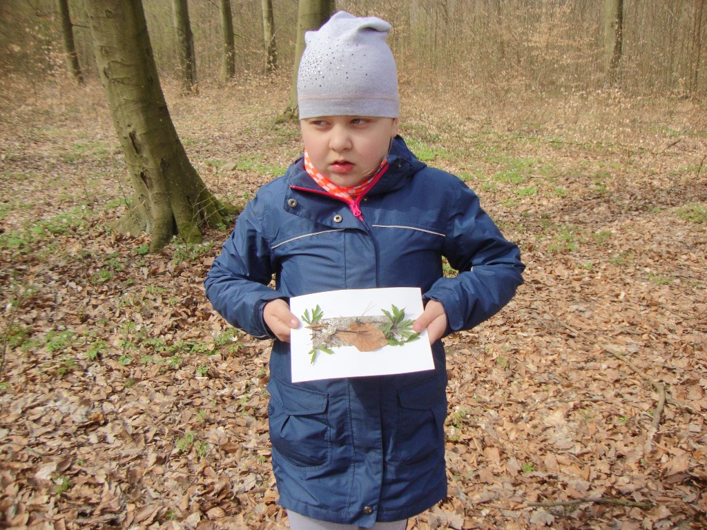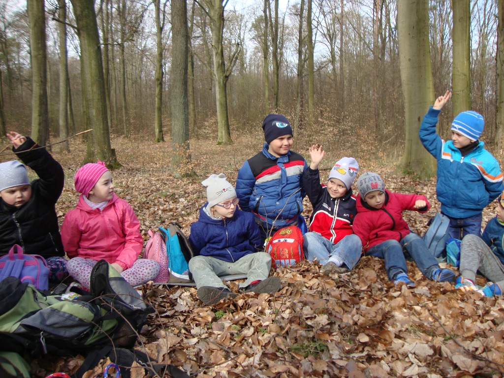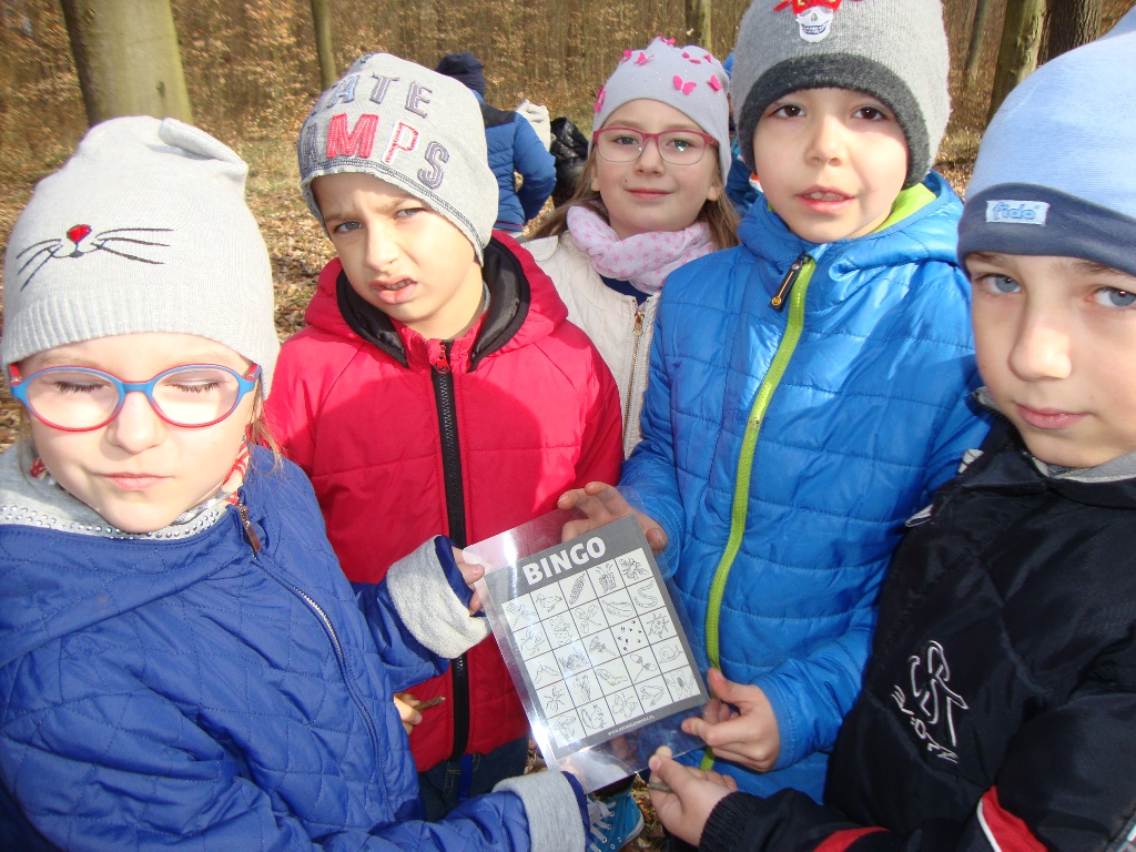17 kwietnia odbyły się kolejne zajęcia w rezerwacie przyrody Parowy Janinowskie dla uczniów klasy I. Na początku uczniowie zostali podzieleni na 4 grupy. Każda grupa dostała kartkę Bingo, a na niej różne obrazki przyrody. Zadaniem grupy było odnalezienie i zamalowanie pastelami tylko tych obrazków, które udało się zobaczyć np. biedronkę, motyla czy piórko. Kolejnym zadaniem było rozpoznawanie po dotyku dowolnego elementu przyrody ( szyszki, igły czy patyka) oraz zabawa w fotografowanie, czyli przyglądanie się wybranemu okazowi przyrody przez chwilę, a następnie z pamięci namalowanie go pastelami na kartonie. Dzieci malowały zawilce, biedronki, motyle czy też młode drzewka.