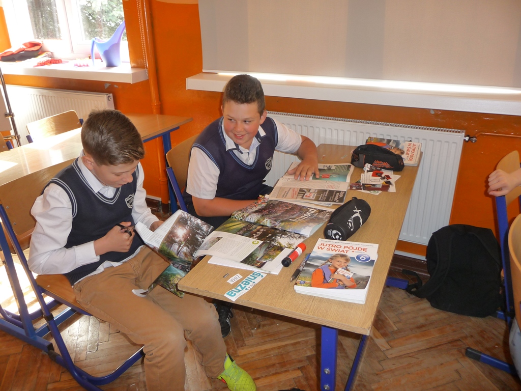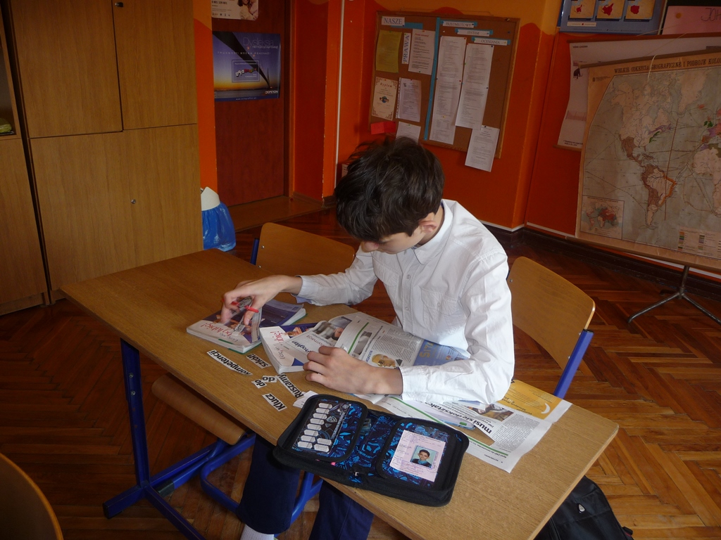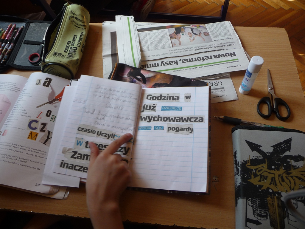 Lekcja języka polskiego w klasie VI. Uczniowie tworzą ,,okruchy" poetyckie korzystając z artykułów prasowych.