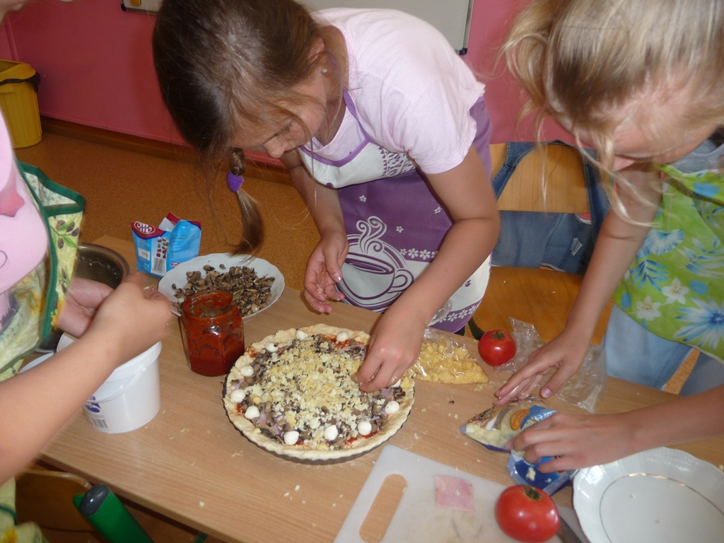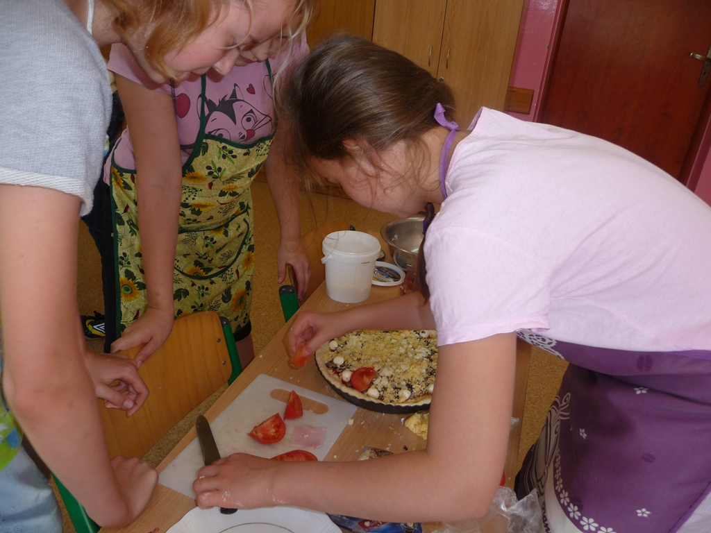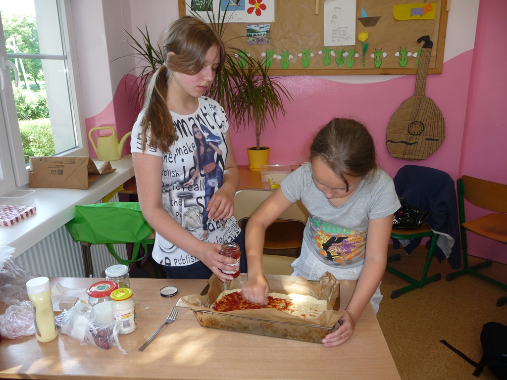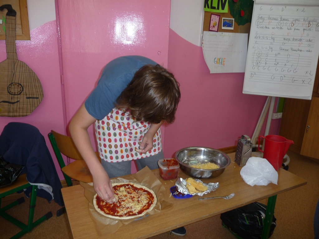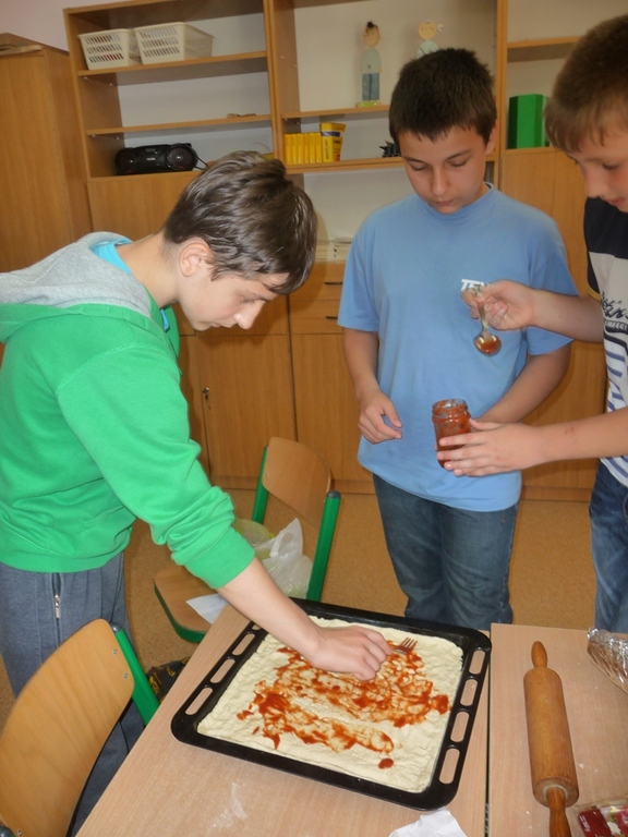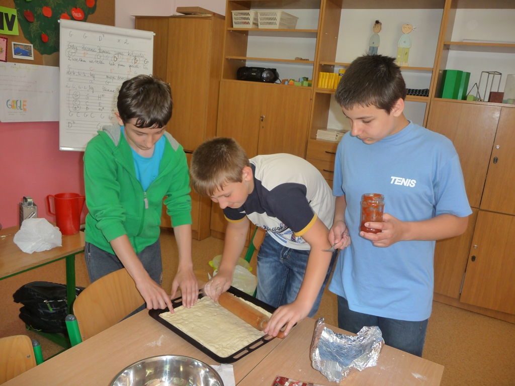 Zajęcia techniczne w klasie V. Najpierw wyrabianie ciasta, później układanie dodatków, pieczenie i ....wreszcie degustacja. PYSZNEEEEE!!!!