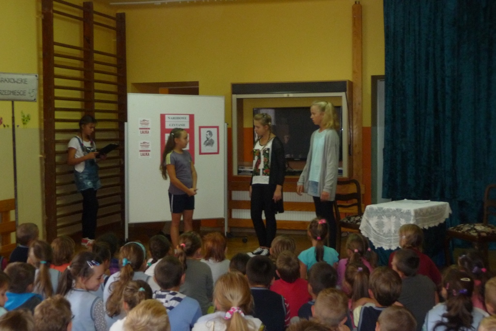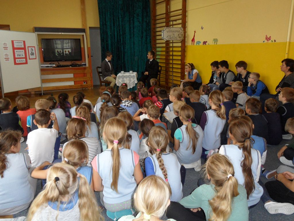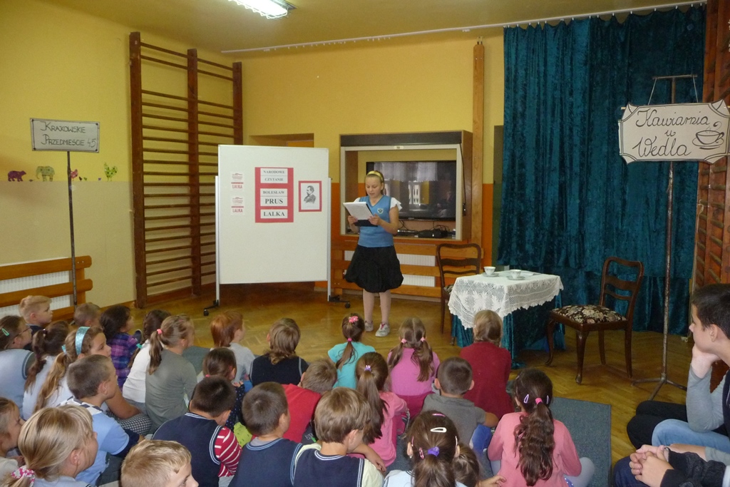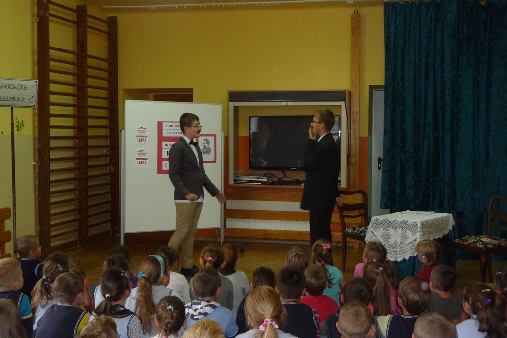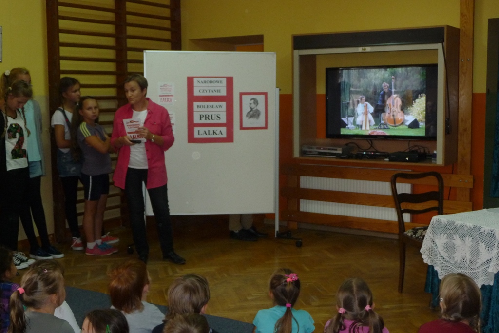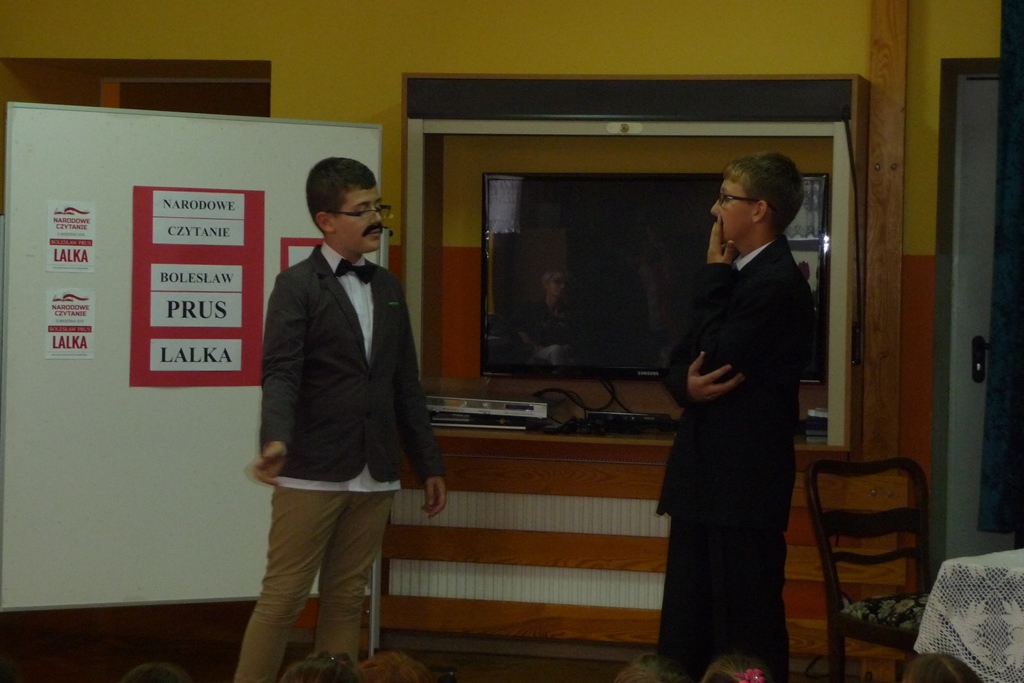 Po raz drugi włączyliśmy się do akcji Narodowego Czytania. To już czwarta edycja, której patronuje Prezydent RP. W bieżącym roku Polacy czytali ,,Lalkę” Bolesława Prusa, a czynili to w piękną, słoneczną pierwszą sobotę września. My zorganizowaliśmy zbiorowe czytanie nieco później, bo jedenastego września i ze względu na naszą nieznajomość problematyki ,,Lalki” i trudność w jej zrozumieniu, słuchaliśmy czytanej ,,Katarynki”. Najpierw wszyscy gromadnie zebraliśmy się w sali świetlicowej, by obejrzeć przygotowane przez uczniów klasy VI krótkie przedstawienie pt.,,Spotkanie H. Sienkiewicza z B. Prusem”. Scenka przypomniała nam kilka ważnych faktów z życia Patrona, ale przede wszystkim zapoznała nas z pisarzem Bolesławem Prusem i jego twórczością. Później podzieliliśmy się na dwie grupy. Klasy młodsze wzięły udział w zajęciach przygotowanych przez p. Walak, a klasy starsze przejęła p. Lipińska. Każda z grup, na dostępnym dla siebie poziomie, pracowała z tekstem noweli ,,Katarynka”.
