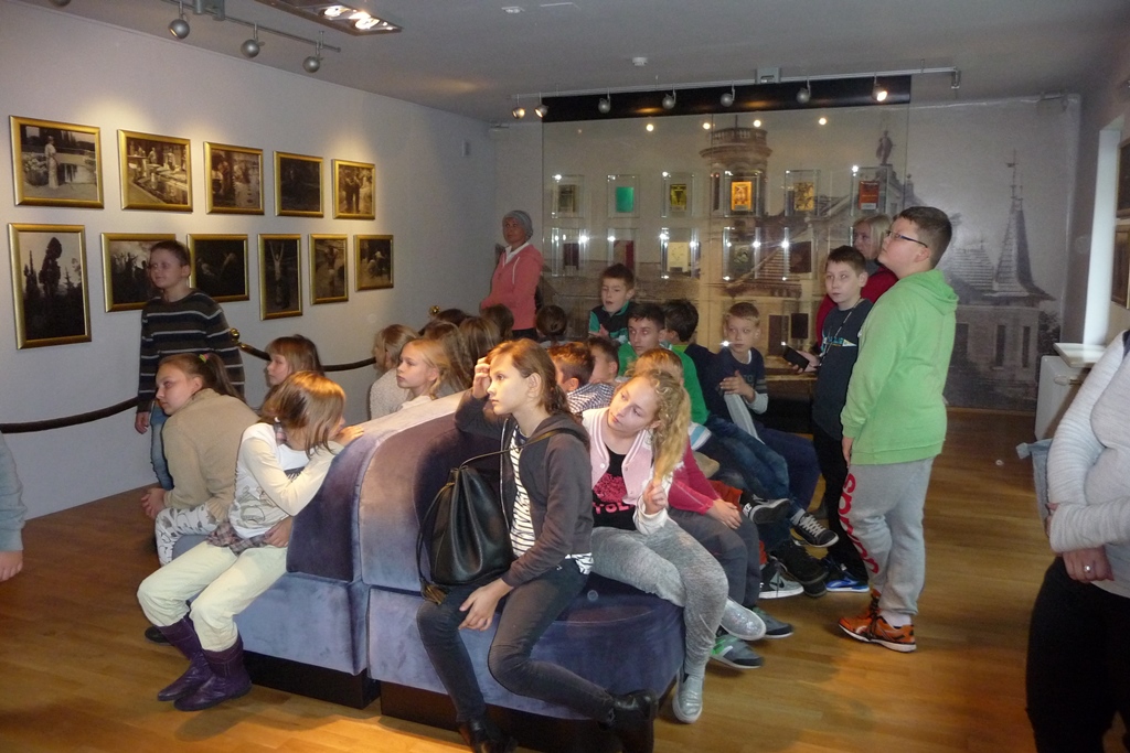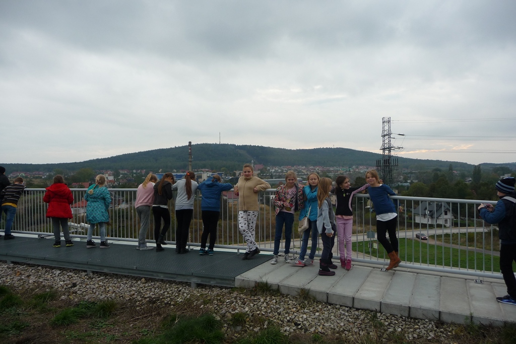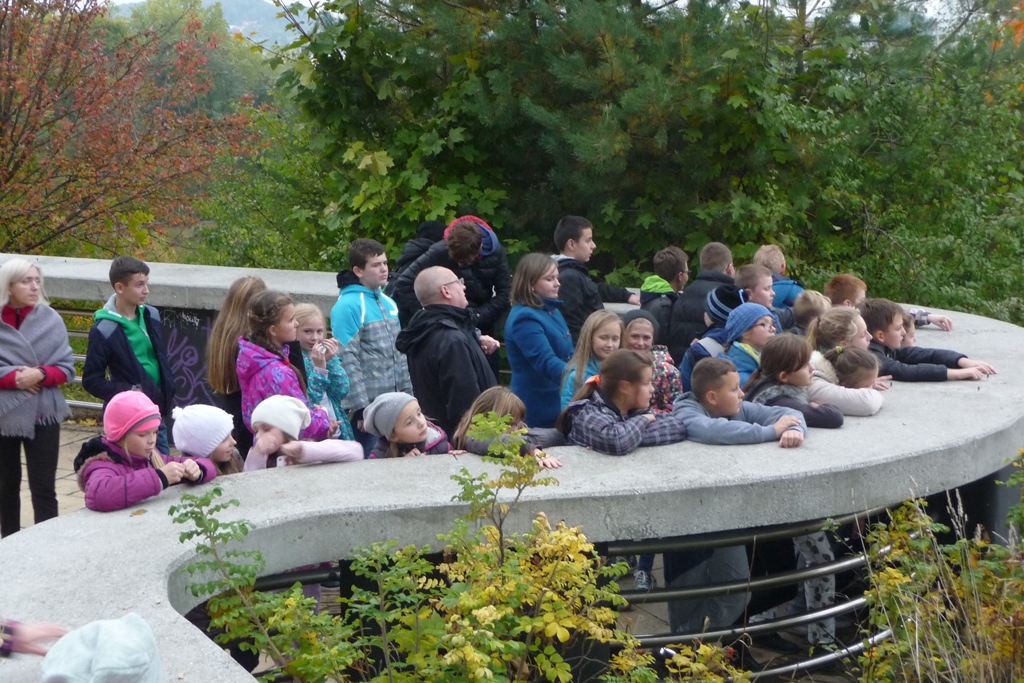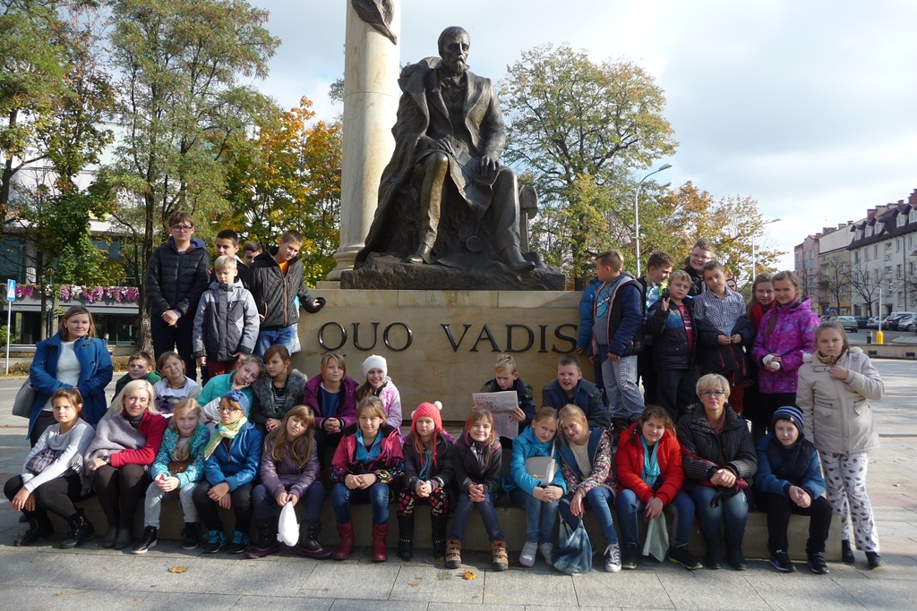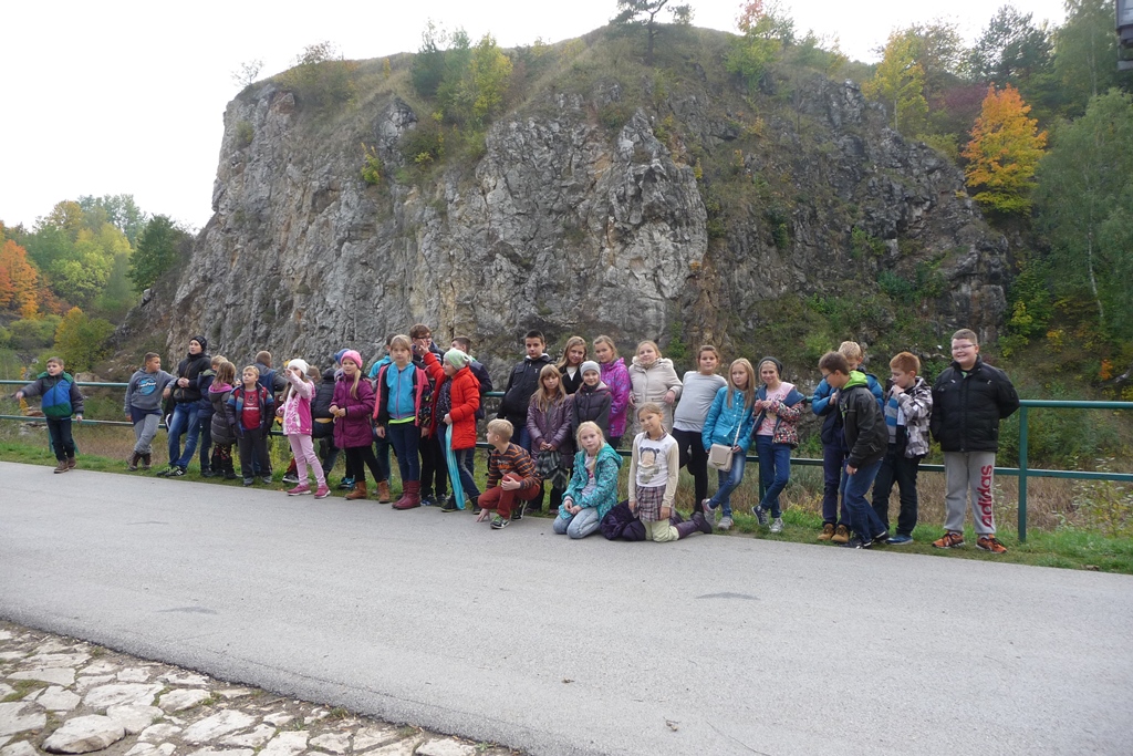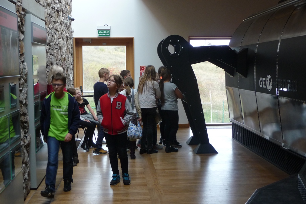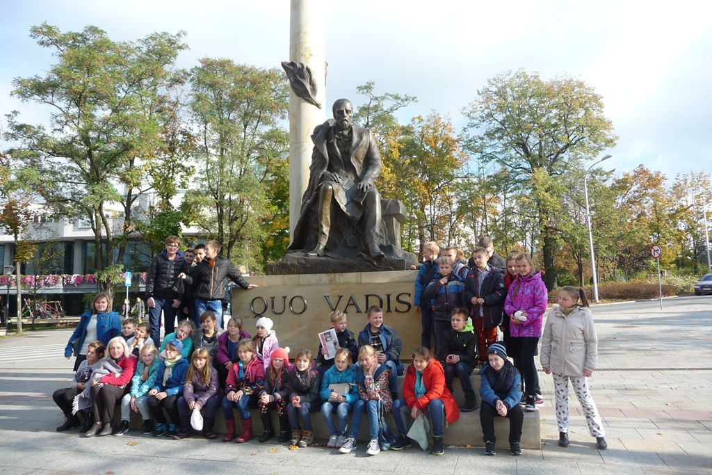 Trzeci tydzień października upłynął uczniom pod znakiem wycieczek. Rozpoczęli go wyjazdem do Spały, a zakończyli odwiedzinami Gór Świętokrzyskich. Na wycieczkę w świętokrzyskie wyruszyły dwie grupy autokarowe: starsza i młodsza. Każda z nich docelowo miała dojechać do Muzeum Henryka Sienkiewicza w Oblęgorku, ponieważ ta miejscowość to ważny element biografii Patrona Szkoły. Jej zwiedzanie przez uczniów to kolejny punkt realizacji projektu ,,Śladami Henryka Sienkiewicza”. Drugim wspólnym punktem wycieczkowego programu dla obu grup była wizyta w kieleckim rezerwacie przyrodniczym ,,Kadzielnia”. Widok dewońskich wapieni przykuwał uwagę zarówno maluchów jak i szóstoklasistów. Dla grupy młodszej przewidziano w programie jeszcze nieco inną atrakcję, przemawiającą do jej wyobraźni bardziej niż nieczynny kamieniołom, mianowicie odwiedziny w najstarszym i największym w kraju Muzeum Zabawek i Zabawy w Kielcach. Pobyt tutaj, to jak wyprawa w magiczne miejsce. W takim magicznym miejscu znaleźli się też starsi uczniowie odwiedzając kielecki Geopark, czyli Centrum Geoedukacji. Prawdziwej adrenaliny dostarczyła im tu ,,Podróż do wnętrza Ziemi” kapsułą 5D. Wszyscy przetrwali wyprawę bardzo dzielnie, więc wzięli udział w warsztatach szlifowania wapieni.