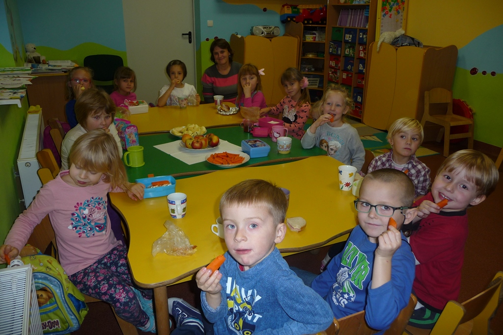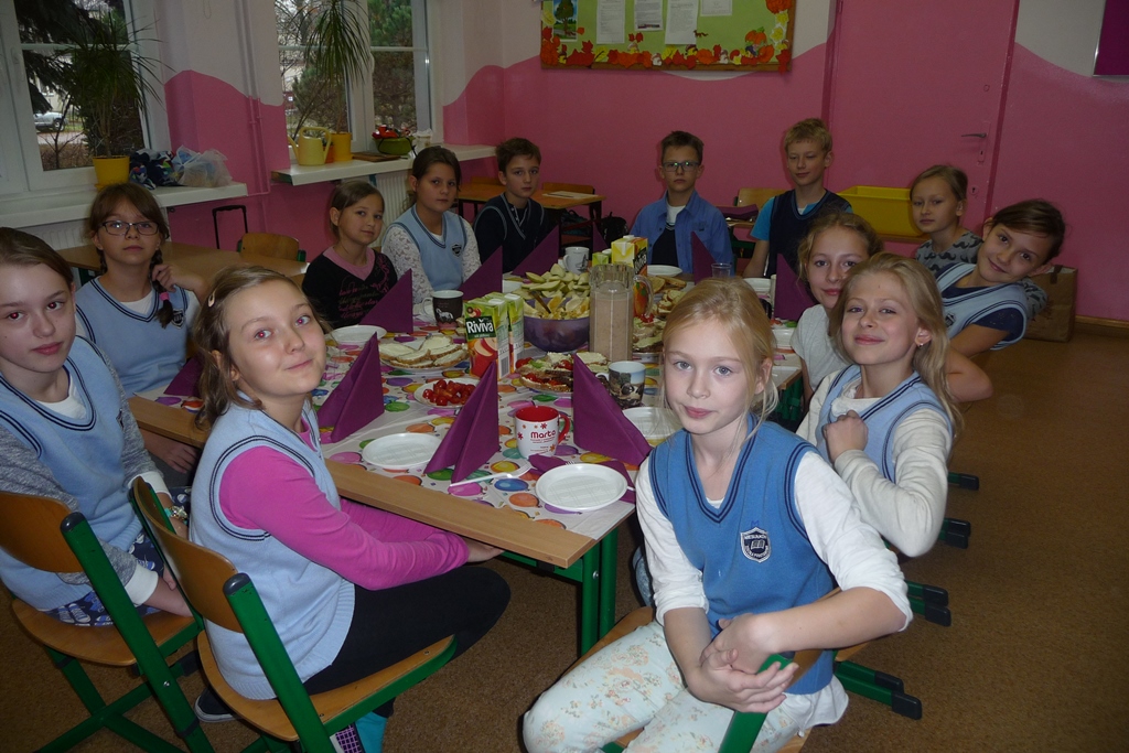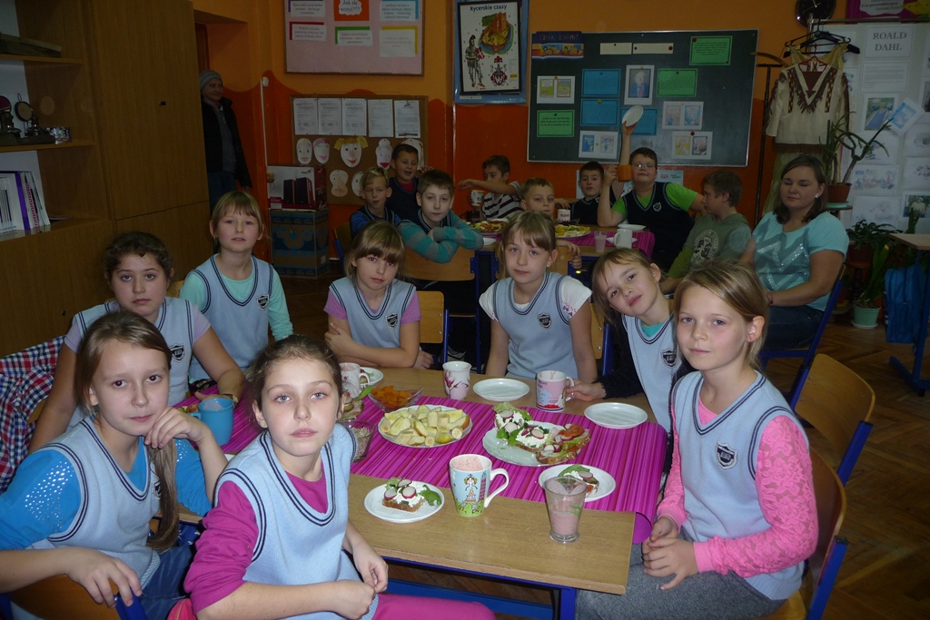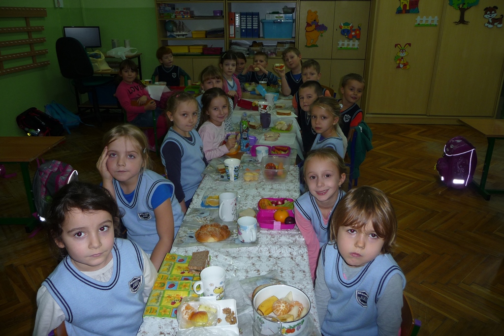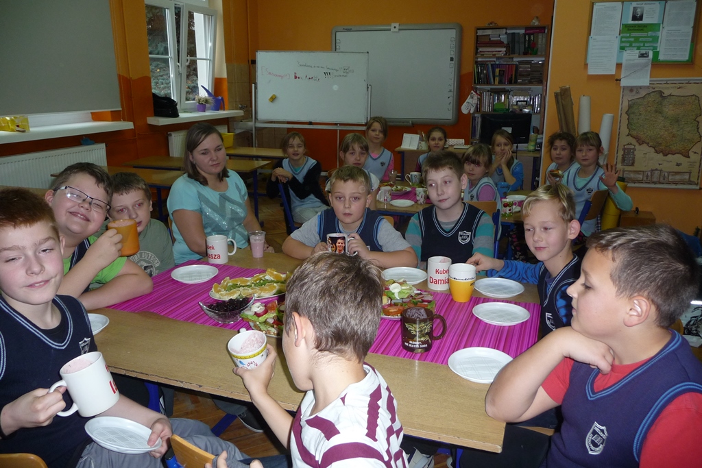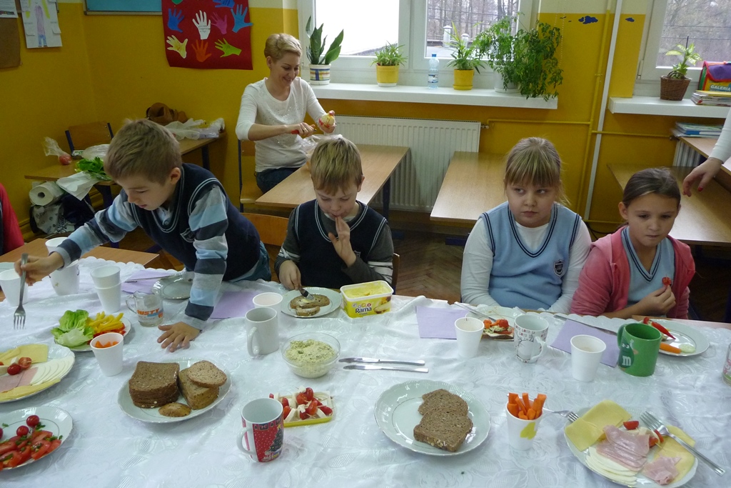 W poniedziałkowe przedpołudnie wszyscy uczniowie zjedli własnoręcznie przygotowane zdrowe śniadanie biorąc tym samym kolejny raz udział w akcji ,,Śniadanie daje moc”. Przy okazji przyrządzania smacznych i naszpikowanych witaminami sałatek, kanapek, soków, koktajli rozmawiali o ważnej roli porannego posiłku dla ich zdrowia i życia. Chrupiące warzywka i soczyste owoce znikały z talerzy w tempie błyskawicznym. Najmłodszym uczniom w przygotowaniu śniadania pomagały mamy, więc praca przebiegała sprawnie. Starsi uczniowie radzili sobie sami, ucząc się przy okazji zasad dobrej współpracy.