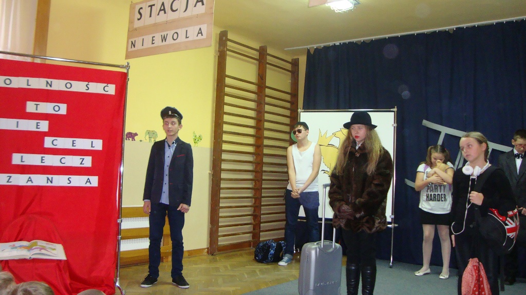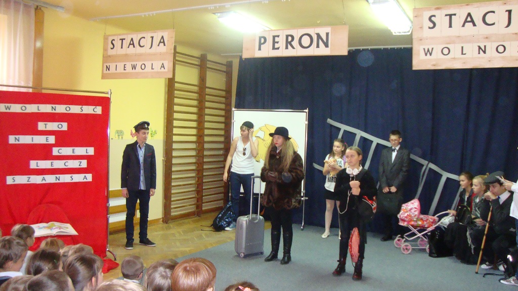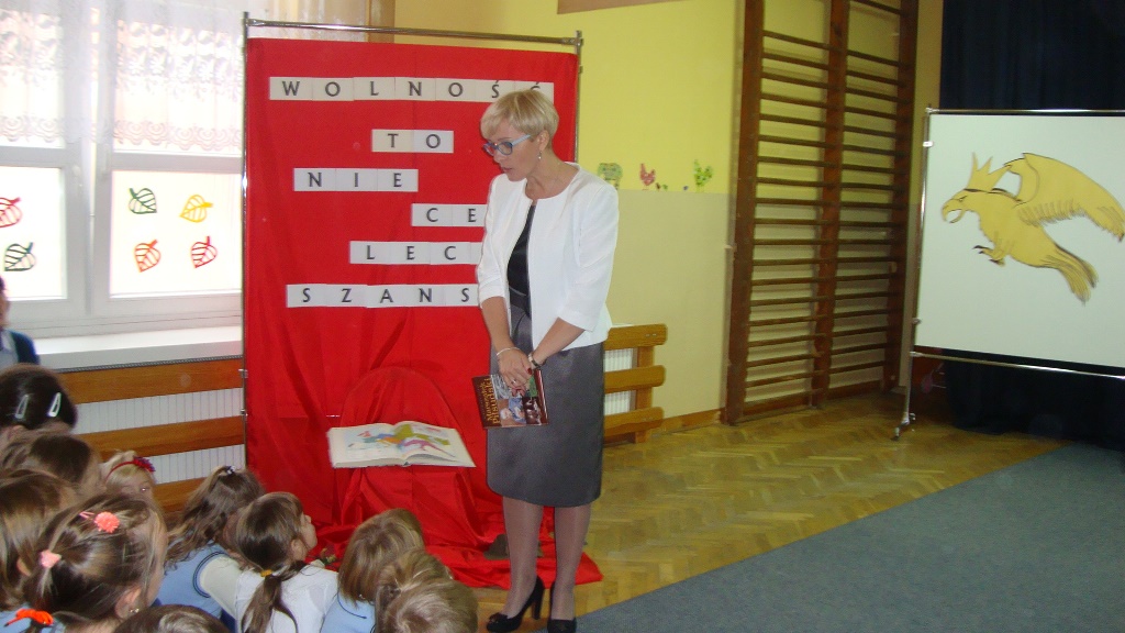 12 listopada wybraliśmy się w podróż do przeszłości. Świętując 97 Rocznicę Odzyskania przez Polskę Niepodległości wsiedliśmy do pociągu , który przewiózł nas przez 123 lata niewoli, jakiej doświadczała nasza Ojczyzna. W tej metaforycznej podróży naszymi przewodnikami byli uczniowie najstarszej klasy- szóstoklasiści. Recytując i śpiewając patriotyczne utwory przeprowadzili nas przez dzieje rozbiorów, powstań narodowych i pierwszą wojnę światową. W dużym uproszczeniu, ale rzeczowo pokazali nam klęski i sukcesy Polaków, ich walkę o wolność i radość z odzyskania jej. Ważnym elementem akademii było wspomnienie o Józefie Piłsudskim i zadanie związane z nim. Każdy uczeń otrzymał kolorowankę przedstawiającą tego Wielkiego Polaka , którą musiał pomalować zgodnie z oryginalnym wizerunkiem dostępnym w różnych źródłach informacji.