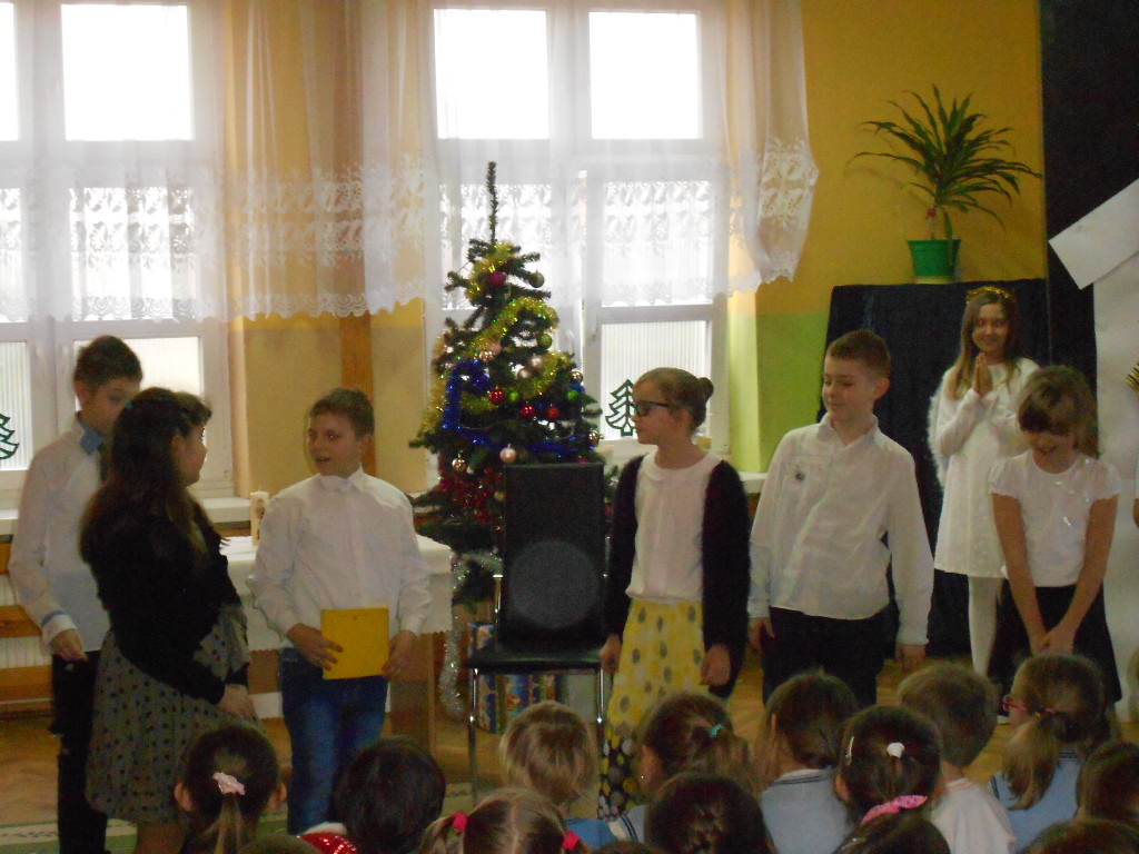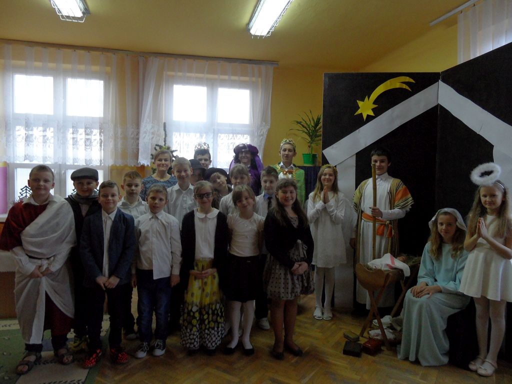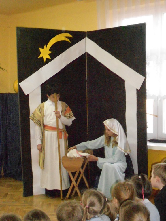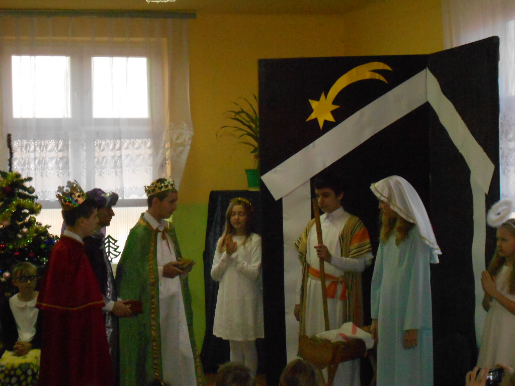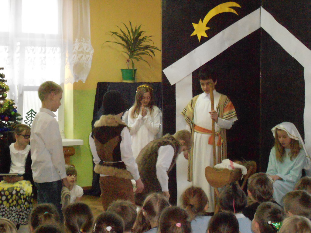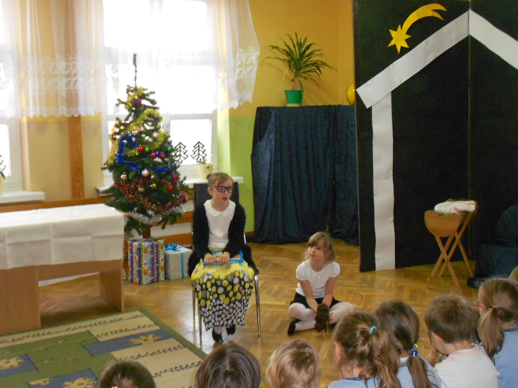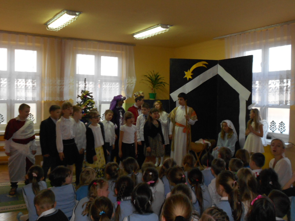 W przedświąteczny wtorek uczniowie kl. IV-VI pod opieką p. J. Walak opowiedzieli swoim młodszym kolegom piękną historię narodzin Jezusa Chrystusa. Zrobili to w formie miniatury teatralnej, której akcja rozgrywała się w dwóch przestrzeniach czasowych: współcześnie, w czasie wigilijnych przygotowań, w domu wielopokoleniowej polskiej rodziny i w retrospekcji - dokładanie 2015 lat temu w Betlejem. Łącznikiem pomiędzy dwoma odległymi światami była postać sympatycznej babci, która swoją barwną opowieścią pomogła wnukom poznać przyczyny obchodzenia Bożego Narodzenia. W trakcje zmieniających się planów inscenizacji publiczność poznawała rozmaite bożonarodzeniowe tradycje obecne od wieków w polskich domach np. nakrywanie do wigilijnej wieczerzy, strojenie choinki. Młodzi aktorzy bardzo wyraziście kreowali swoje role i dbając o szczegóły choreograficzne, scenograficzne i kostiumowe osiągnęli cel- spektakl bardzo spodobał się publiczności. Utrzymany w konwencji humorystycznej wzbudzał aplauz i wprowadzał widzów w dobry nastrój. Spotkanie uczniów na sali zakończyła p. Dyrektor składając wszystkim świąteczne życzenia.