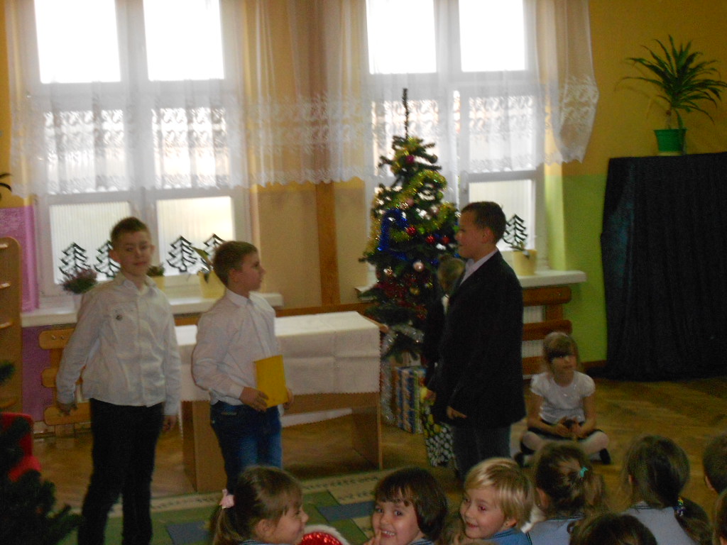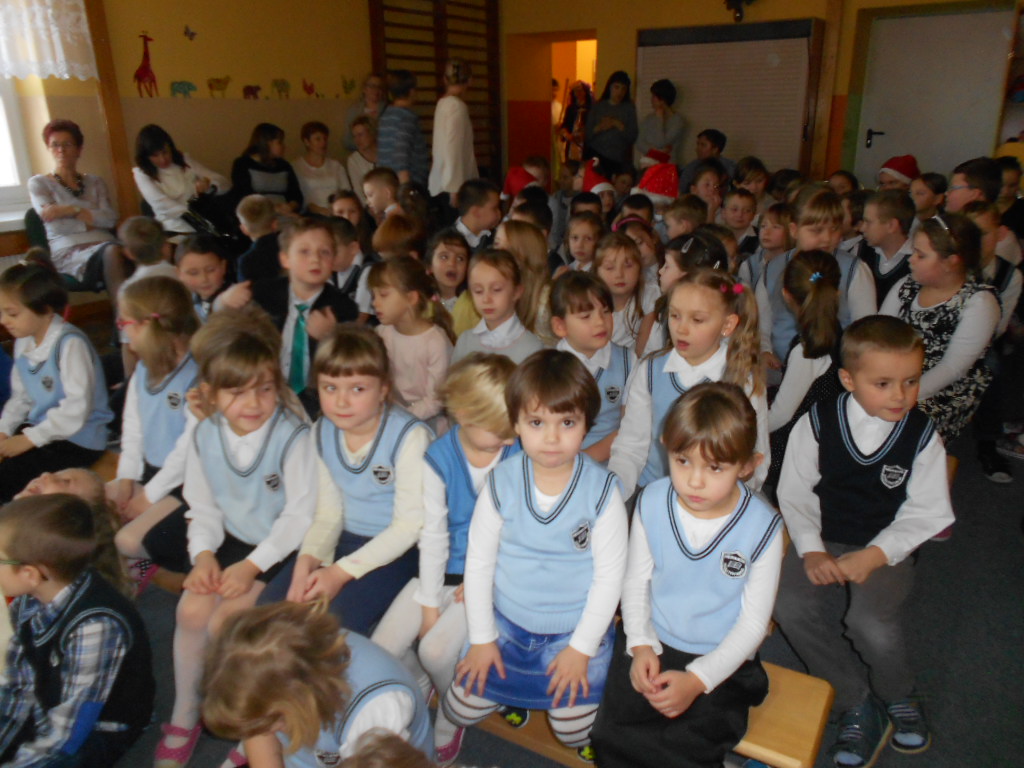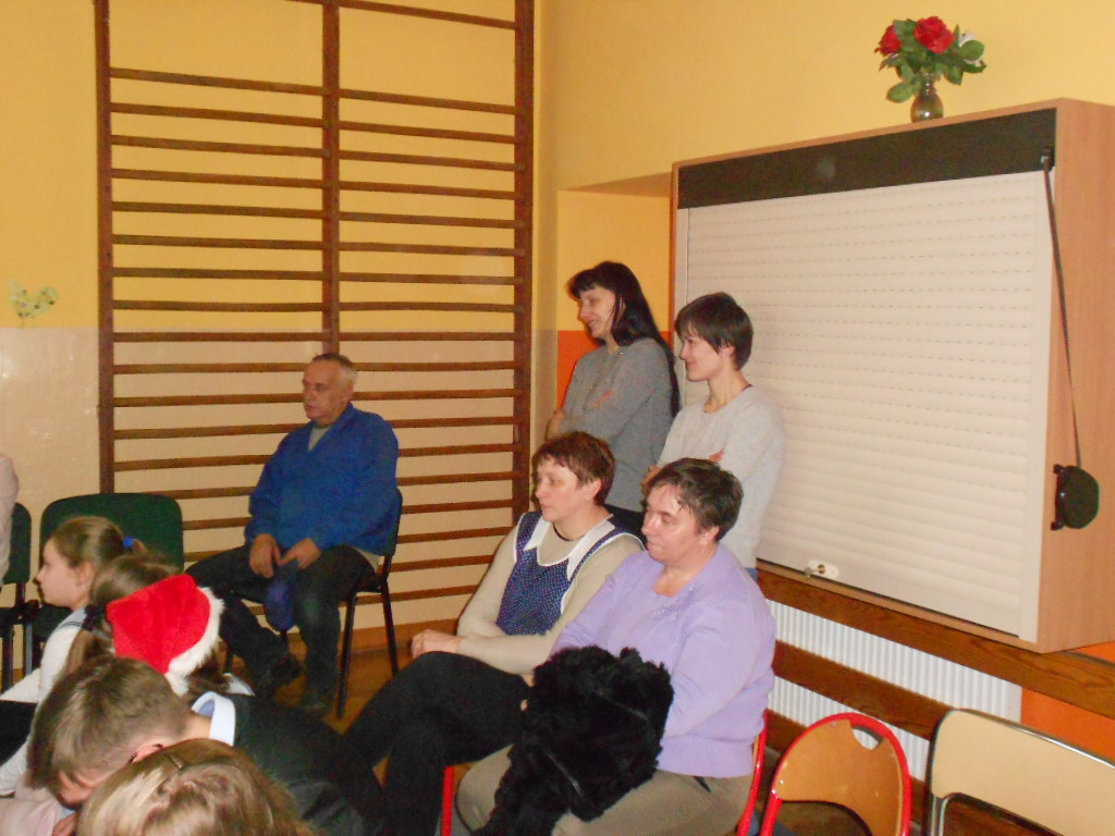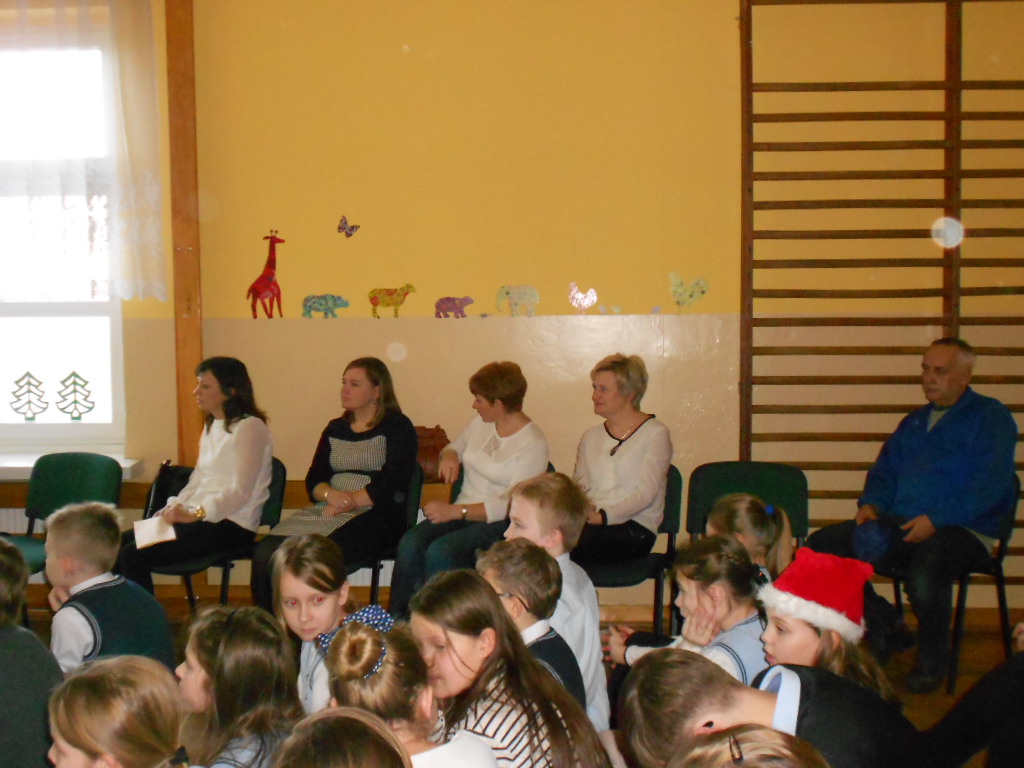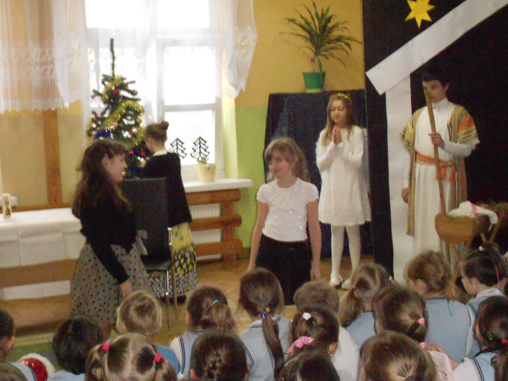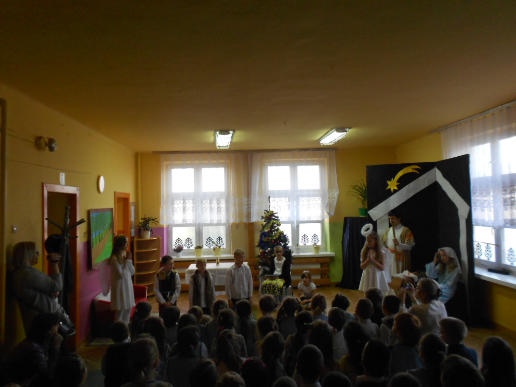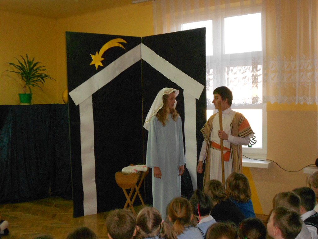 W przedświąteczny wtorek uczniowie kl. IV-VI pod opieką p. J. Walak opowiedzieli swoim młodszym kolegom piękną historię narodzin Jezusa Chrystusa. Zrobili to w formie miniatury teatralnej, której akcja rozgrywała się w dwóch przestrzeniach czasowych: współcześnie, w czasie wigilijnych przygotowań, w domu wielopokoleniowej polskiej rodziny i w retrospekcji - dokładanie 2015 lat temu w Betlejem. Łącznikiem pomiędzy dwoma odległymi światami była postać sympatycznej babci, która swoją barwną opowieścią pomogła wnukom poznać przyczyny obchodzenia Bożego Narodzenia. W trakcje zmieniających się planów inscenizacji publiczność poznawała rozmaite bożonarodzeniowe tradycje obecne od wieków w polskich domach np. nakrywanie do wigilijnej wieczerzy, strojenie choinki. Młodzi aktorzy bardzo wyraziście kreowali swoje role i dbając o szczegóły choreograficzne, scenograficzne i kostiumowe osiągnęli cel- spektakl bardzo spodobał się publiczności. Utrzymany w konwencji humorystycznej wzbudzał aplauz i wprowadzał widzów w dobry nastrój. Spotkanie uczniów na sali zakończyła p. Dyrektor składając wszystkim świąteczne życzenia.