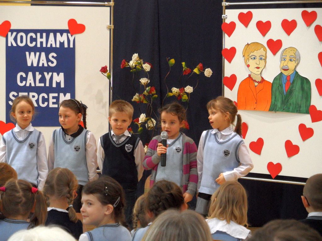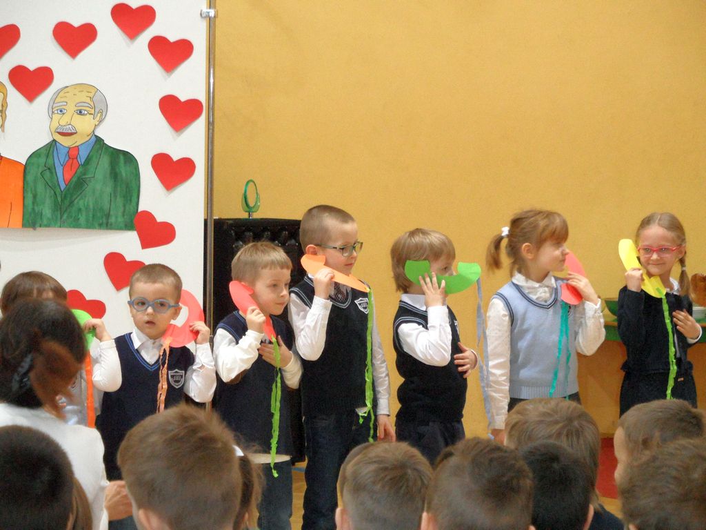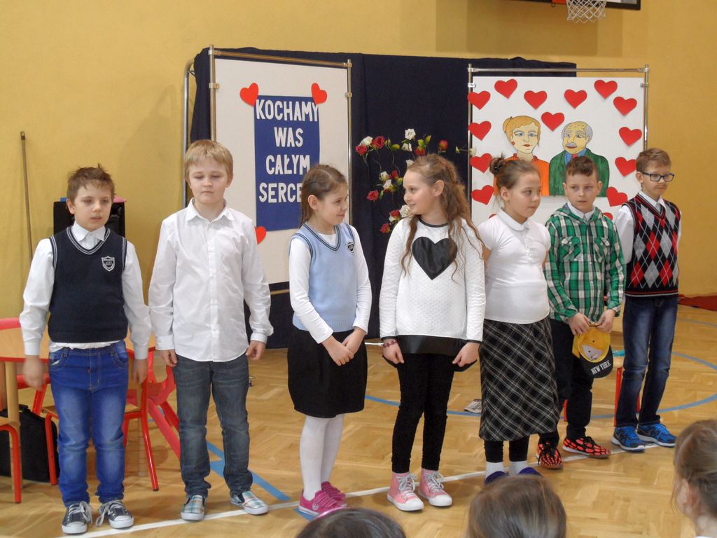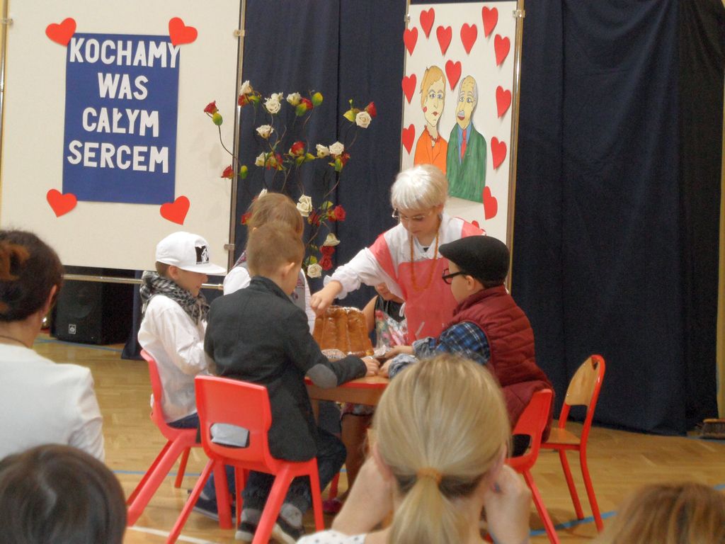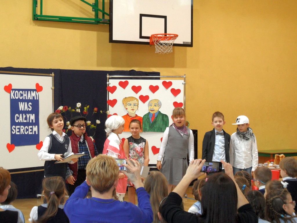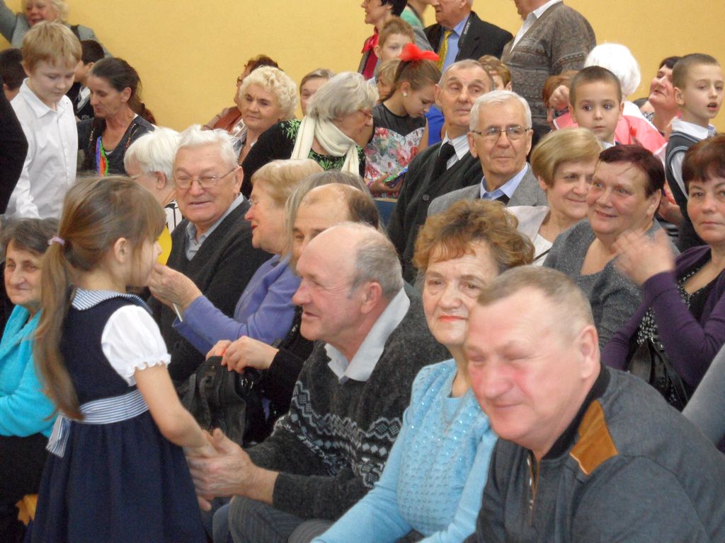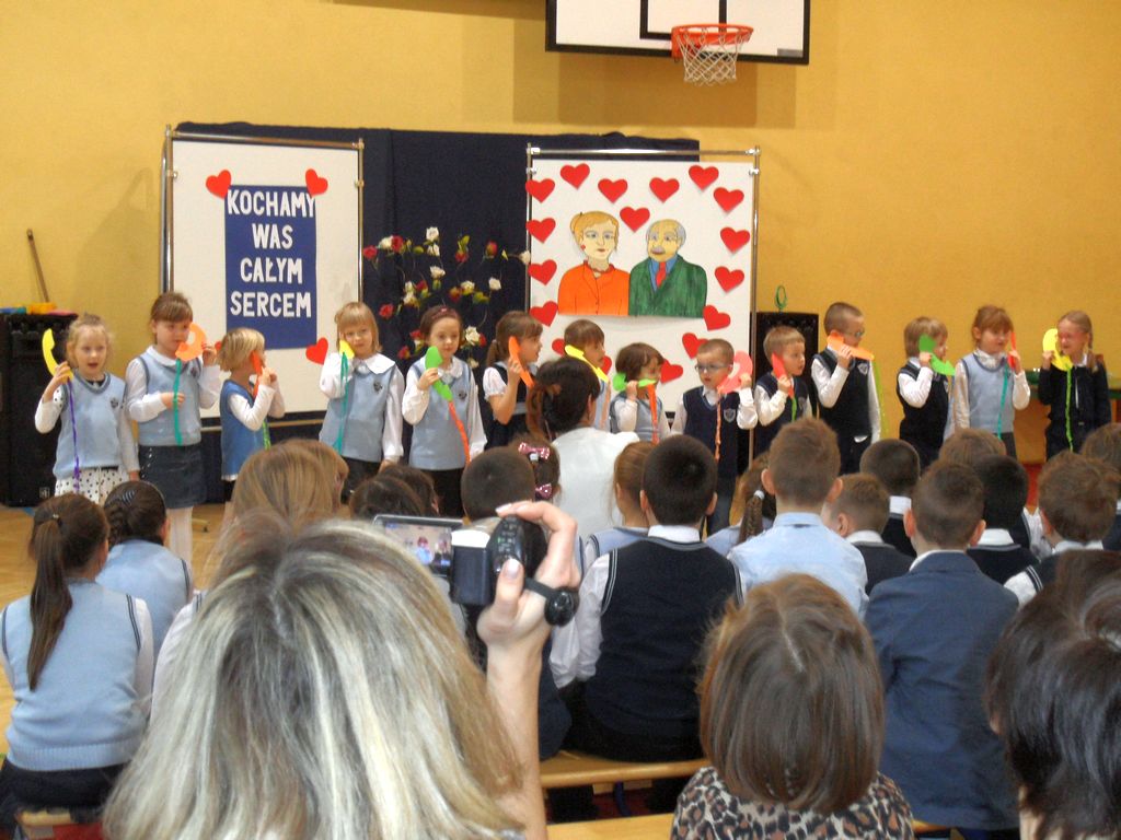 Zebranych seniorów i wszystkich gości gorąco powitała p. Dyrektor składając im serdeczne życzenia. W pięknie udekorowanej sali uczniowie przedstawili program artystyczny: wierszyki, piosenki, tańce oraz krótkie inscenizacje, które były wyrazem wdzięczności wobec kochanych Dziadków za ich oddanie, opiekę i cierpliwość oraz niezmierzone morze miłości, ciepła i troskliwości. Po hucznym odśpiewaniu „100 lat” dzieci wręczyły Dziadkom własnoręcznie przygotowane upominki. Na przybyłych gości czekał także słodki poczęstunek, który pomogli przygotować rodzice. W niejednym oku zakręciła się łza, a radosnej wymianie zdań nie było końca.
