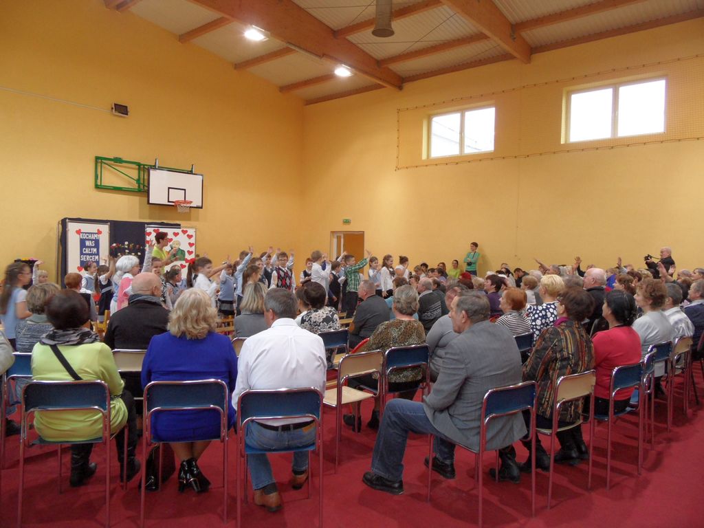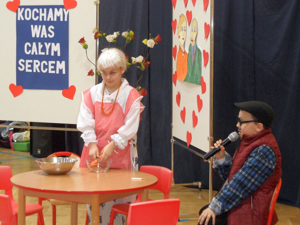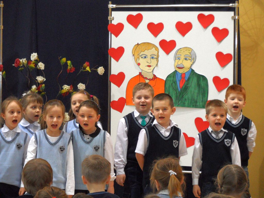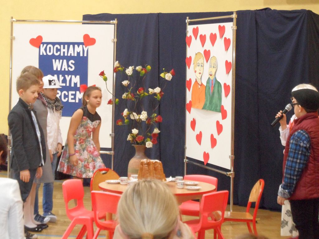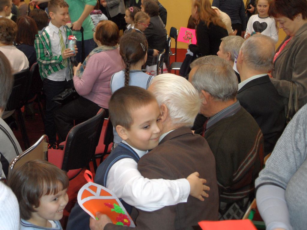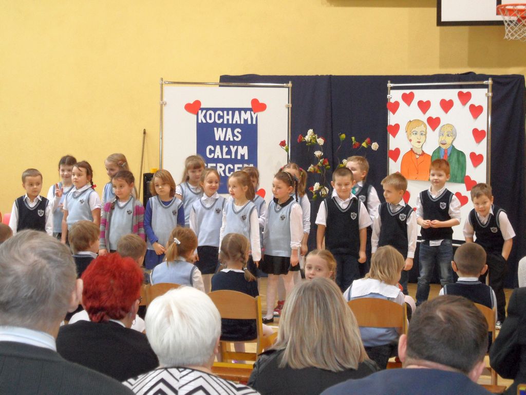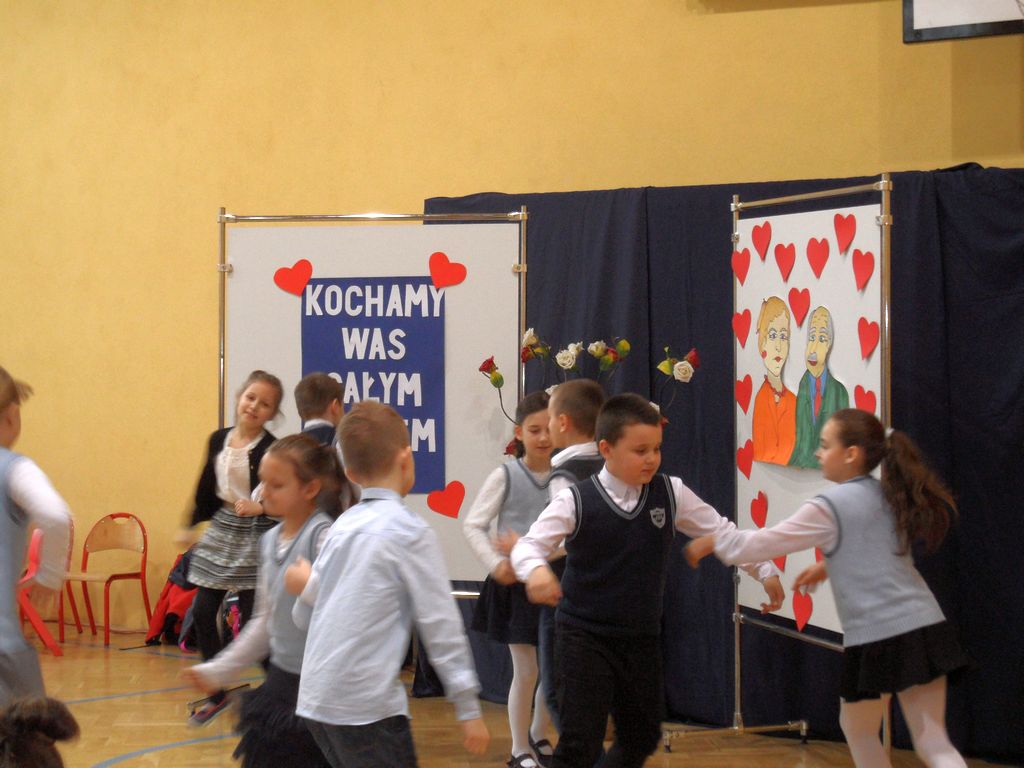 Zebranych seniorów i wszystkich gości gorąco powitała p. Dyrektor składając im serdeczne życzenia. W pięknie udekorowanej sali uczniowie przedstawili program artystyczny: wierszyki, piosenki, tańce oraz krótkie inscenizacje, które były wyrazem wdzięczności wobec kochanych Dziadków za ich oddanie, opiekę i cierpliwość oraz niezmierzone morze miłości, ciepła i troskliwości. Po hucznym odśpiewaniu „100 lat” dzieci wręczyły Dziadkom własnoręcznie przygotowane upominki. Na przybyłych gości czekał także słodki poczęstunek, który pomogli przygotować rodzice. W niejednym oku zakręciła się łza, a radosnej wymianie zdań nie było końca.