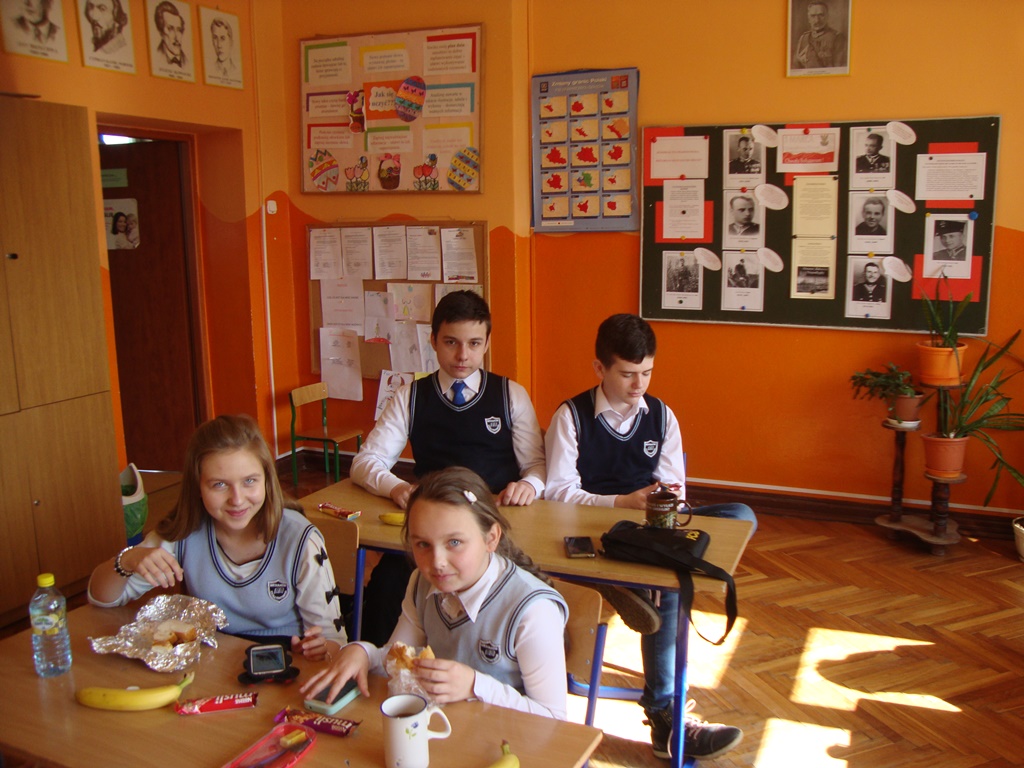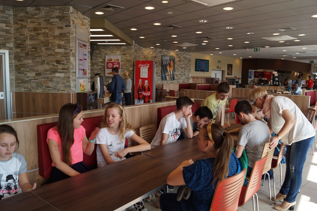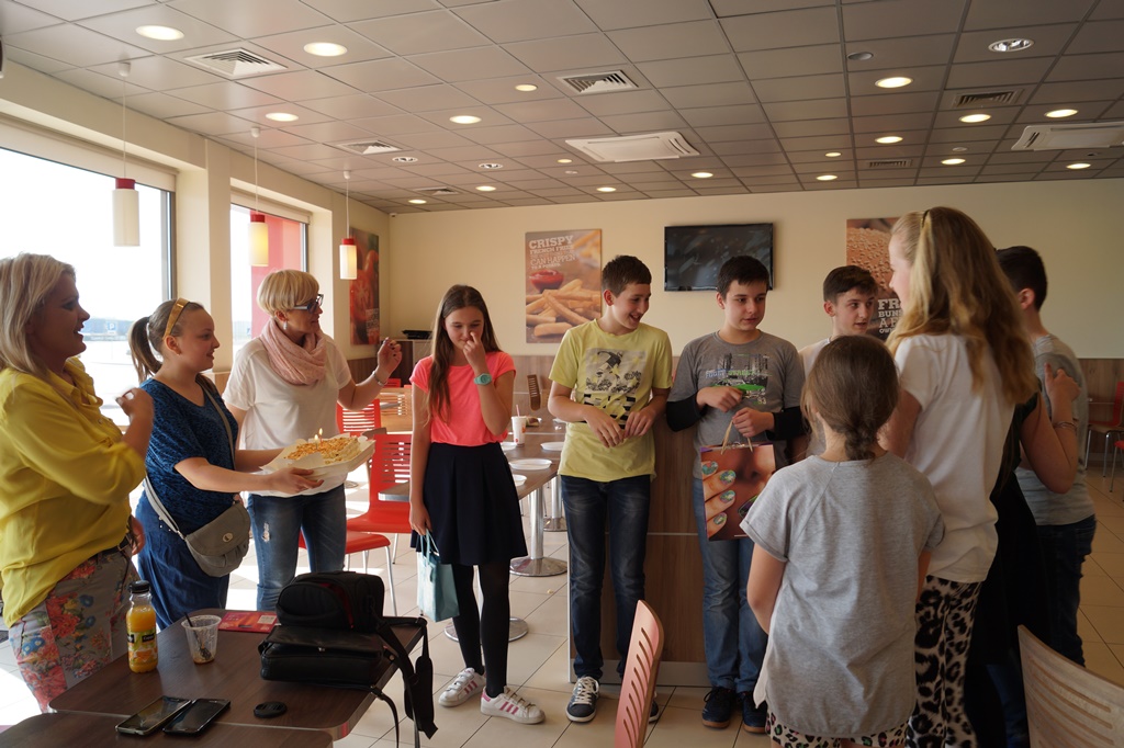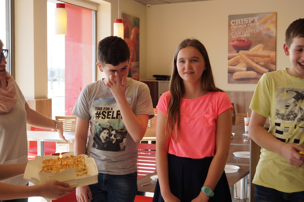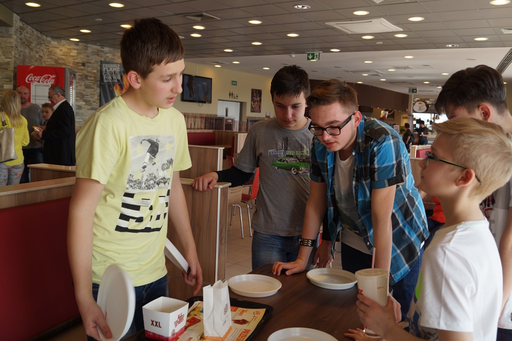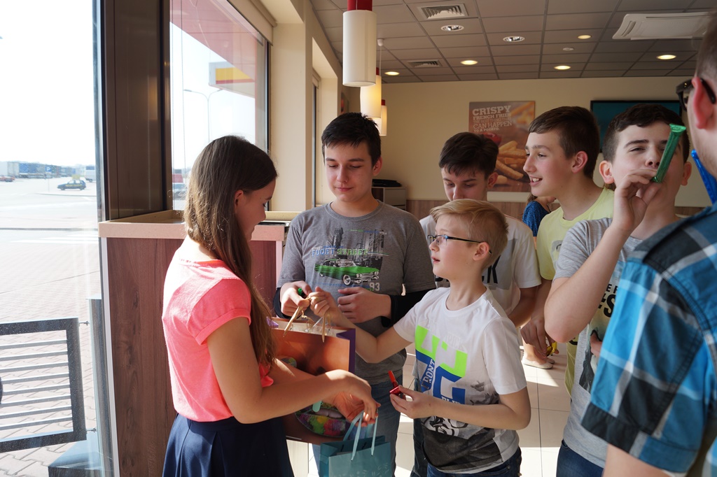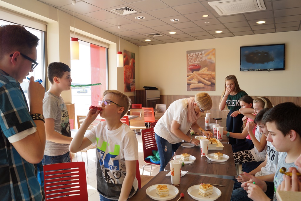 Po sprawdzianie emocje nie opadły, ponieważ w tym dniu uczniowie klasy szóstej w konsultacji z wychowawcą, postanowili przygotować niespodziankę dla dwojga kwietniowych jubilatów : Zofii i Kamila. Na miejsce realizacji pomysłu wybrali miejscowego Burger Kinga. Dowiezieni tu przez rodziców, spędzili w swoim towarzystwie dwie przyjemne godziny. Oczywiście był tort, lody i prezenty. Pomimo niełatwego przedpołudnia, humory wszystkim dopisywały, zwłaszcza podczas urodzinowych kalamburów.
