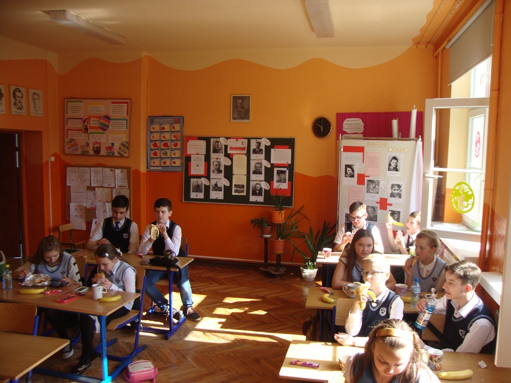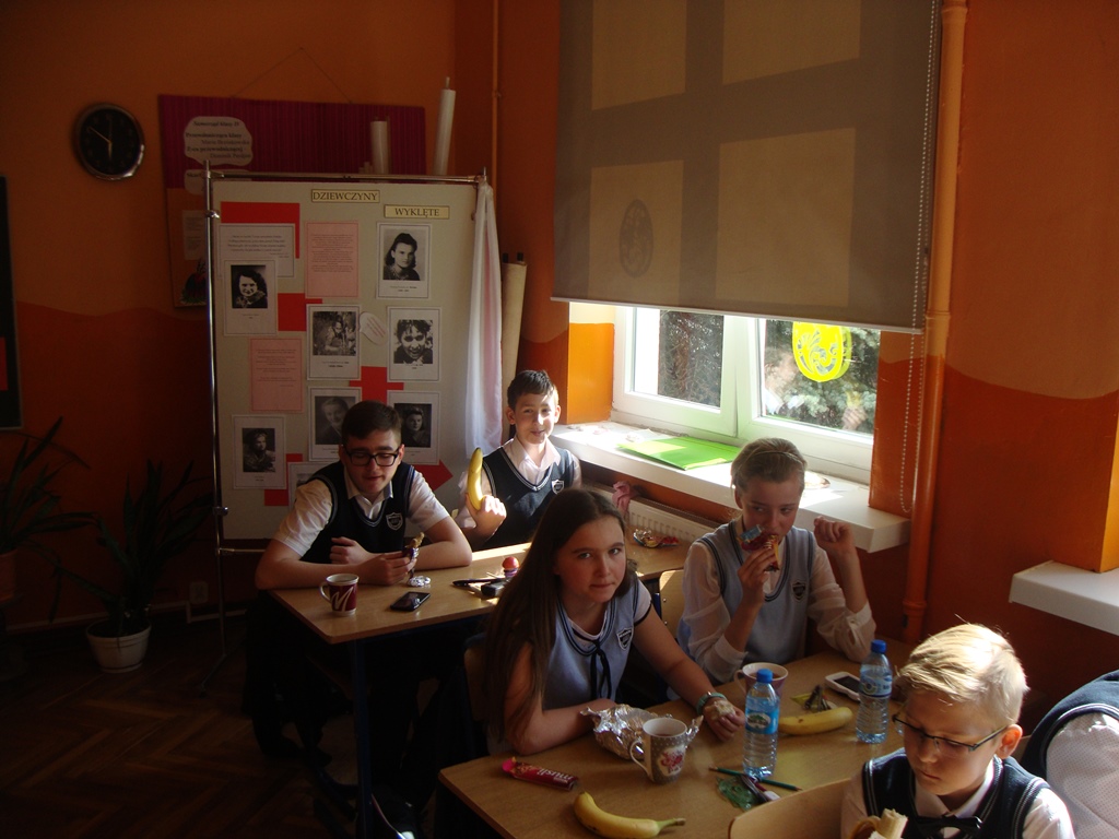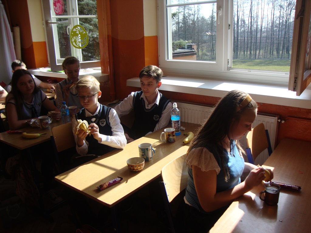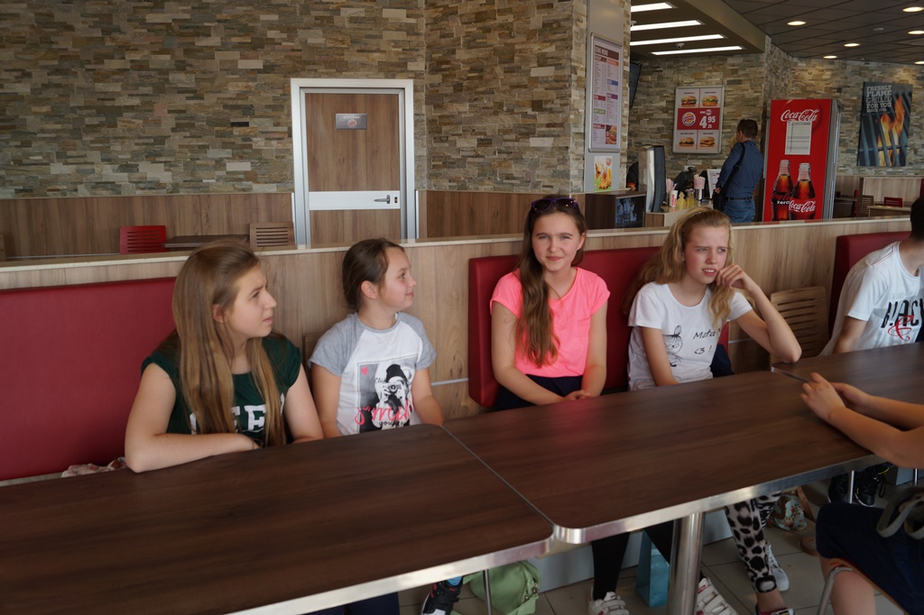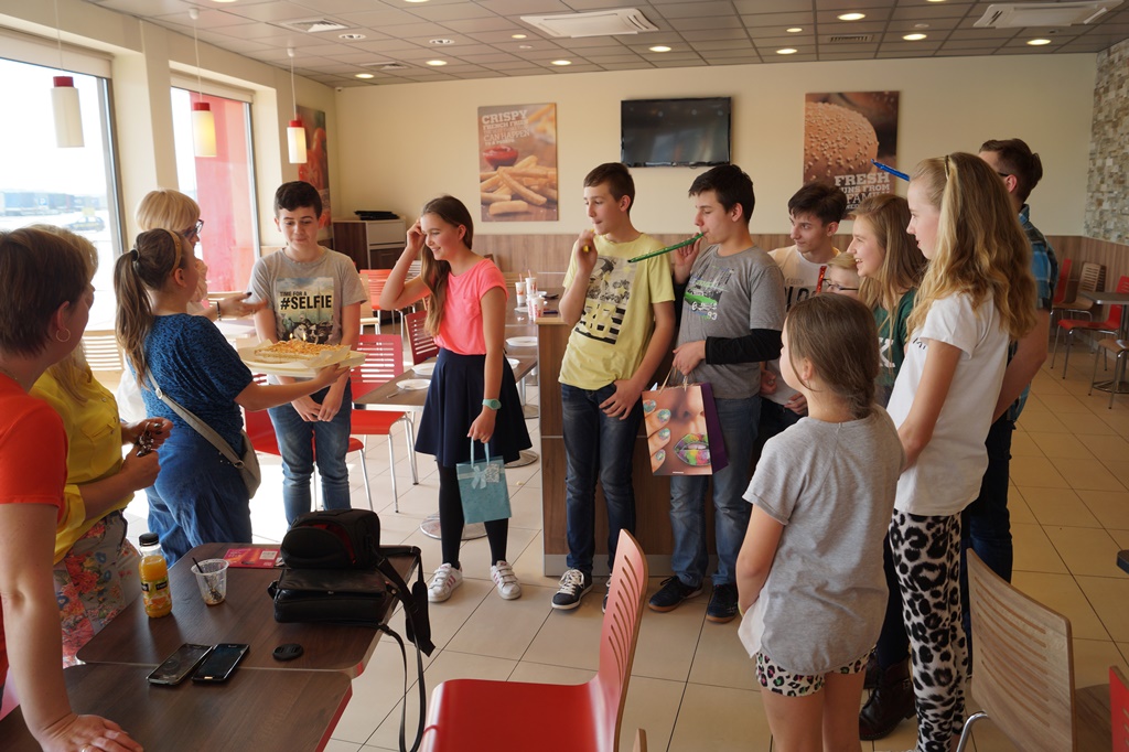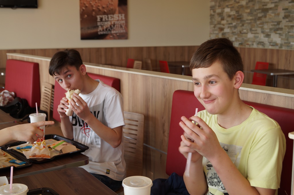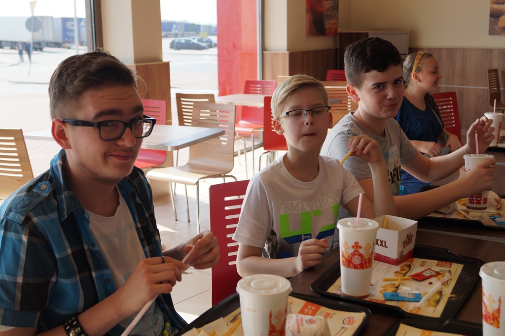 Po sprawdzianie emocje nie opadły, ponieważ w tym dniu uczniowie klasy szóstej w konsultacji z wychowawcą, postanowili przygotować niespodziankę dla dwojga kwietniowych jubilatów : Zofii i Kamila. Na miejsce realizacji pomysłu wybrali miejscowego Burger Kinga. Dowiezieni tu przez rodziców, spędzili w swoim towarzystwie dwie przyjemne godziny. Oczywiście był tort, lody i prezenty. Pomimo niełatwego przedpołudnia, humory wszystkim dopisywały, zwłaszcza podczas urodzinowych kalamburów.