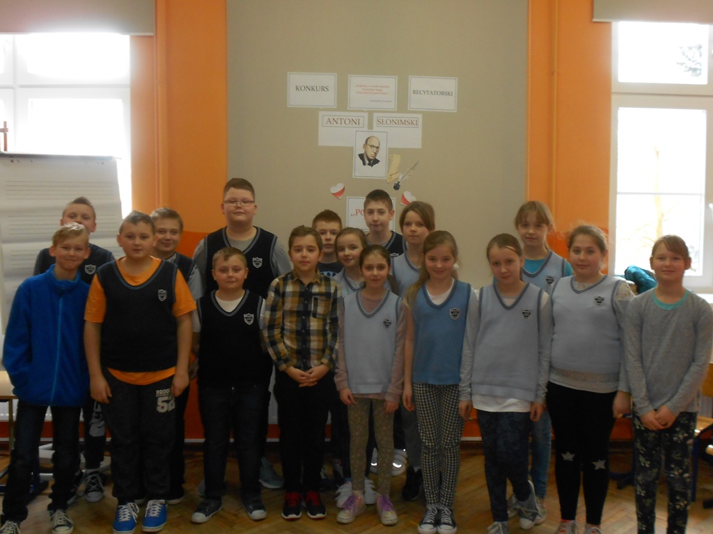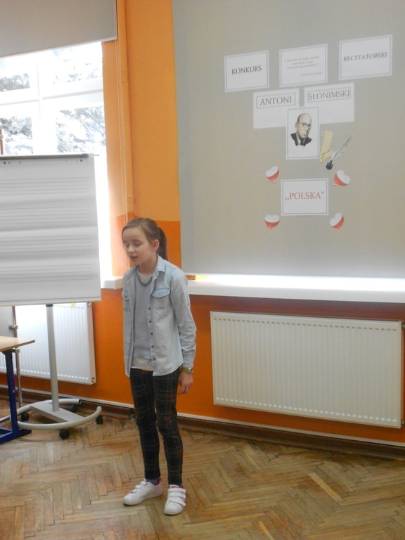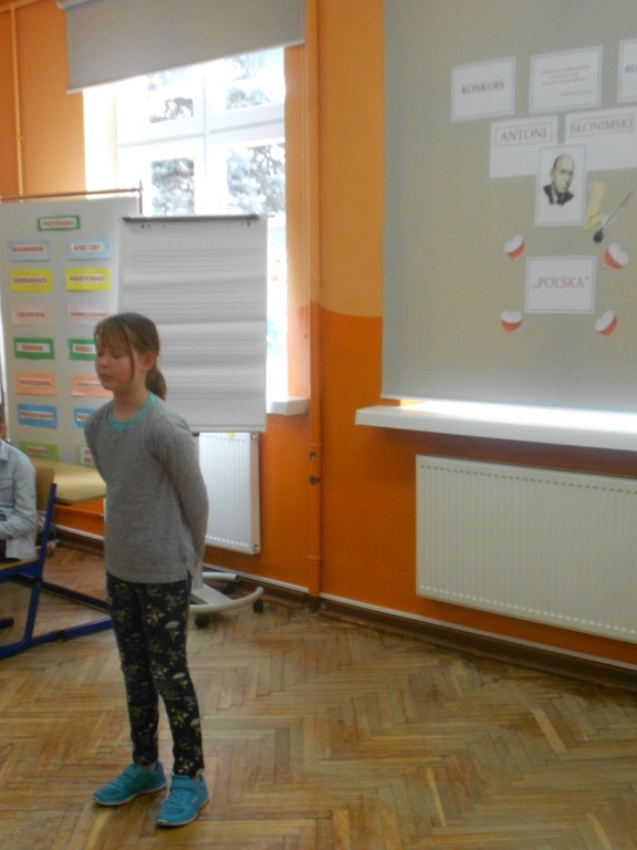 8 lutego lekcja języka polskiego w klasie V poświęcona recytacji wiersza A. Słonimskiego pt. ,,Polska" miała formę konkursu klasowego. Specjalnymi gośćmi były : p. Dyrektor i wychowawczyni kl. V, które podjęły się oceny uczniowskich prezentacji. Zarówno obecność pań jak i nietypowa oprawa i formuła lekcji podniosły u uczniów poziom adrenaliny. Dlatego też niektórych przed występem zjadała trema. Patriotyczny charakter utworu determinował jego głosową interpretację i postawę recytatorów. Niełatwo było wyrazić emocje i wpłynąć, by słuchacze poczuli to samo. A jednak się udało! Tym, który zrobił to perfekcyjnie był Adrian Opalski. Swoją piękną recytacją poruszył jury, dlatego przyznało mu I miejsce. Adrian jako zwycięzca otrzymał dyplom, ocenę celującą z języka polskiego i nagrodę- możliwość zgłoszenia piątego nieprzygotowania do lekcji w II półroczu. Tuż za Adrianem uplasowała się Zuzia Szymańska, a wyróżnienia otrzymały: Marysia Brzóskowska, Zuzia Bukowska, Zosia Kowalska i Lidzia Klotz.