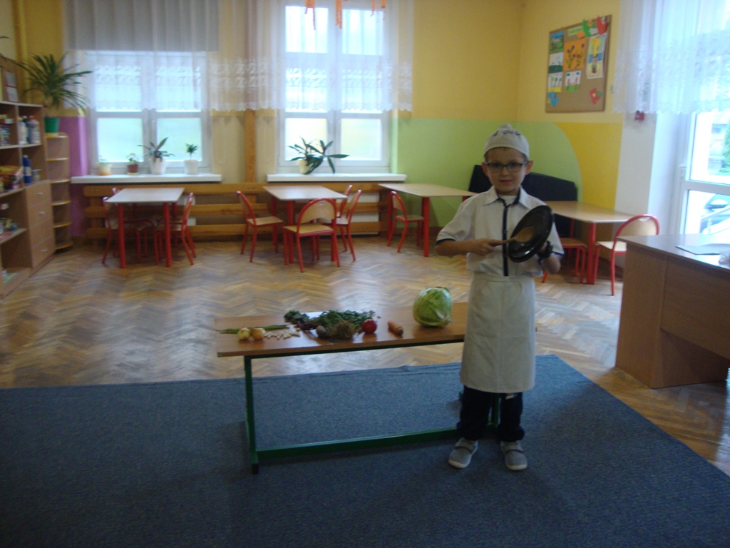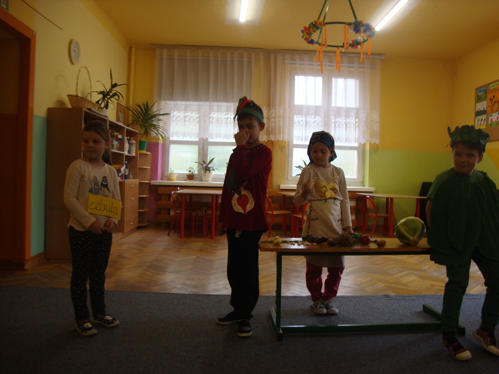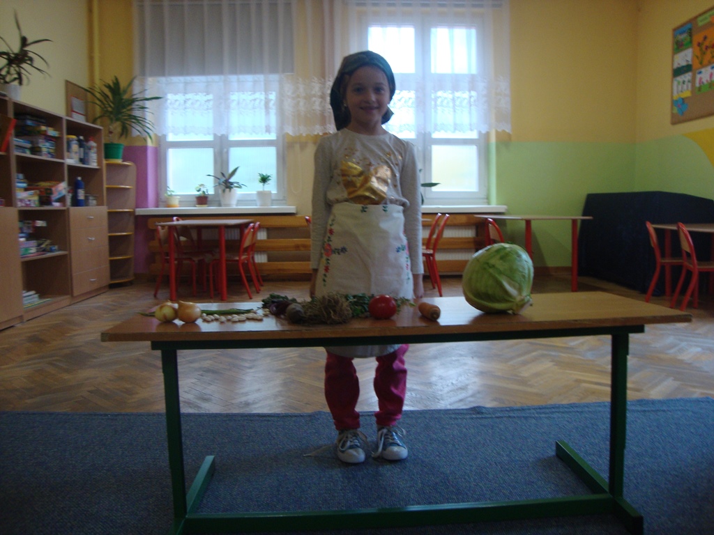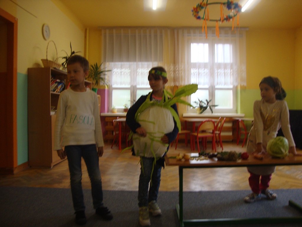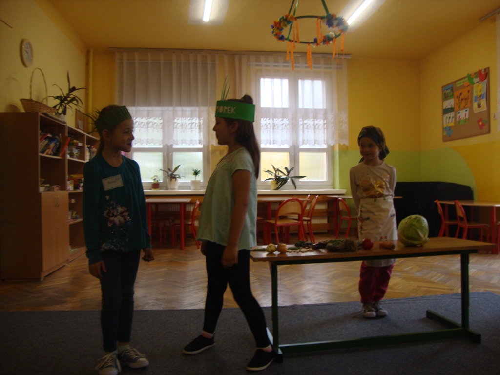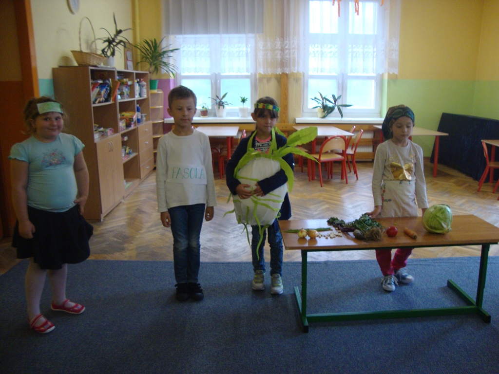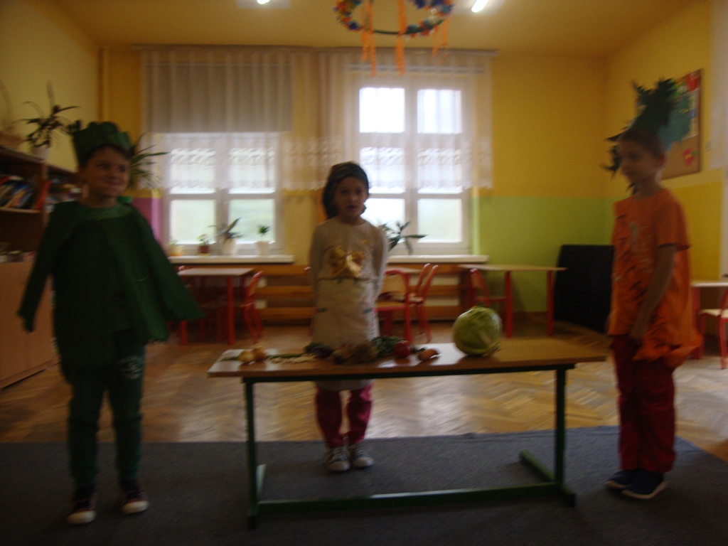 We wtorek 3 października uczniowie klasy I rozmawiali na temat darów jesieni i o tym , jak zachować na długo lato, które już odeszło. Następnie wystawili inscenizację wiersza J. Brzechwy ,, Na straganie ” . Pierwszoklasiści odgrywali role warzyw. Był też kucharz i straganiarka.
