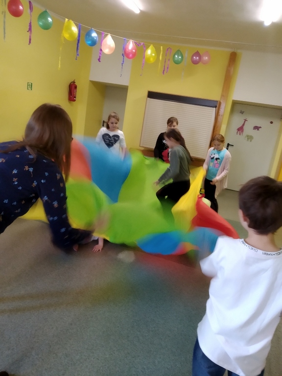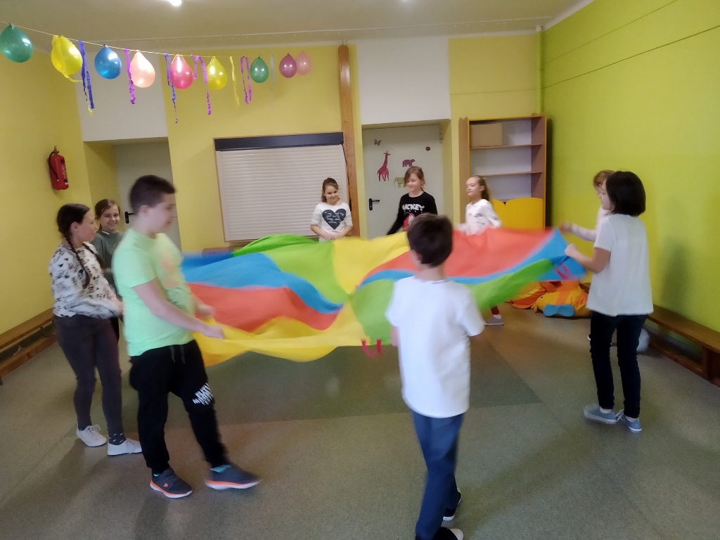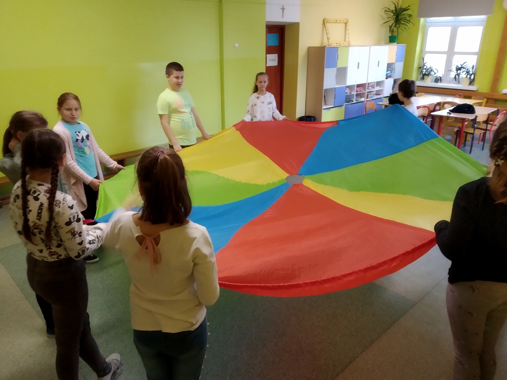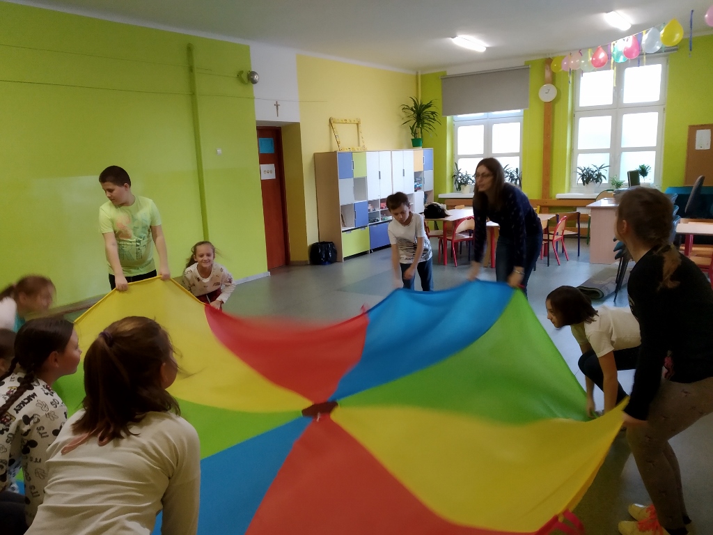 Podczas jednych z zajęć uczniowie uczestniczyli w zabawach z wykorzystaniem chusty animacyjnej. Dzięki różnym ćwiczeniom uczestnicy mogli doskonalić umiejętności komunikacyjne, umiejętność współpracy czy zgodnej zabawy. Podczas zabaw uczniowie mogli również niwelować napięcie psychofizyczne oraz kształtować poczucie rytmu. Zastosowane ćwiczenia cieszyły się dużym zainteresowaniem ze strony uczniów oraz wzbudziły w nich wiele przyjemnych emocji. Uczestnicy byli w radosnych nastrojach, a przez całe zajęcia na ich twarzach gościł uśmiech.