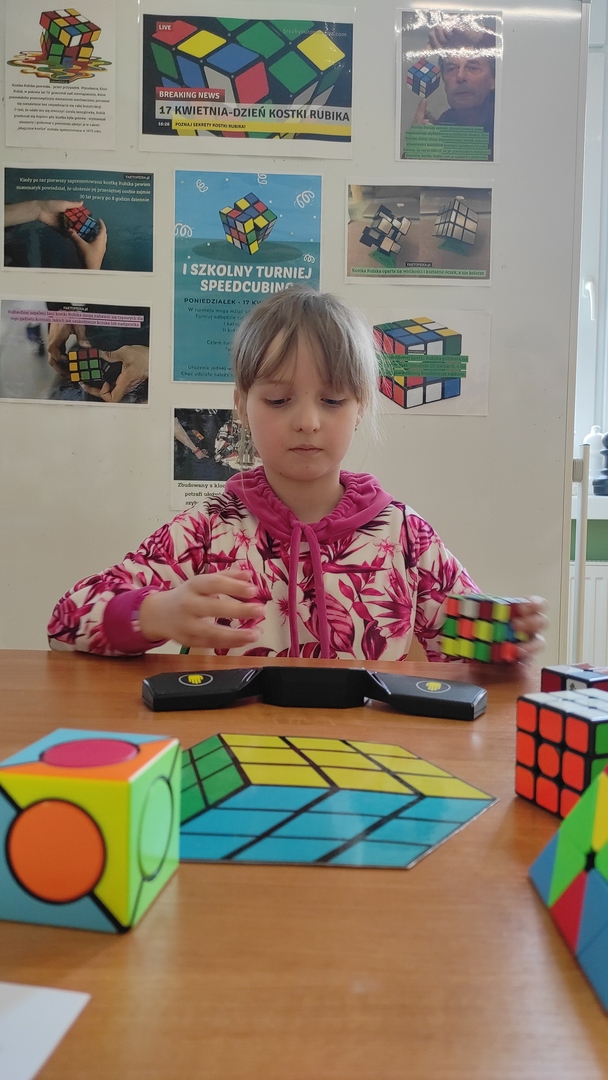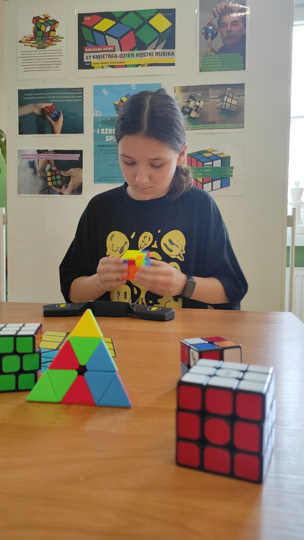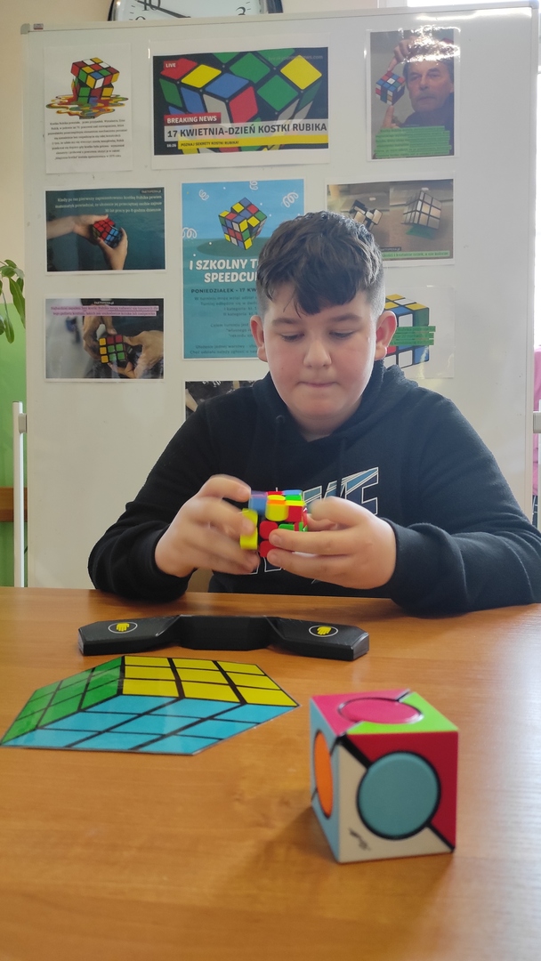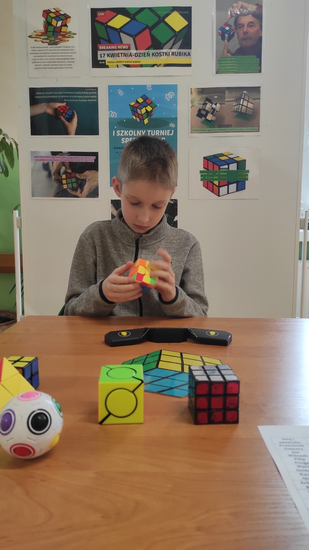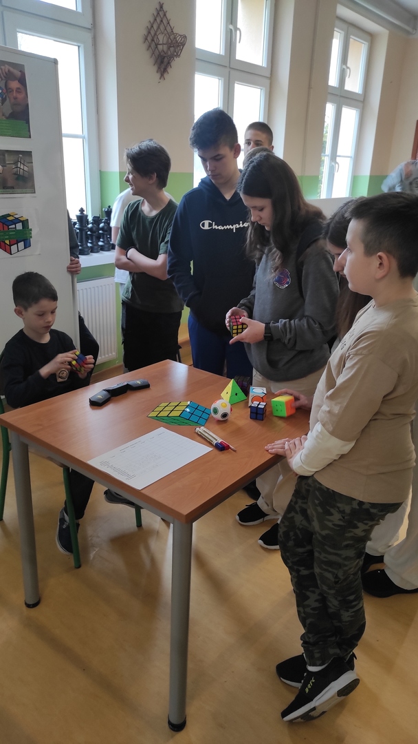 Z tej okazji uczniowie naszej szkoły mieli szansę wziąć udział w szkolnym turnieju układania kostki Rubika na czas.