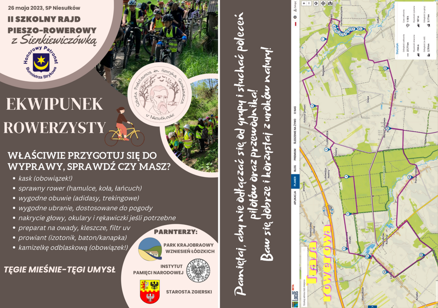 Przez cały tydzień w szkole rozmawialiśmy na temat właściwego przygotowania do wyprawy. Proszę o zazpoznanie się z niezbędnym EKWIPUNKIEM PIESZEGO I ROWERZYSTY wraz z mapą trasy (można sobie pobrać, wydrukować i zabrać ze sobą). Obowiązkowo na całej trasie konieczne będzie posiadanie KAMIZELKI ODBLASKOWEJ (wszystkie grupy) oraz KASKU (rowerzyści - dzień przed sprawdź jeszcze raz stan swojego roweru: koła, łańcuch, przerzutki itd.)