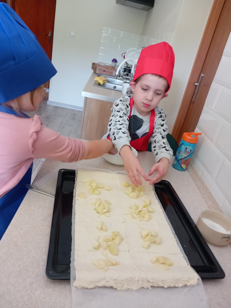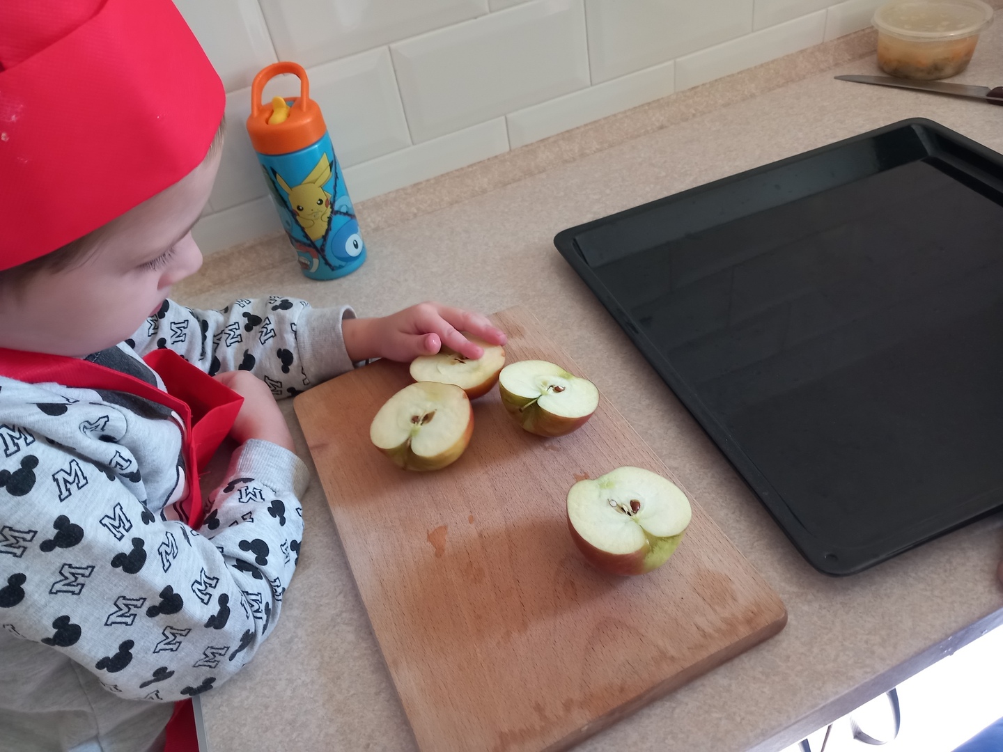 W naszym przedszkolu obchodziliśmy „Dzień Jabłka”. Był to wyjątkowy dzień, trochę inny niż zwykle. Dzieci poznawały jabłka i ich budowę. Nie obyło się, bez kształtowania pojęć matematycznych z wykorzystaniem naturalnych okazów jabłuszek. Maluchy chętnie rozpoznawały i określały kształt, zapach, kolor, smak. Ponadto, wzbogacały swoją wiedzę z zakresu walorów zdrowotnych, tych smacznych owoców, a także poznały możliwości przetwarzania jabłek – przeciery, kompoty, konfitury, musy itp. Ważne, było także zwrócenie uwagi na spożywanie jabłek po uprzednim ich umyciu. Wszystkie zabawy tego dnia dominowały pod znakiem jabłka – były piosenki, tańce, a także zagadki i działania matematyczne. Dzieci świetnie poradziły sobie z przeliczaniem i porównywaniem jabłek. Wykonywały prace plastycznychą techniką- wyklejanka z bibuły oraz lepiły owoce z plasteliny. Na koniec zajęć, pod okiem nauczyciela dzieci przygotowywały pyszne ciasteczka z ciasta francuskiego i jabłek. Było smacznie, zdrowo i wesoło.