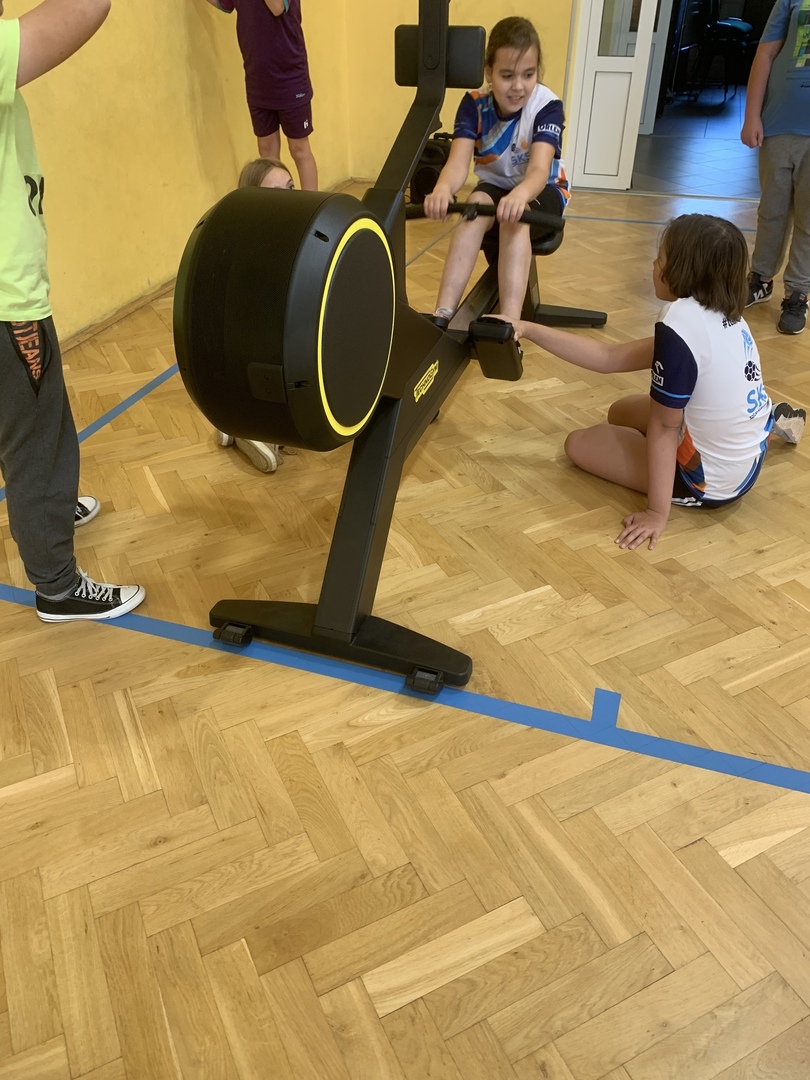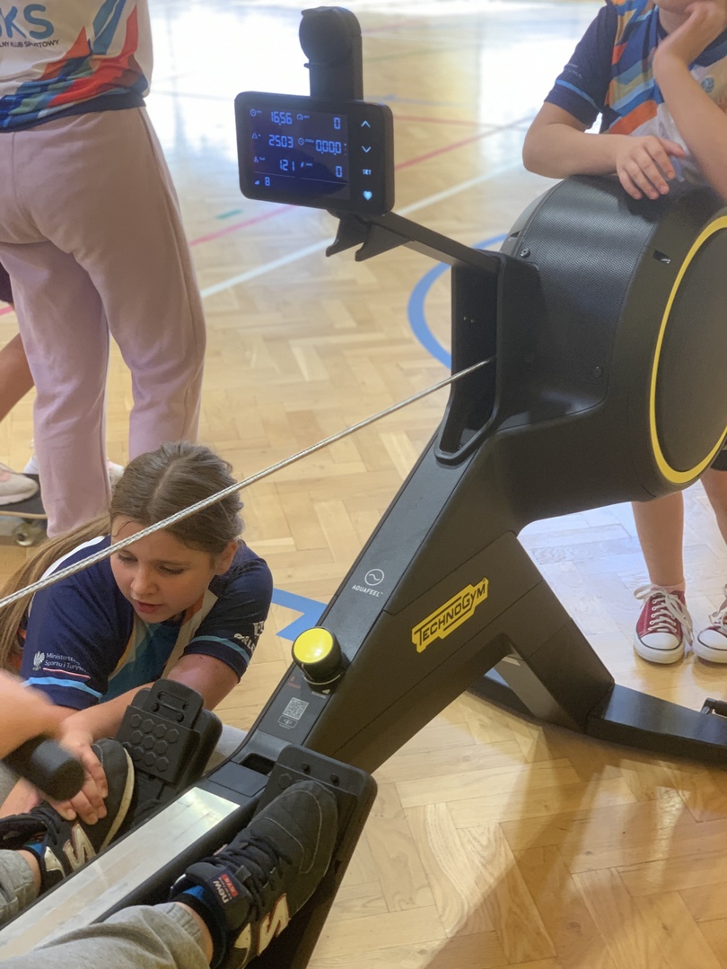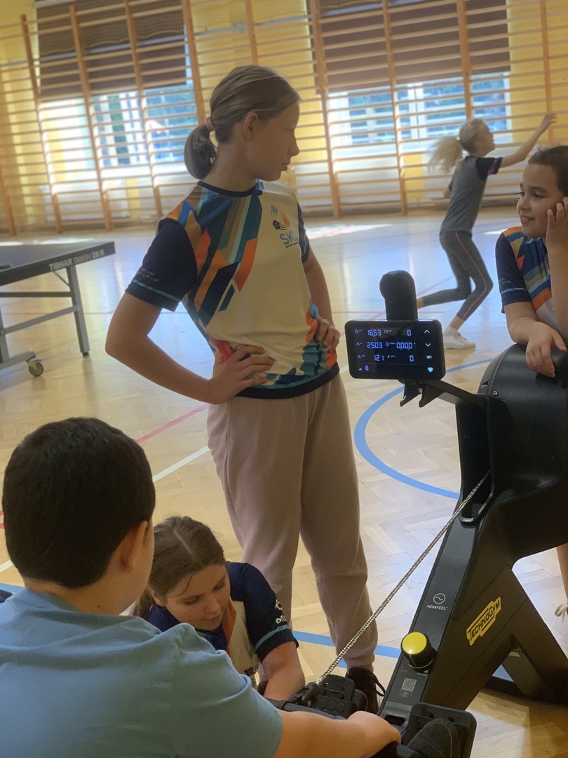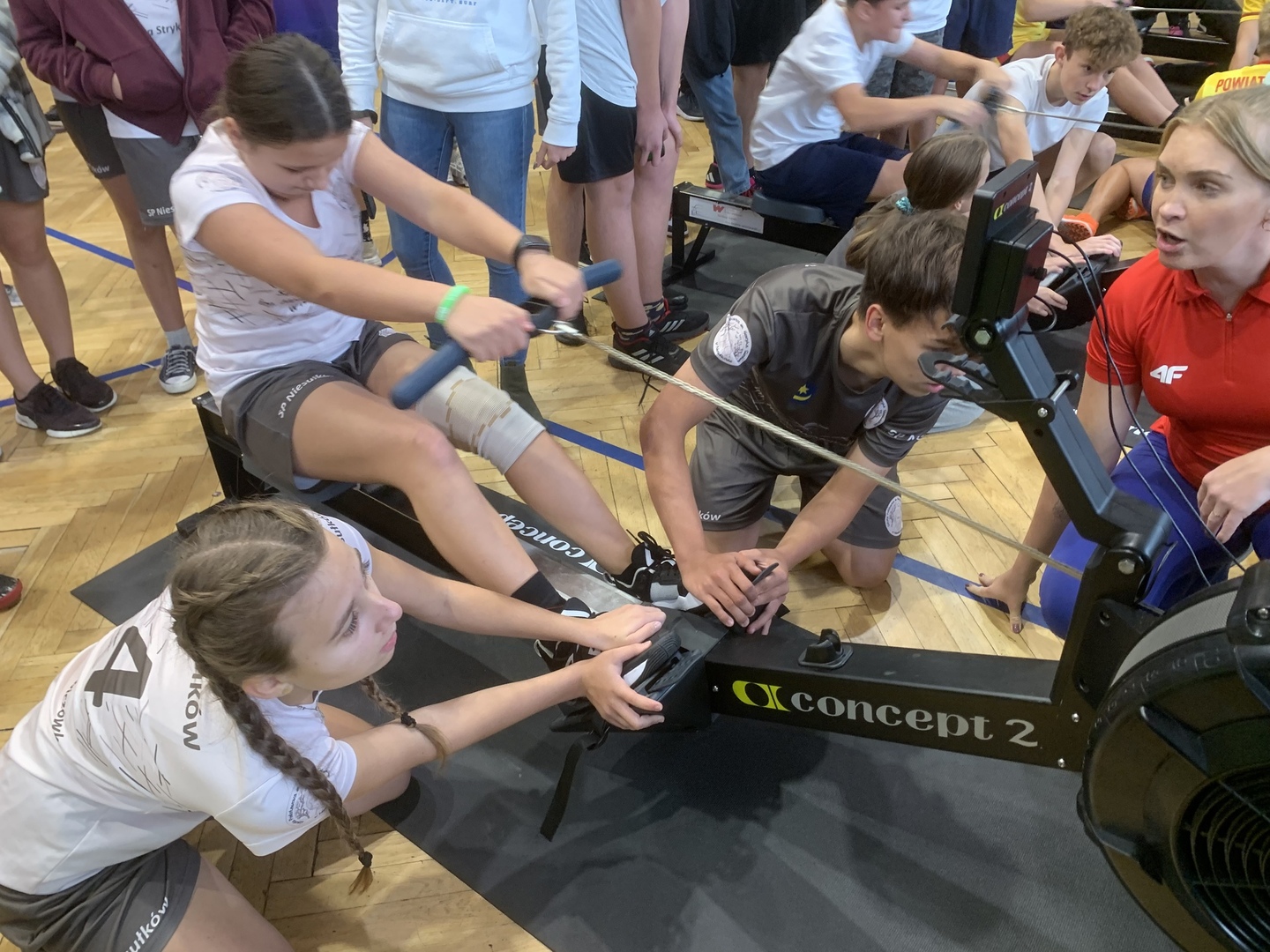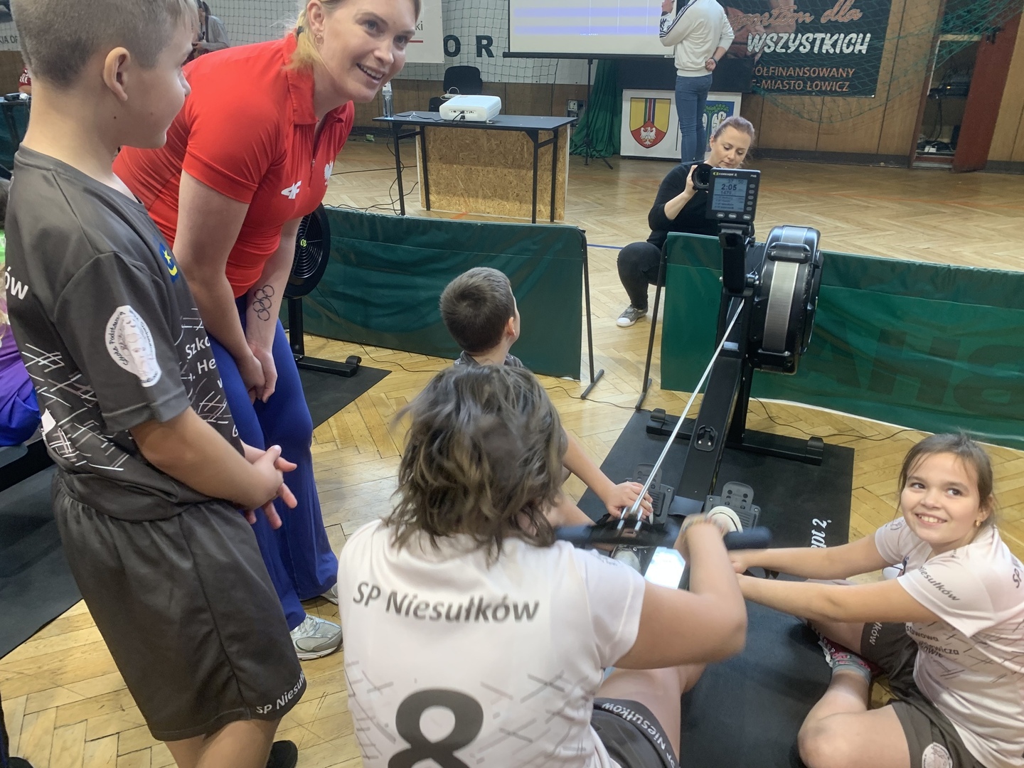 Kilka dni wcześniej klub kolarski LUKS Dwójka Stryków udostepnił nam do treningu swój ergometr, aby poznać tajniki zmian i technikę wiosłowania. Efekt - srebrny medal uczniów klasy VII i 6. miejsce w gronie 12 szkół z powiatów zgierskiego, łowickiego i brzezińskiego. Prawdziwą gratką było spotkanie z Multimedalistką Olimpijską Agnieszką Kobus-Zawojską, która chętnie opowiadała o swoich startach na Igrzyskach i podzieliła się pamiątkową fotografią z autografem.
