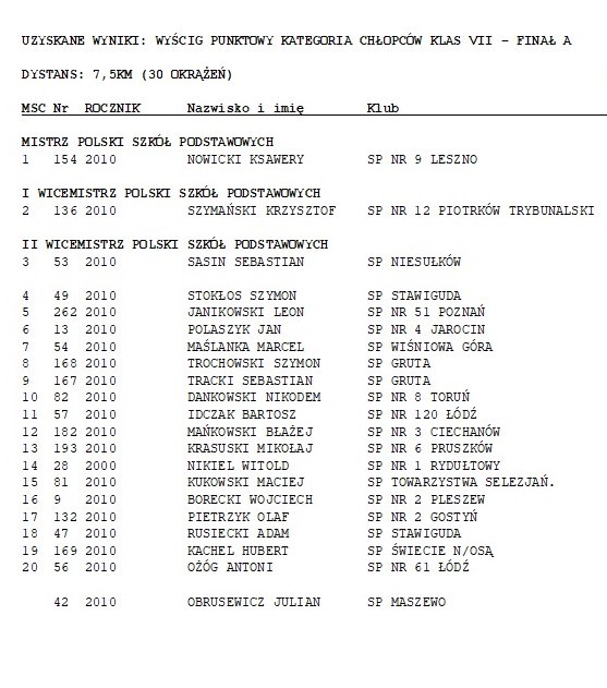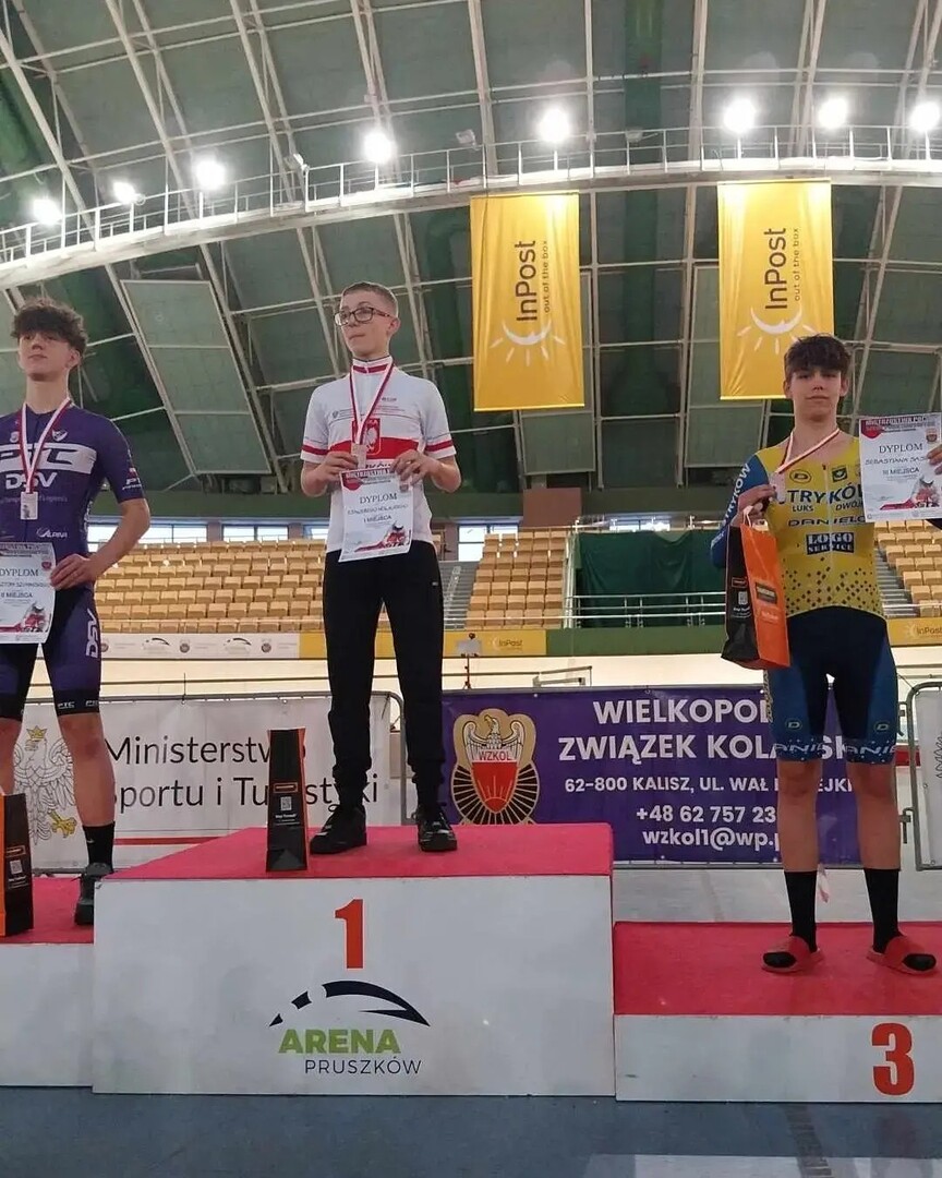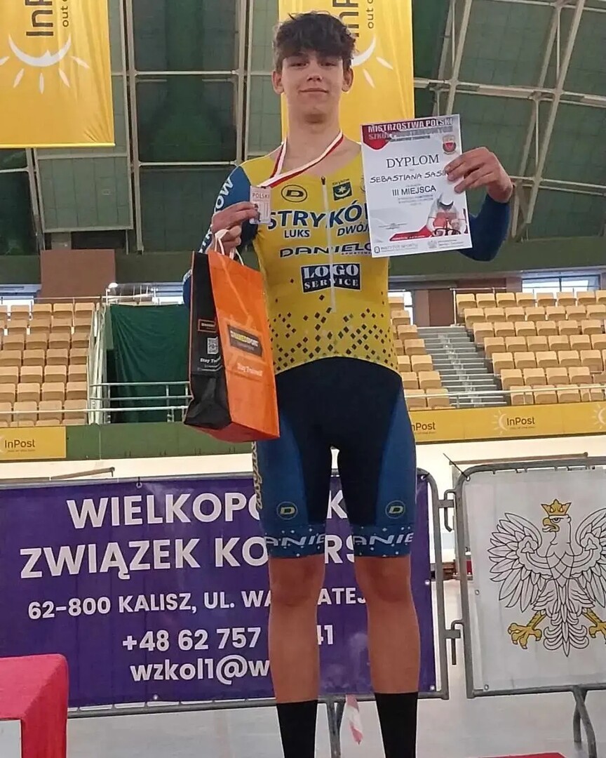 Uczeń Szkoły Podstawowej im. Henryka Sienkiewicza w Niesułkowie Sebastian Sasin po raz drugi został medalistą Mistrzostw Polski w Kolarstwie. Po sukcesie w czerwcowych zawodach w kolarstwie szosowym, gdzie był trzeci, tym razem wywalczył brązowy medal podczas zawodów w Pruszkowie i rozgrywanych tam w dniach 2-3 grudnia 2023r. Mistrzostwach Polski Szkół Podstawowych w Kolarstwie Torowym. Sebastian startował w kategorii klas VII w czterech torowych konkurencjach: 250 m ze startu lotnego, scratch, wyścig eliminacyjny i wyścig punktowy. I to właśnie w tej ostatniej stanął na podium, zdobywając brązowy medal Mistrzostw Polski. W pozostałych konkurencjach nasz uczeń również zameldował się na wysokich pozycjach, zajmując kolejno 8., 7. i 6. miejsce. Sebastian podczas zawodów reprezentował klub LUKS Dwójka Stryków, w barwach którego trenują i ścigają się także inni nasi uczniowie. Wielkie gratulacje!