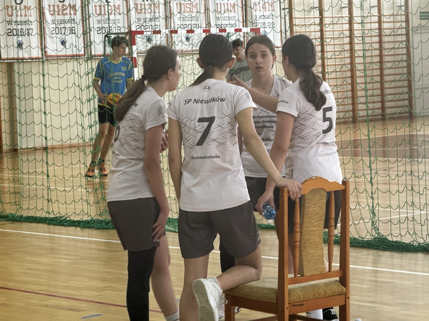 W rozgrywkach udział wzięło sześć drużyn, które zostały podzielone na dwie grupy. SP Niesułków w składzie Maria Sicinska, Natalia Opalska, Karina Opalska i Oliwia Rosiak świetnie zaczęły turniej od zwycięstwa nad silną i agresywnie grającą drużyną Szkoły Pijarskiej w Łowiczu 10:6. Wygrana dodała skrzydeł naszym zawodniczkom i w kolejnym meczu o wejście do wielkiego finału niesulkowianki nie dały szans SP Niewiadów, wygrywając aż 14 do 2. Kapitalne spotkanie rozegrała Marysia, która rzucała jak natchniona z bliska i z dystansu z niemal 100% skutecznością.