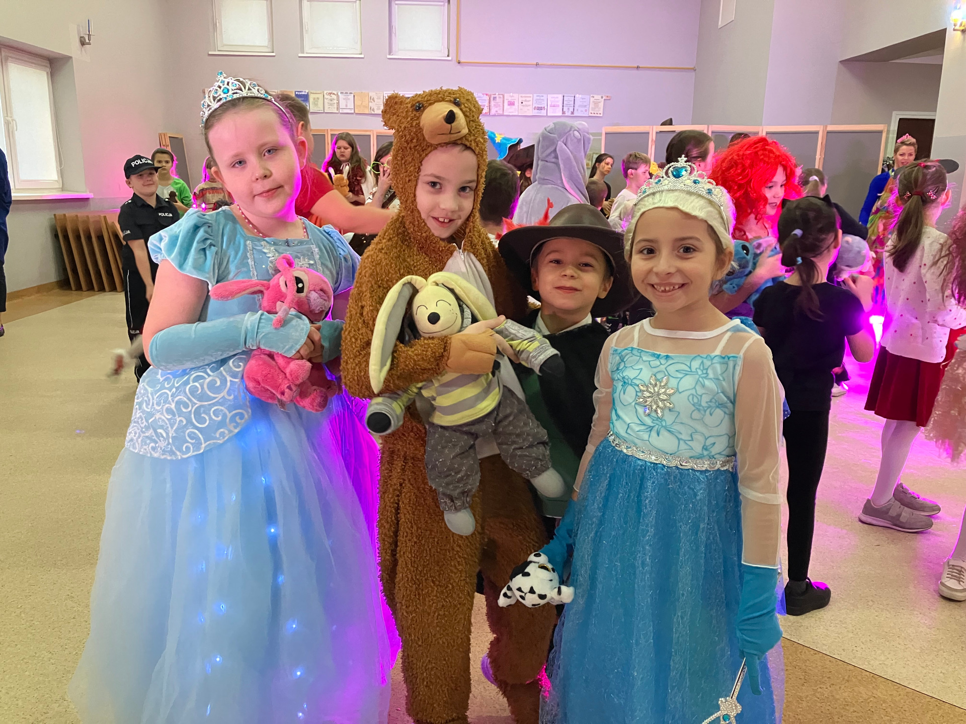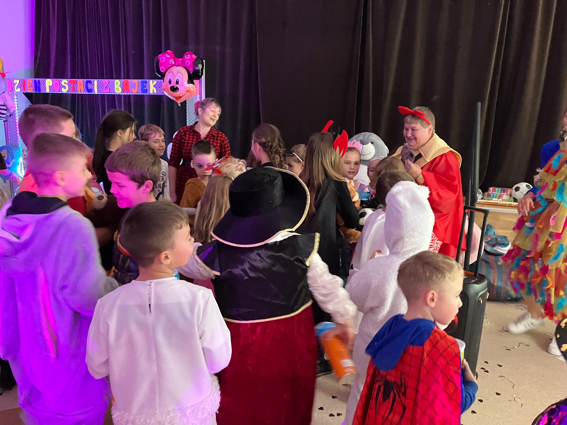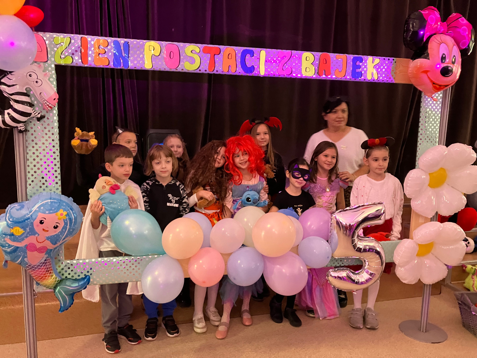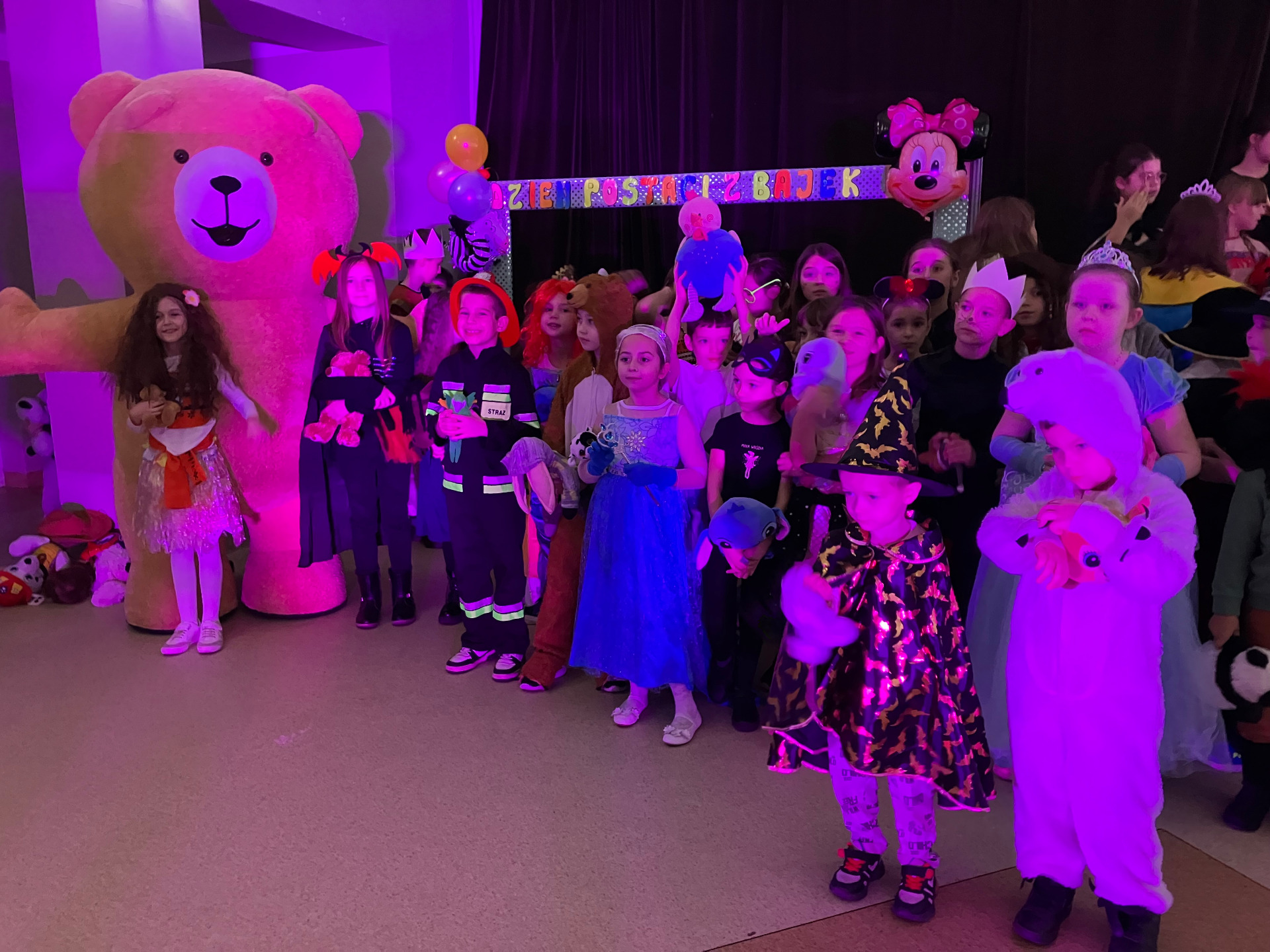 W dniu 5 listopada 2024 roku odbył się wyjątkowy Bal Postaci z Bajek, zorganizowany w ramach współpracy Domu Kultury i Biblioteki Publicznej z naszą szkołą dla uczniów klas 0 -IV. Impreza cieszyła się ogromnym zainteresowaniem, a kolorowe kostiumy przygotowane przez uczniów wprowadziły wszystkich w magiczny świat bajek i baśni. Na uczestników balu czekało wiele atrakcji – taneczne zabawy, konkursy, wybór króla i królowej, bajkowa fotobudka, złote konfetti i bańki mydlane. Dzieci wysłuchały również bajkowej opowieści, a potem szukały ukrytych przedmiotów i łowiły złote rybki. Radości nie było końca, kiedy na parkiecie pojawił się ogromny pluszowy miś, do którego wszyscy chętnie przytulali się.