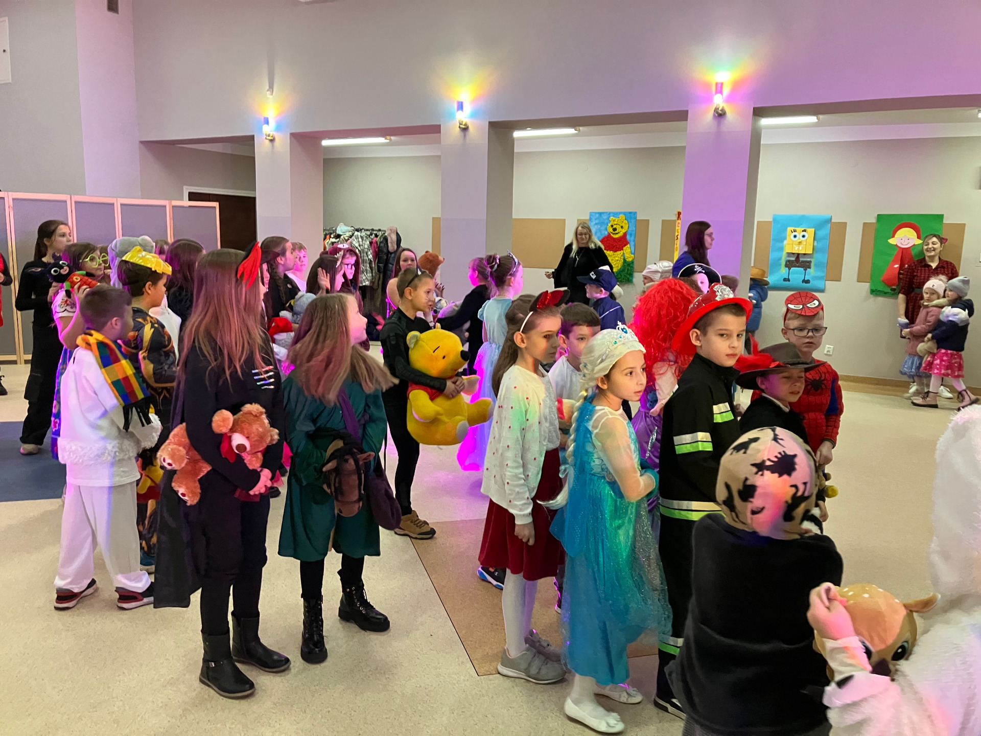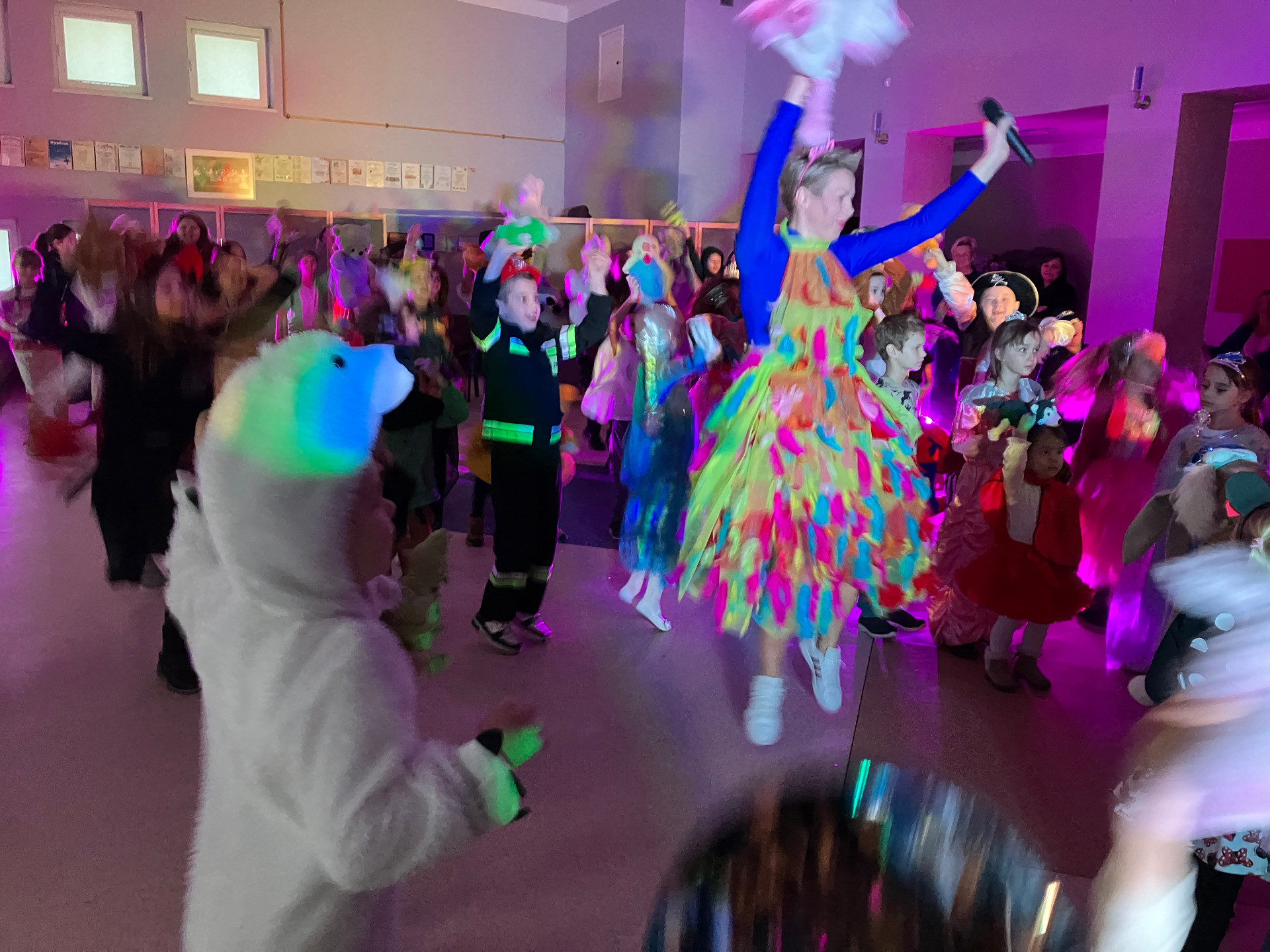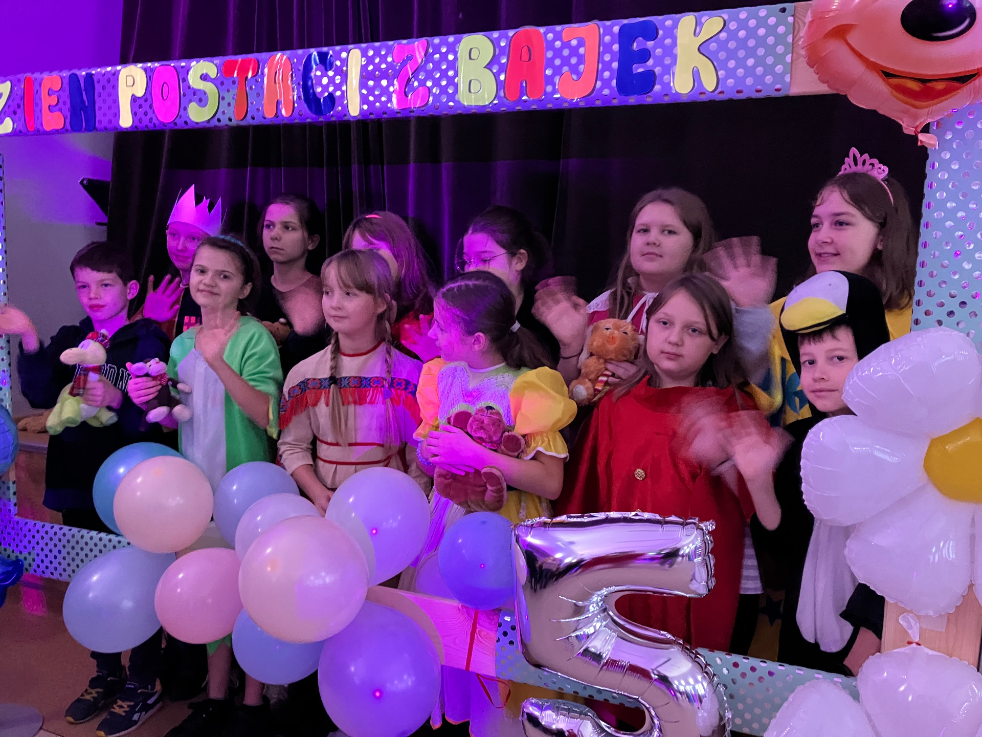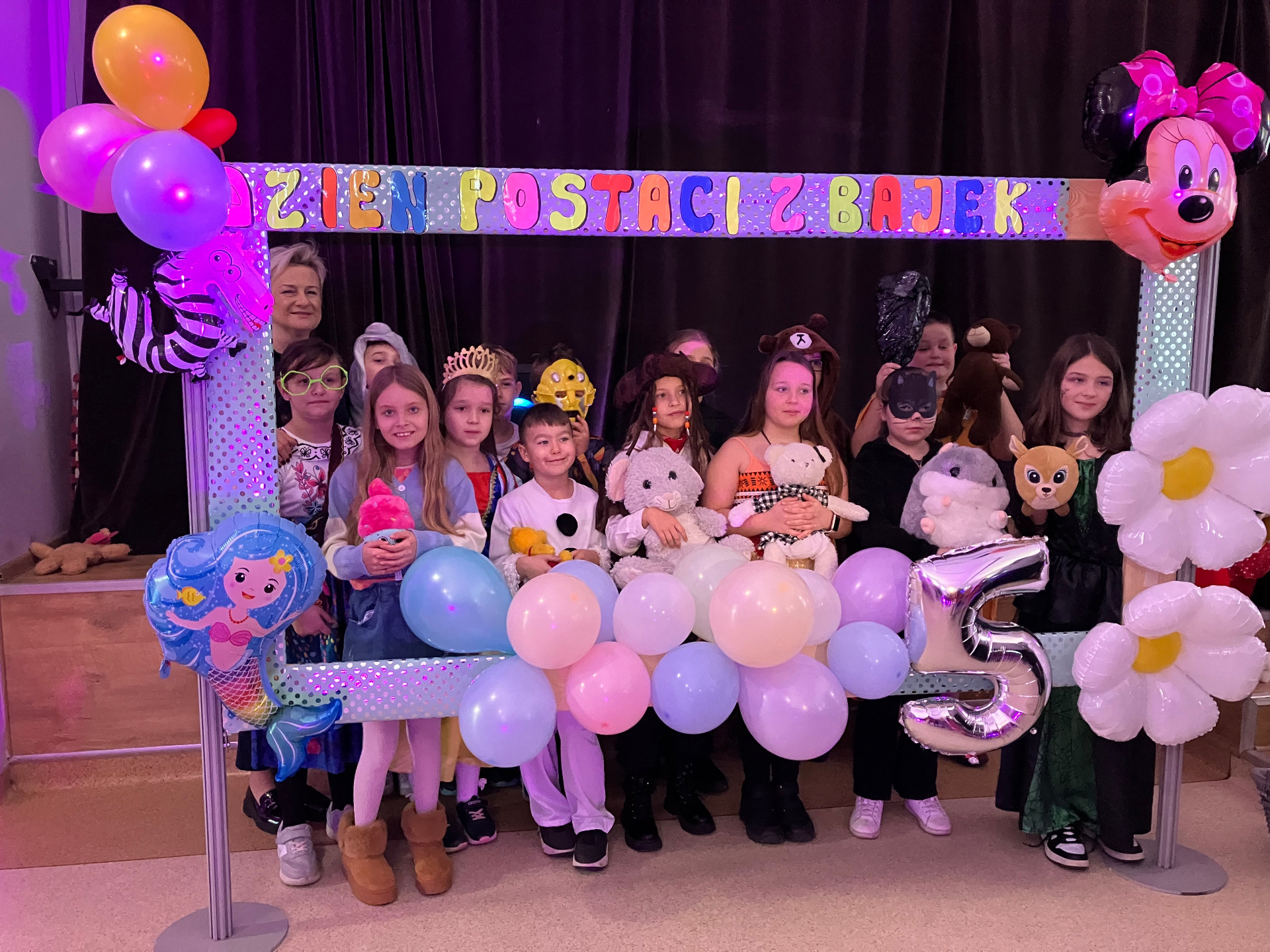 W dniu 5 listopada 2024 roku odbył się wyjątkowy Bal Postaci z Bajek, zorganizowany w ramach współpracy Domu Kultury i Biblioteki Publicznej z naszą szkołą dla uczniów klas 0 -IV. Impreza cieszyła się ogromnym zainteresowaniem, a kolorowe kostiumy przygotowane przez uczniów wprowadziły wszystkich w magiczny świat bajek i baśni. Na uczestników balu czekało wiele atrakcji – taneczne zabawy, konkursy, wybór króla i królowej, bajkowa fotobudka, złote konfetti i bańki mydlane. Dzieci wysłuchały również bajkowej opowieści, a potem szukały ukrytych przedmiotów i łowiły złote rybki. Radości nie było końca, kiedy na parkiecie pojawił się ogromny pluszowy miś, do którego wszyscy chętnie przytulali się.