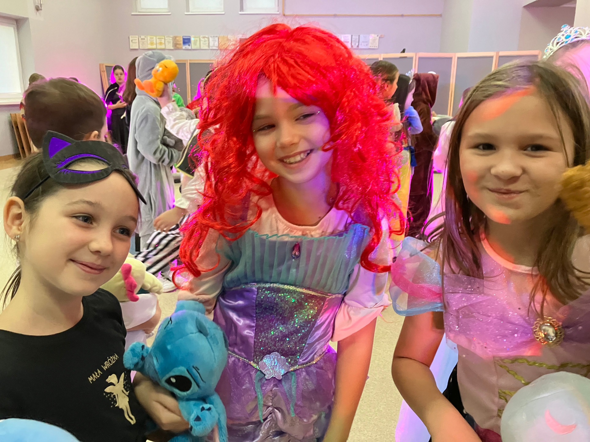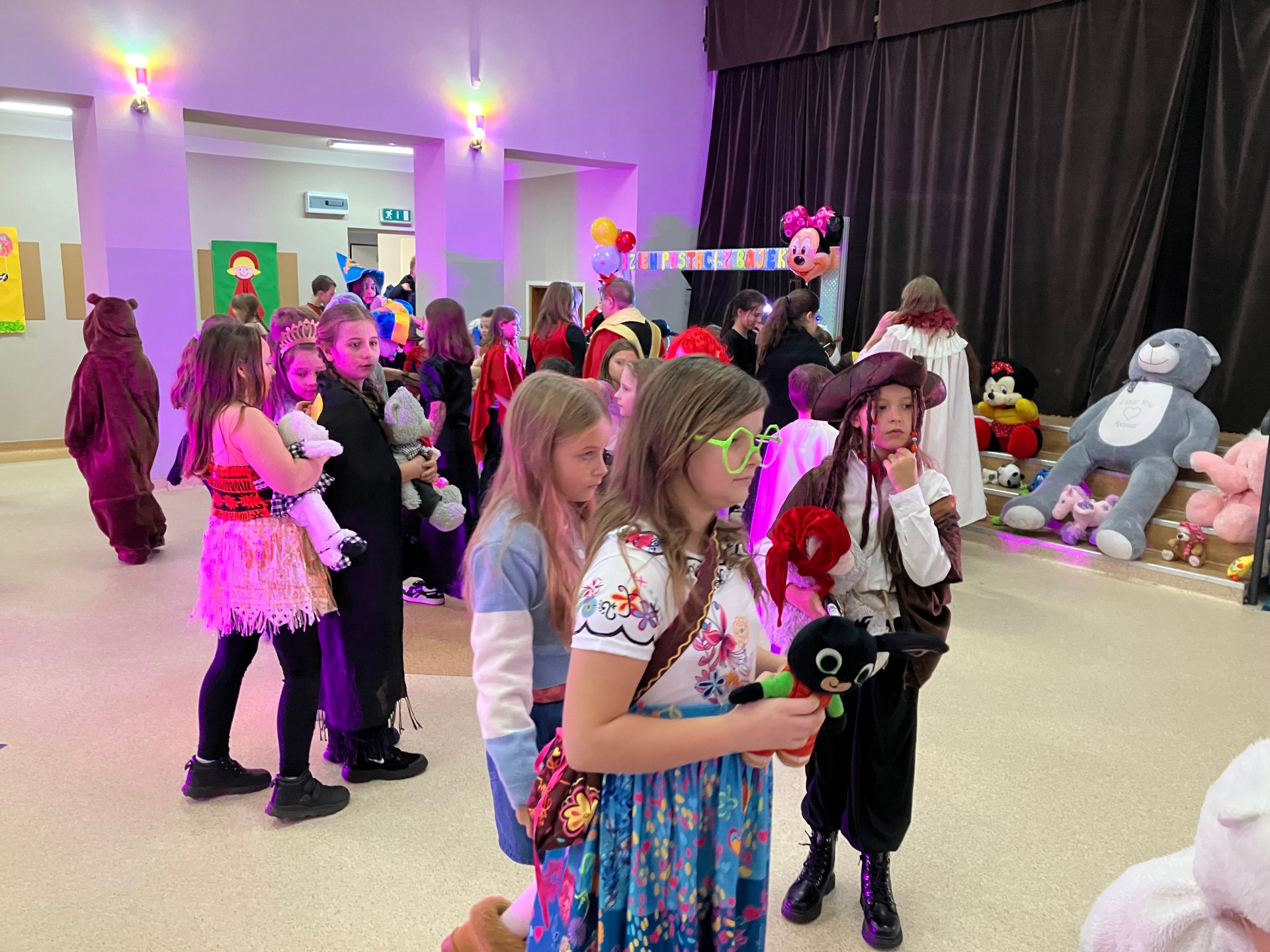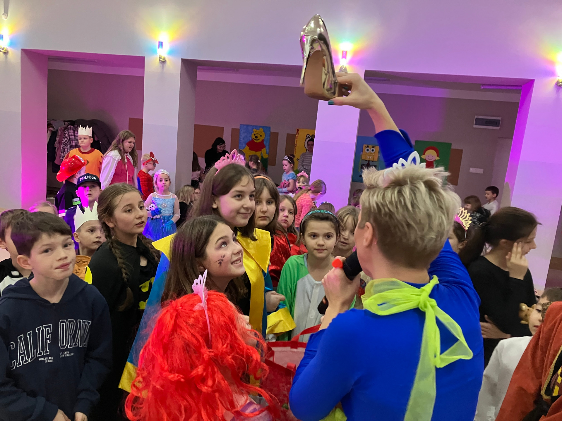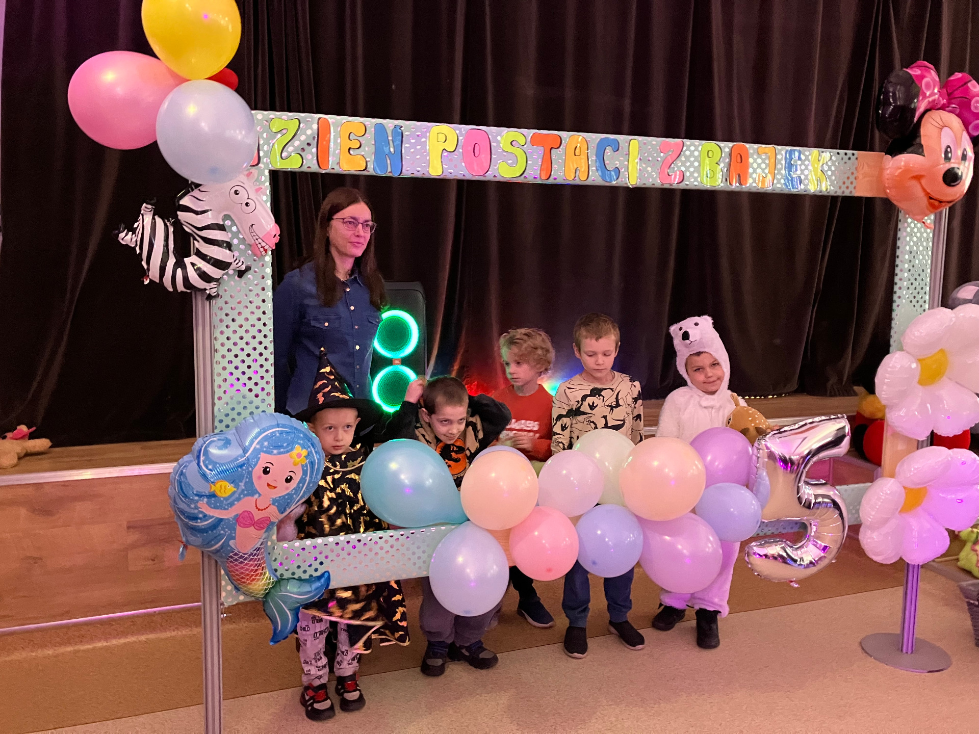 W dniu 5 listopada 2024 roku odbył się wyjątkowy Bal Postaci z Bajek, zorganizowany w ramach współpracy Domu Kultury i Biblioteki Publicznej z naszą szkołą dla uczniów klas 0 -IV. Impreza cieszyła się ogromnym zainteresowaniem, a kolorowe kostiumy przygotowane przez uczniów wprowadziły wszystkich w magiczny świat bajek i baśni. Na uczestników balu czekało wiele atrakcji – taneczne zabawy, konkursy, wybór króla i królowej, bajkowa fotobudka, złote konfetti i bańki mydlane. Dzieci wysłuchały również bajkowej opowieści, a potem szukały ukrytych przedmiotów i łowiły złote rybki. Radości nie było końca, kiedy na parkiecie pojawił się ogromny pluszowy miś, do którego wszyscy chętnie przytulali się.