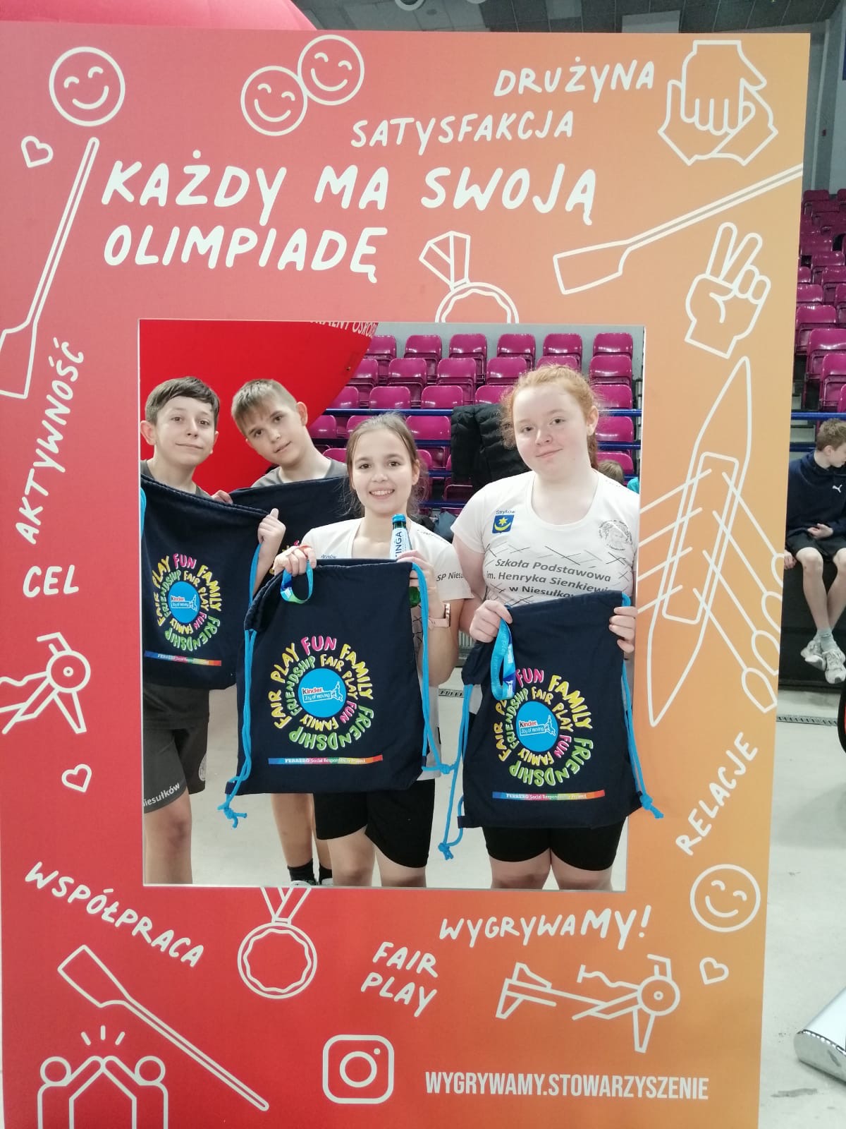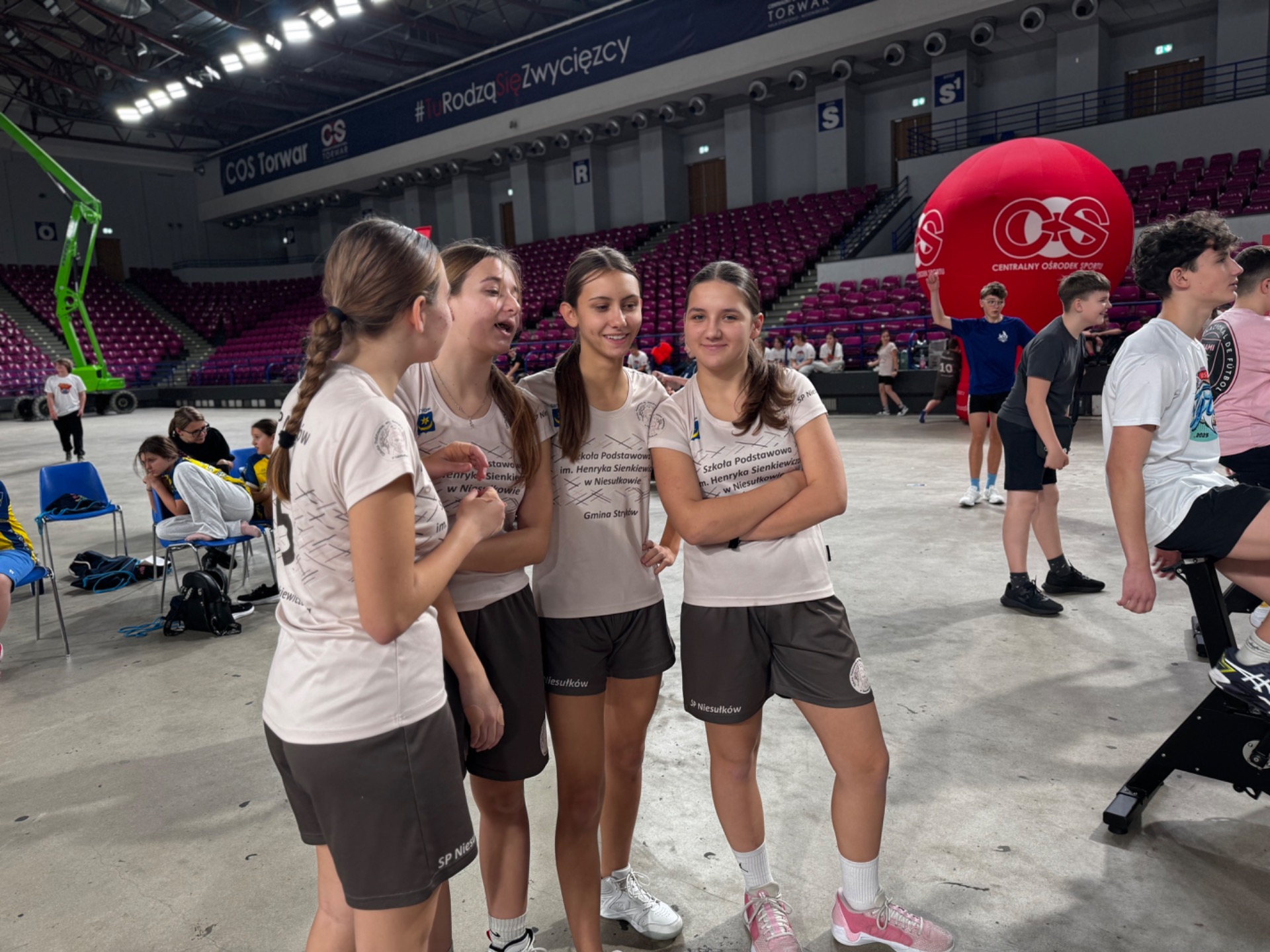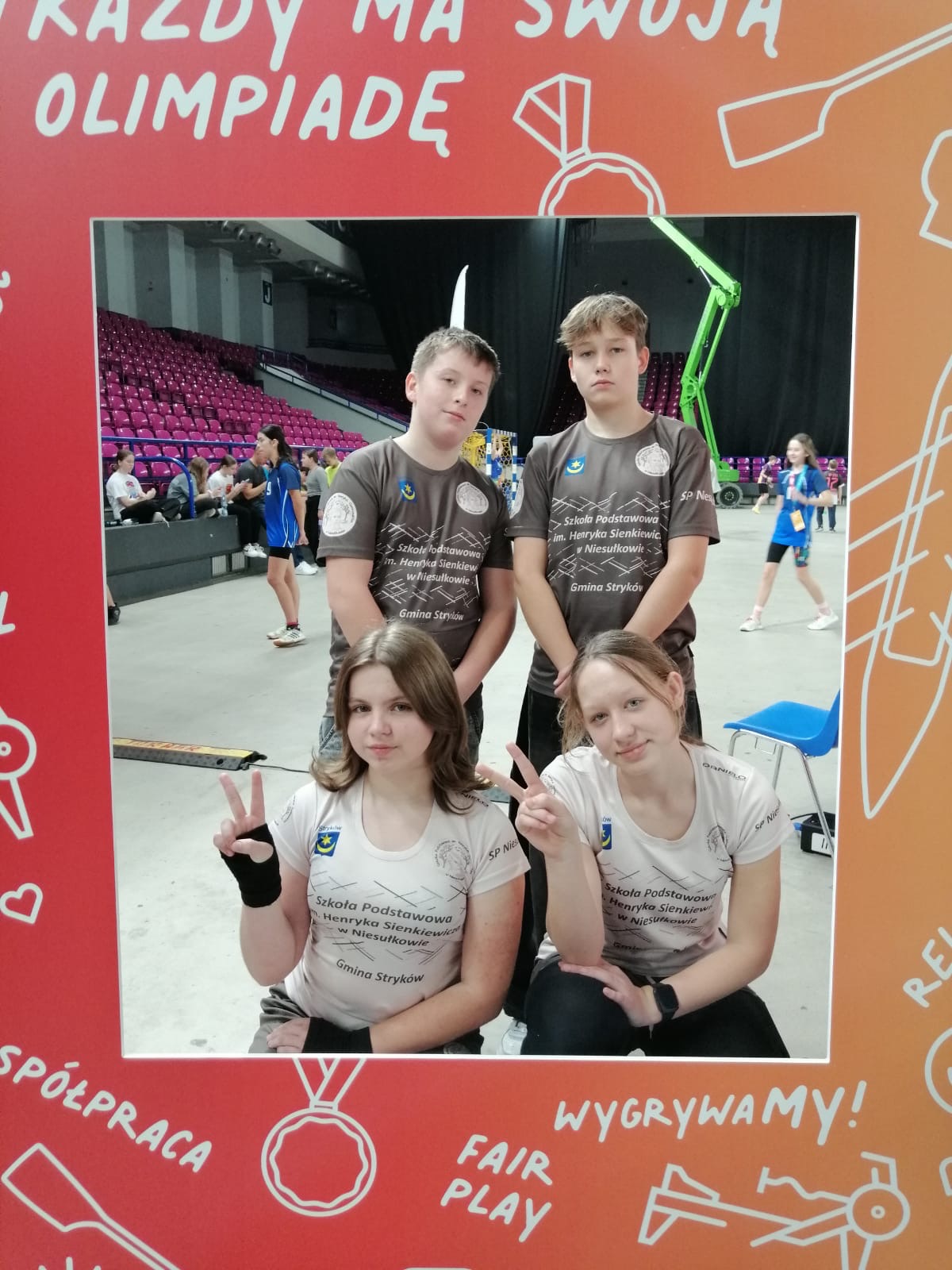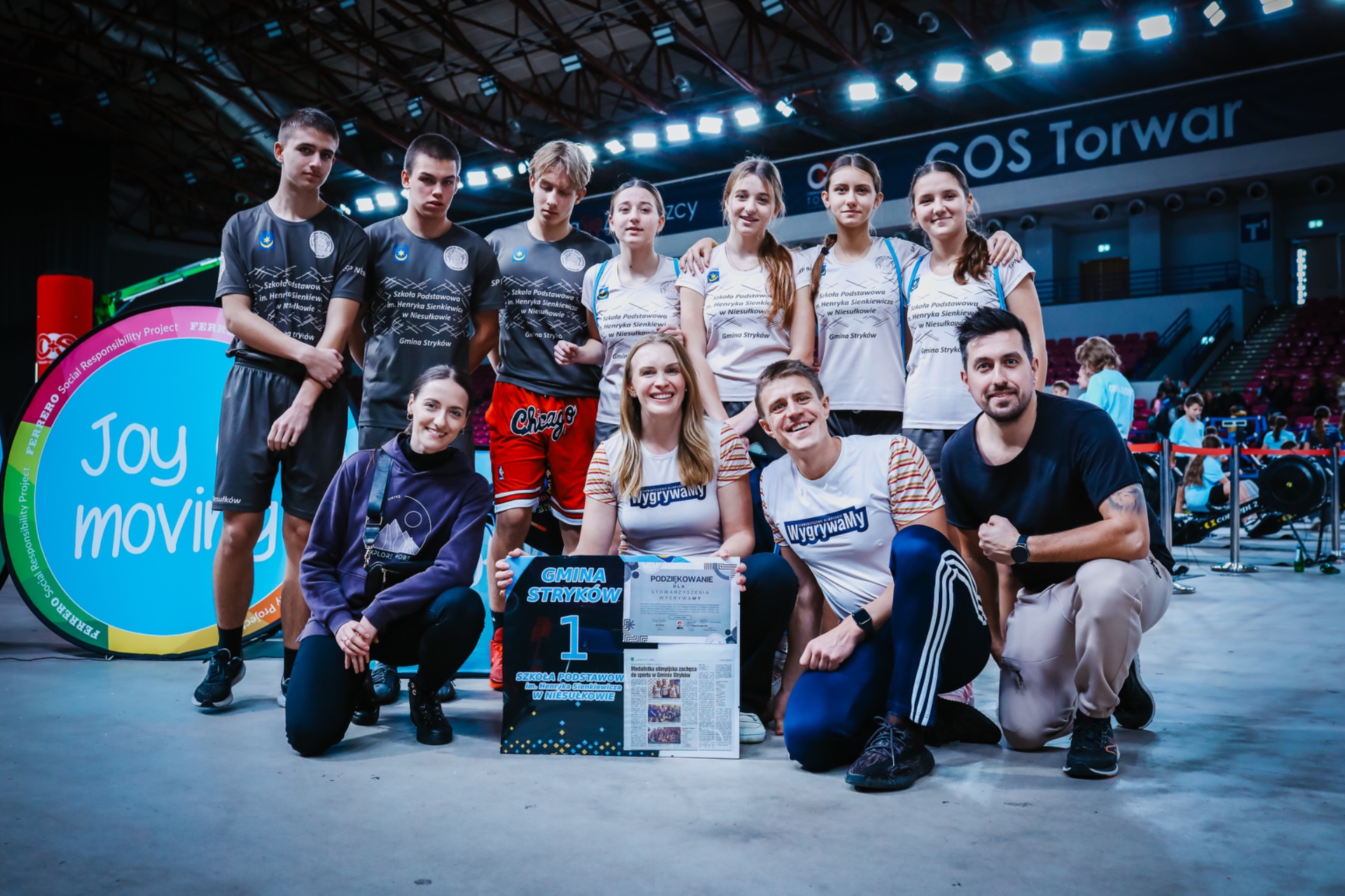 Na koniec zawodów grupa uczniów wraz z nauczycielami wręczyła głównym organizatorom ze Stowarzyszenia WygrywaMy pamiątkową koszulkę naszej Szkoły z podziękowaniami za wkład włożony w rozwój sportu wśród dzieci i młodzieży. Medalistka olimpijska Agnieszka Kobus-Zawojska oraz medalista europejskich i światowych imprez na ergometrze wioślarskim Maciej Zawojski byli wzruszeni tym gestem, a podarunek od razu zajął specjalne miejsce na półce w ich klubie - Przystani Warszawa. Wyjazd autokarem do Hali COS Torwar był darmowy i sfinansowany ze środków Gminy Stryków. Warto również dodać, że reprezentanci Niesułkowa mieli zapewnione dodatkowe wsparcie w postaci izotoników, przygotowanych specjalnie na ten wyjazd przez szkolne koło MasterChef, czyli uczniów z klasy III pod opieką wychowawczyni Krystyny Kumidaj.
