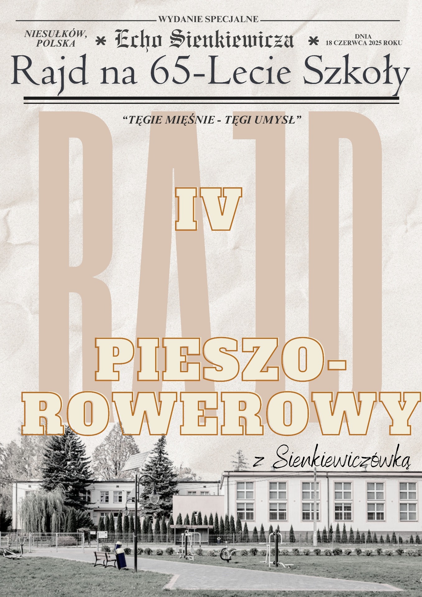 Przed nami czwarta edycja Szkolnego Rajdu Pieszo-Rowerowego z Sienkiewiczówką, który w tym roku zbiegł się z obchodami Jubileuszu 65-Lecia szkoły. Cel mamy zatem jeden - pokonać razem 65 km tras po otaczających nas terenach Parku Krajobrazowego Wzniesień Łódzkich. Żeby to się udało kilka grup uczniów pod opieką nauczycieli i przewodników PKWŁ musi przejść lub przejechać wyznaczoną trasę, a na koniec dobić kilometry podczas Meczu Piłki Nożnej Nauczyciele/Rodzice vs Uczniowie.