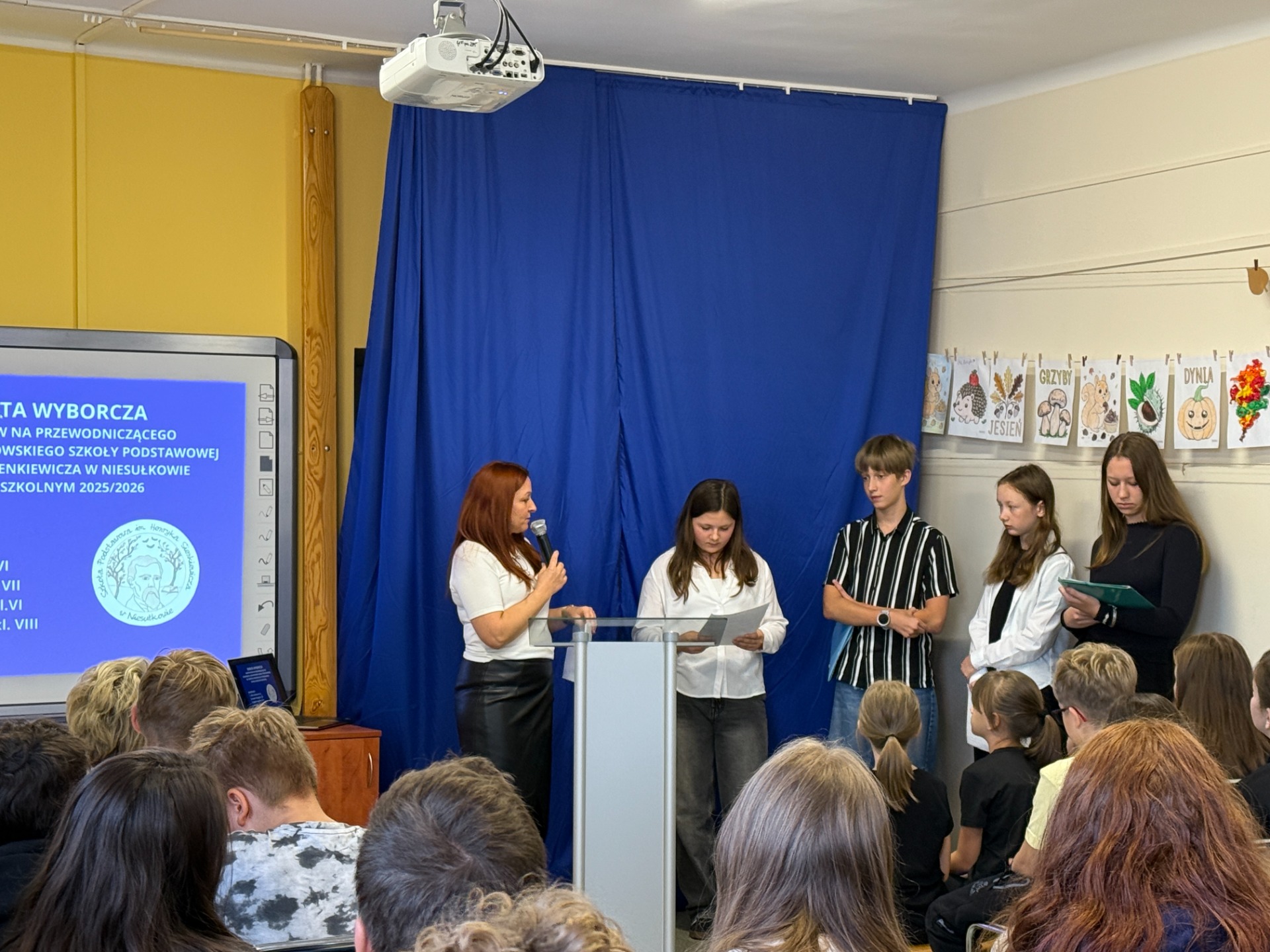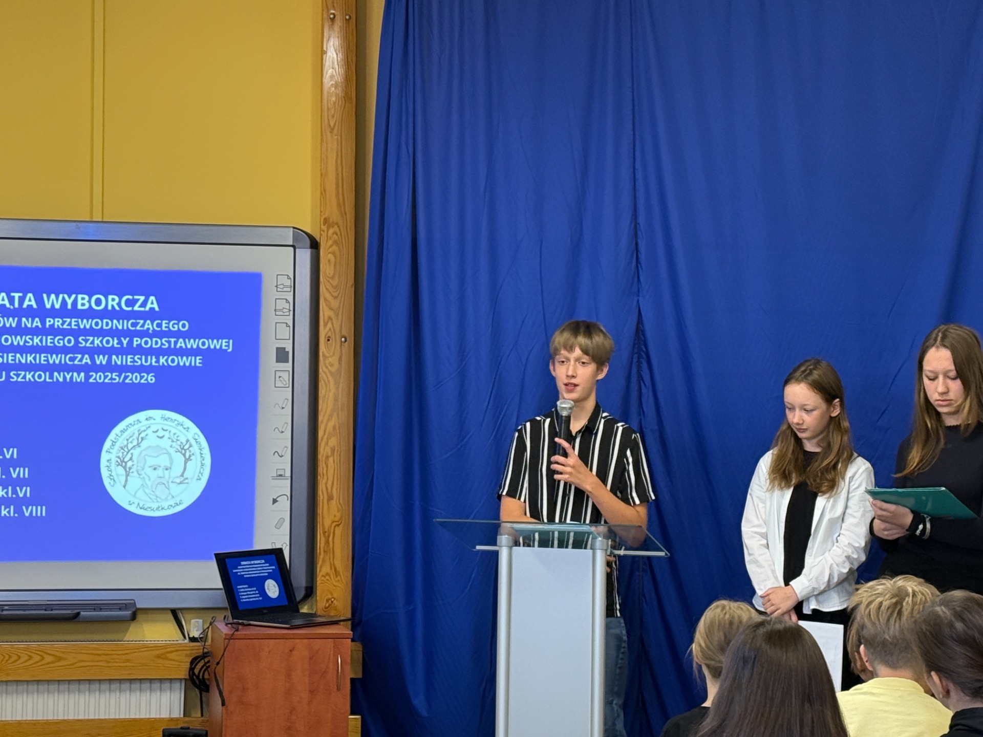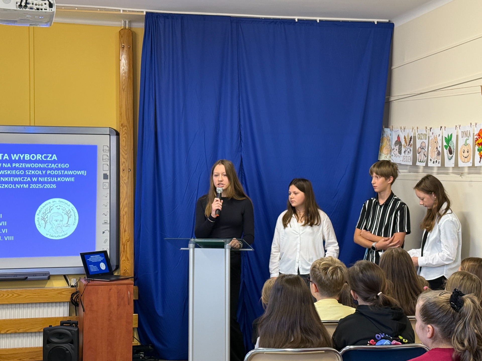 Chętnymi na pełnienie tej zaszczytnej funkcji byli: Zofia Sicińska kl.VI, Kacper Olczyk kl. VII, Jagoda Gniadek kl. VII oraz Amelia Lipińska kl. VIII. Po zaprezentowaniu przez kandydatów swojego programu oraz udzieleniu odpowiedzi na serię pytań, uczniowie z klas IV-VIII udali się do urny wyborczej, aby oddać swój głos. W głosowaniu wzięło udział 64 osób. Po zliczeniu głosów przez członków komisji wyborczej w składzie: Małgorzata Szczepaniak z klasy VIII i Maciej Walak z klasy VIII ogłoszono, że wybory na Przewodniczącego Samorządu Uczniowskiego wygrał uczeń klasy VII – Kacper Olczyk, a zastępczynią przewodniczącego została Amelia Lipińska, uczennica klasy VIII.