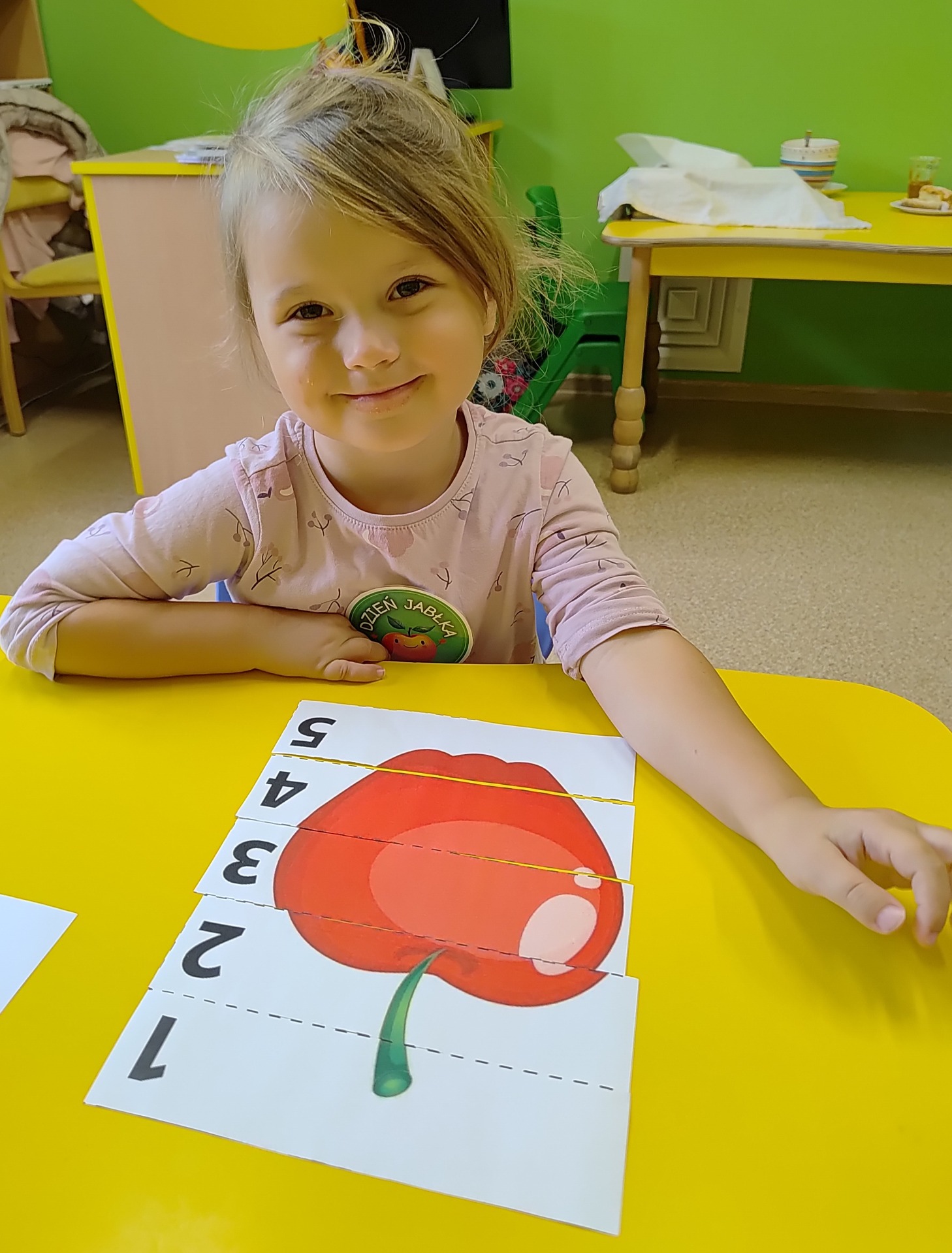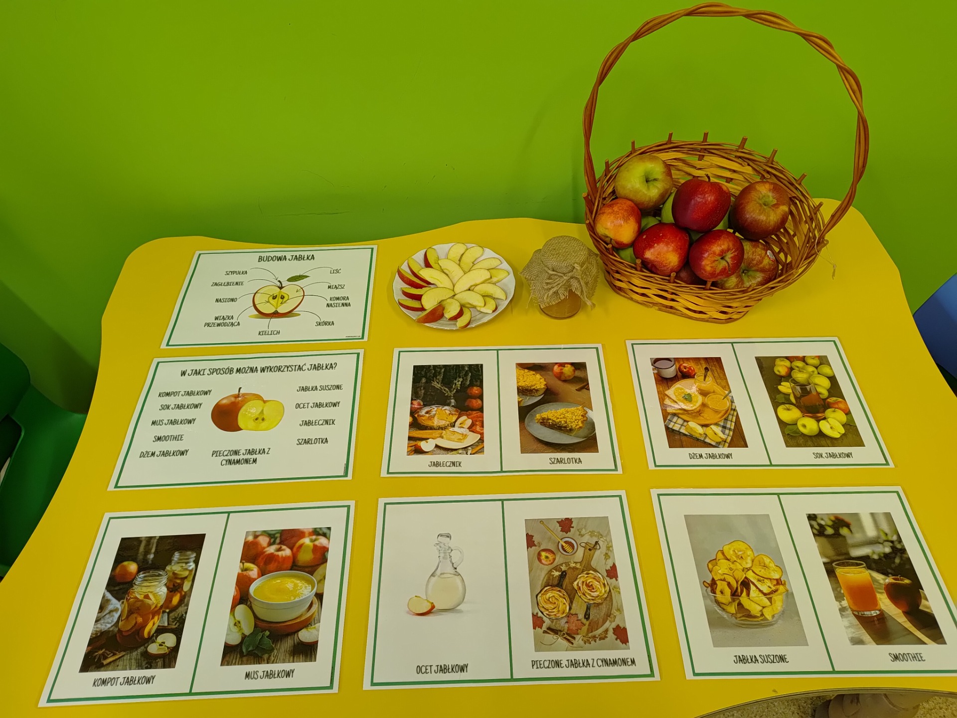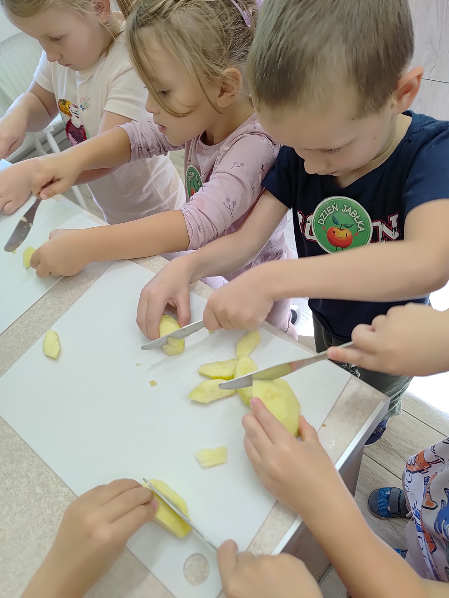 Dzieci poprzez rożne działania wszechstronnie poszerzały wiedzę o jabłku. Zdobywały wiadomości na temat potraw i przetworów z jabłek. Ponadto rozwiązywały zagadki i bawiły się przy piosenkach o jabłuszku. W tym dniu przedszkolaki udały się do kuchni, aby wykonać ciasto jabłkowe oraz sok jabłkowy.