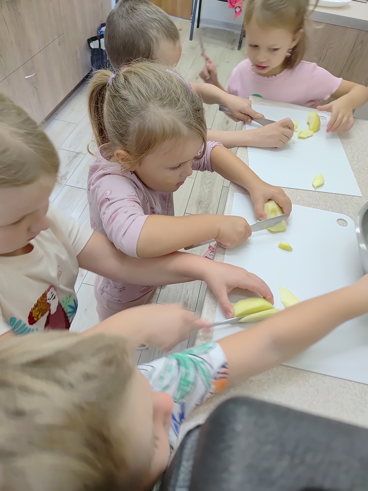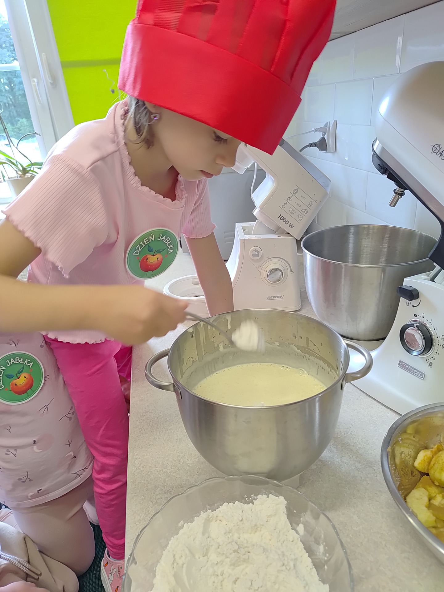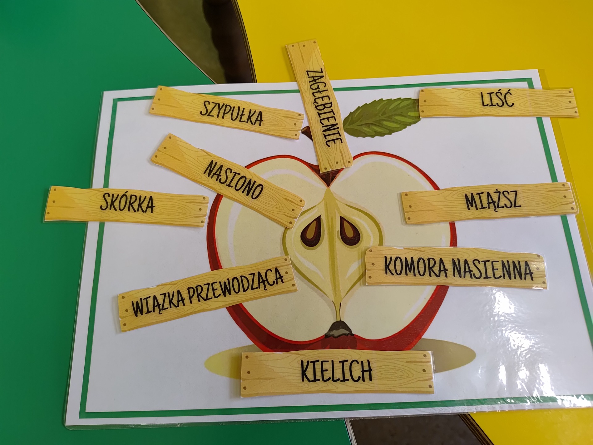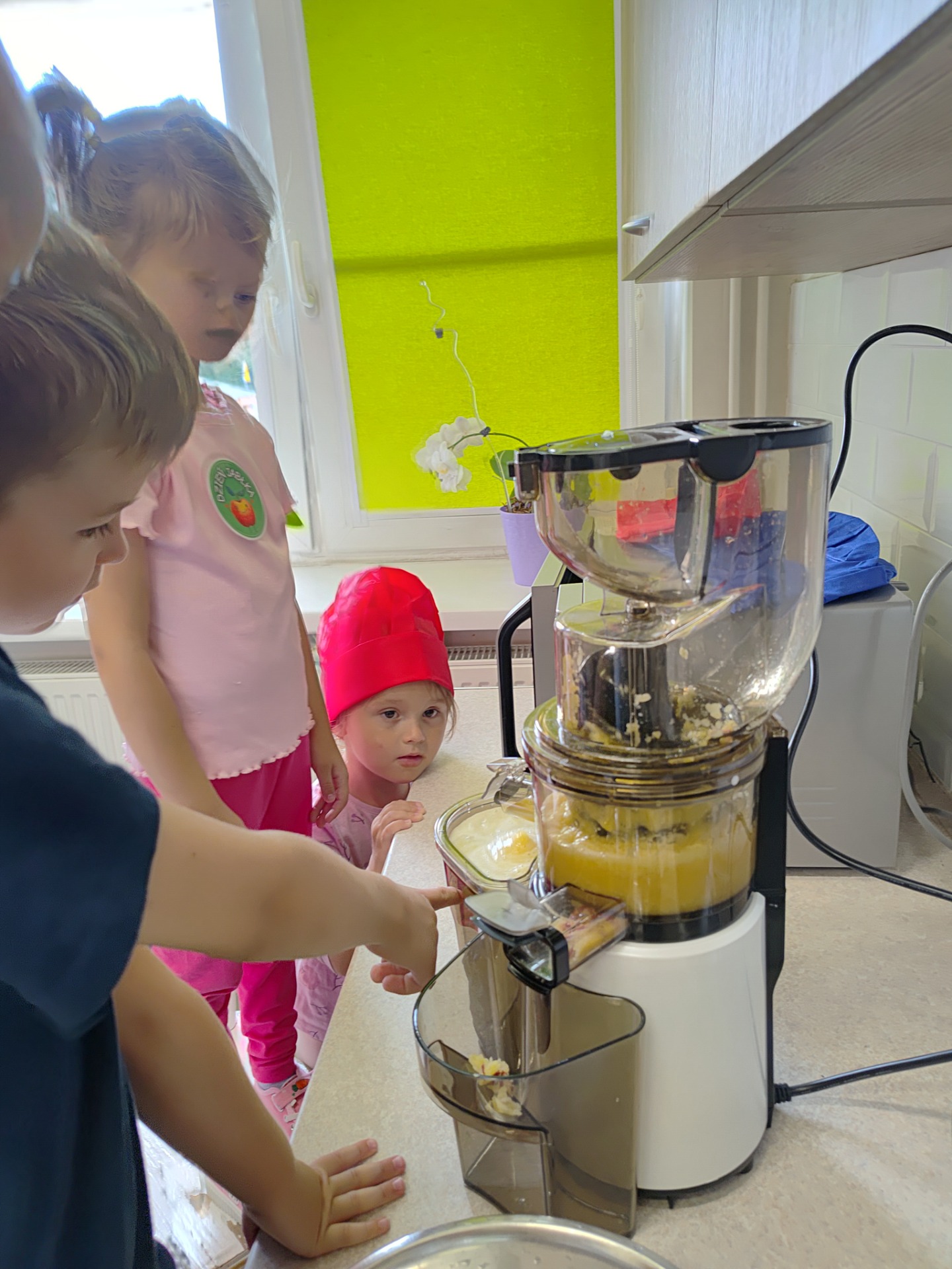 Dzieci poprzez rożne działania wszechstronnie poszerzały wiedzę o jabłku. Zdobywały wiadomości na temat potraw i przetworów z jabłek. Ponadto rozwiązywały zagadki i bawiły się przy piosenkach o jabłuszku. W tym dniu przedszkolaki udały się do kuchni, aby wykonać ciasto jabłkowe oraz sok jabłkowy.