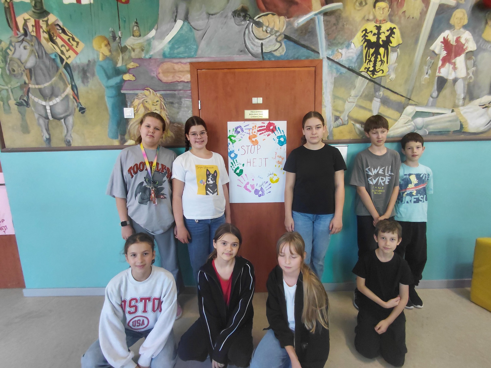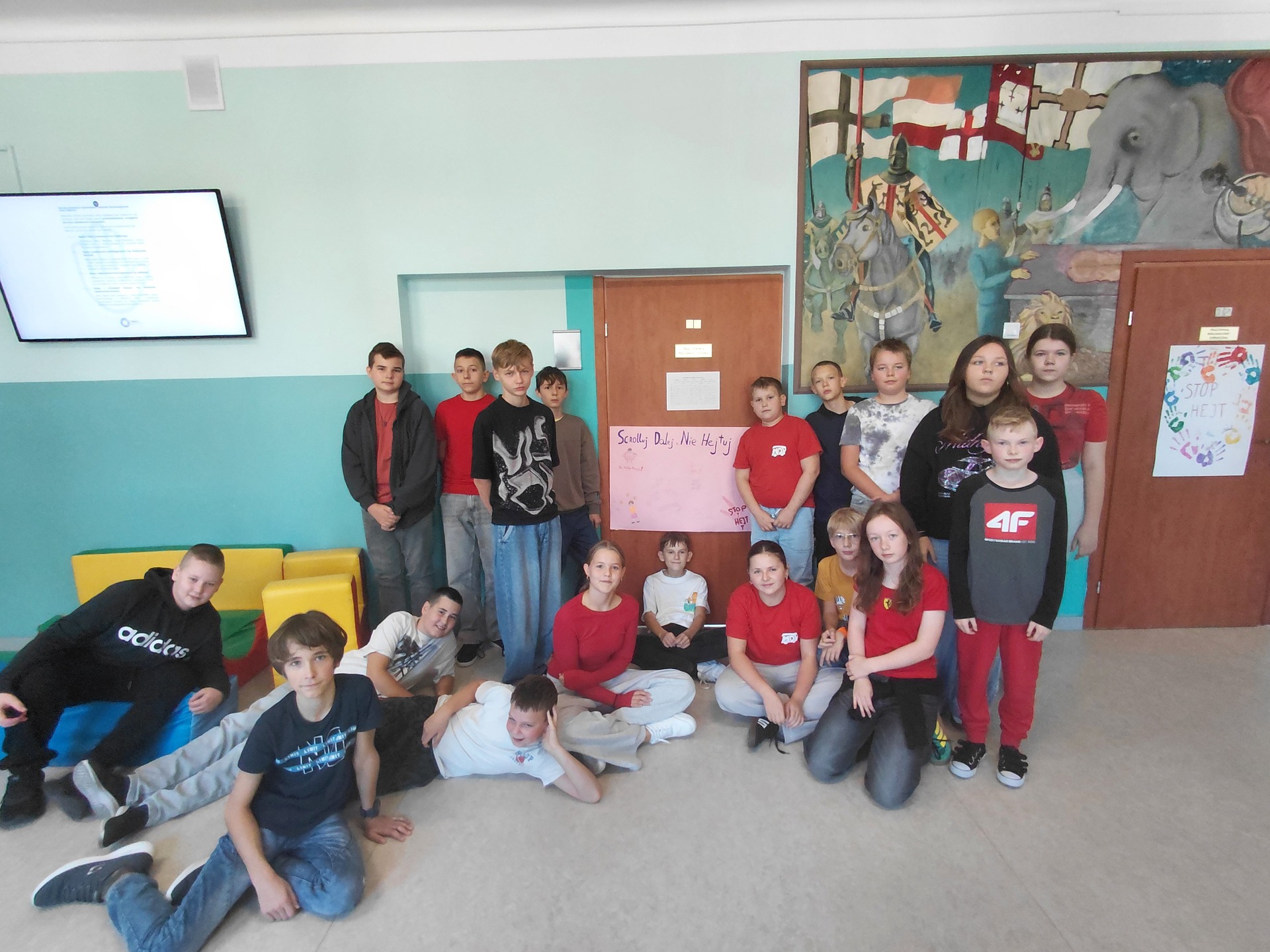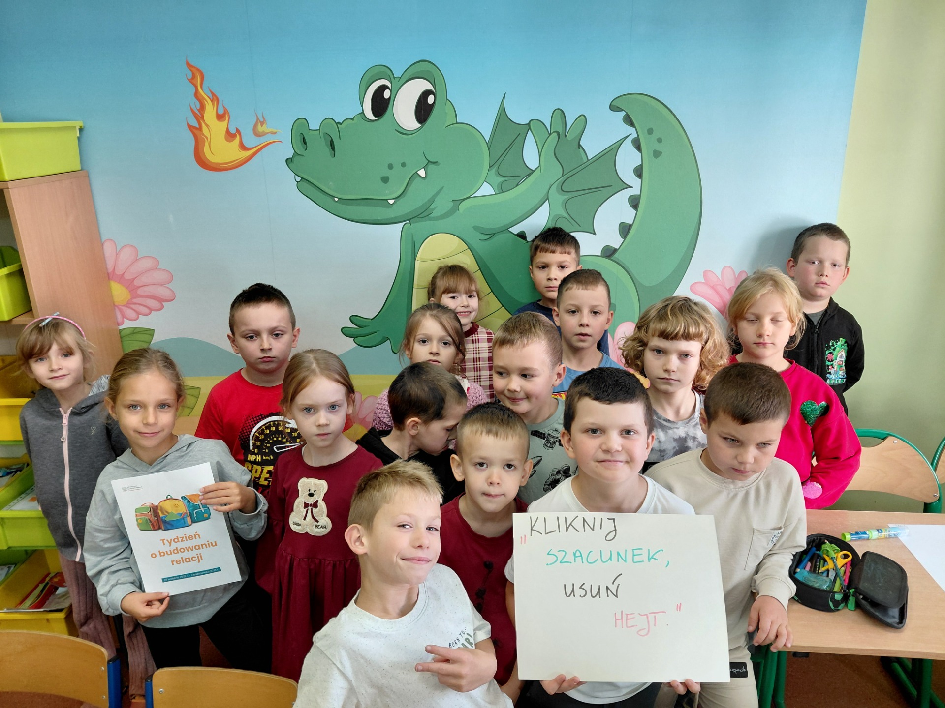 W dniach 29.09.-03.10.2025 r. w naszej szkole obchodziliśmy Tydzień Budowania Relacji oraz Tydzień Przeciwdziałania Przemocy Rówieśniczej. Celem było wzmocnienie relacji rówieśniczych, kształtowanie empatii oraz promowanie wzajemnego szacunku, odpowiedzialności za słowo oraz zachowanie w społeczności szkolnej. Obchody rozpoczęto apelem, podczas którego przypomniano, jak ważne są dobre relacje w klasie, szkole i poza nią. Uczniowie zostali zachęceni do aktywnego udziału w wydarzeniach zaplanowanych na kolejne dni. W kl. I-III p. Adriana Pietrasik i p. Olga Lipińska przeprowadziły warsztaty dotyczące budowania relacji. W kl. IV-VIII odbyły się lekcje wychowawcze na temat m.in. zdrowia psychicznego, komunikacji. Uczniowie zaangażowali się w przygotowanie plakatów poruszających temat hejtu. Powstały ciekawe prace, które zawisły na szkolnych korytarzach. Ważnym elementem obchodów była uczniowska petycja pt. „Kliknij szacunek, usuń hejt!”, której celem było popieranie walki z hejtem. Na szkolnych korytarzach pojawiły się także gazetki dotyczące m.in. radzenia sobie w trudnych sytuacjach, sposobów reagowania w sytuacji hejtowania.