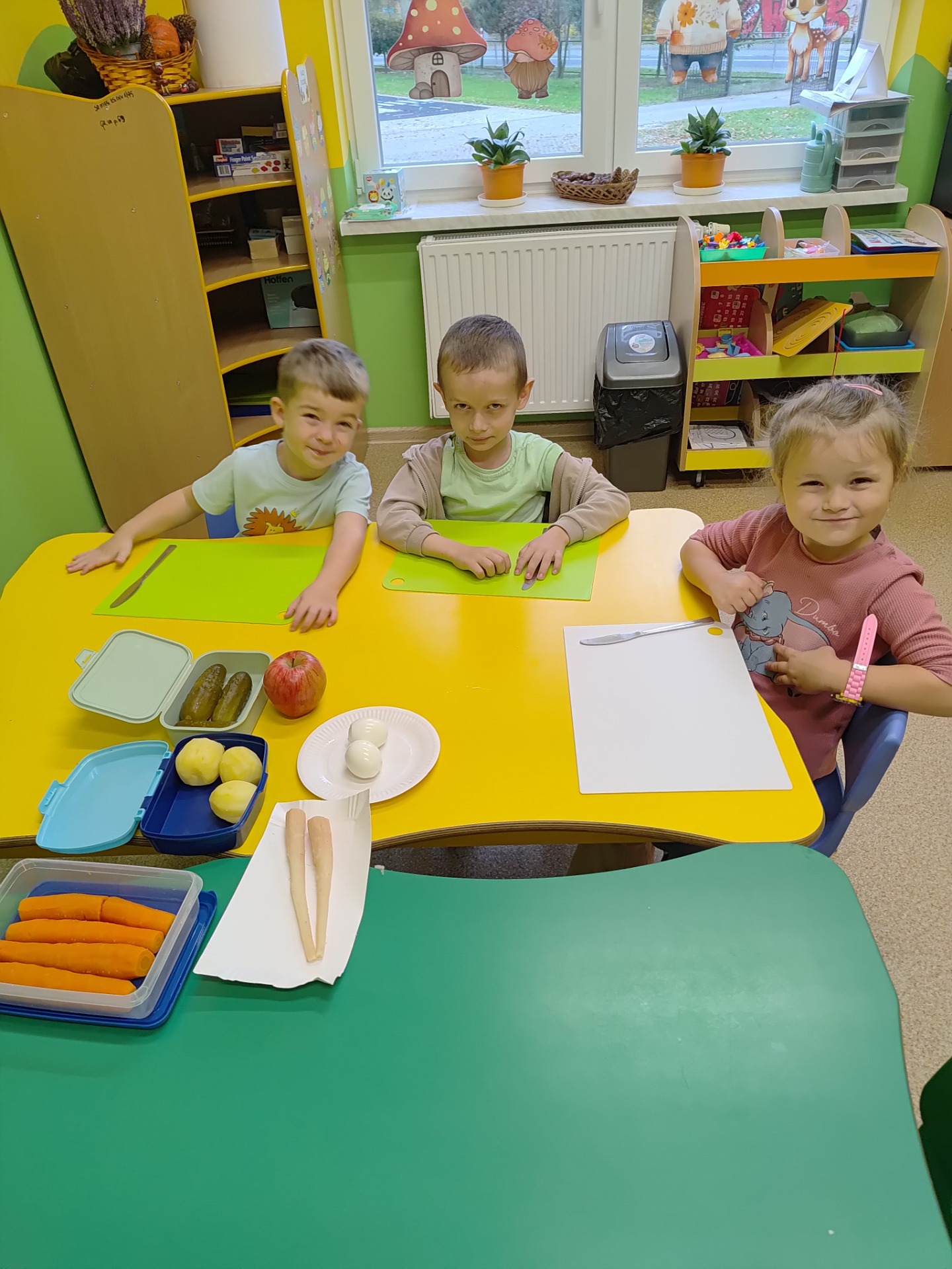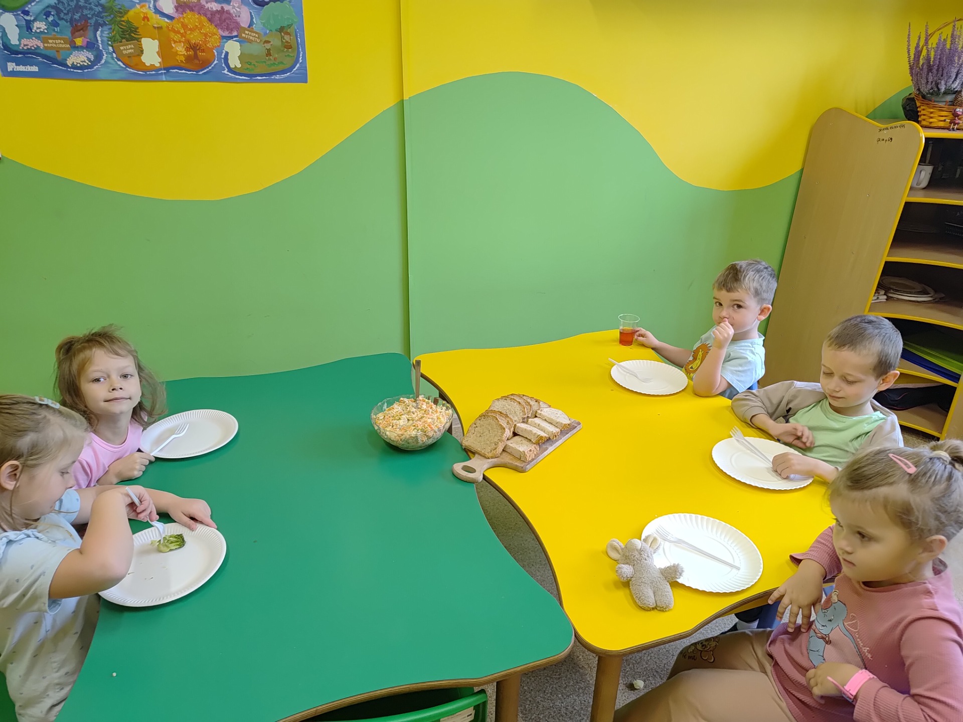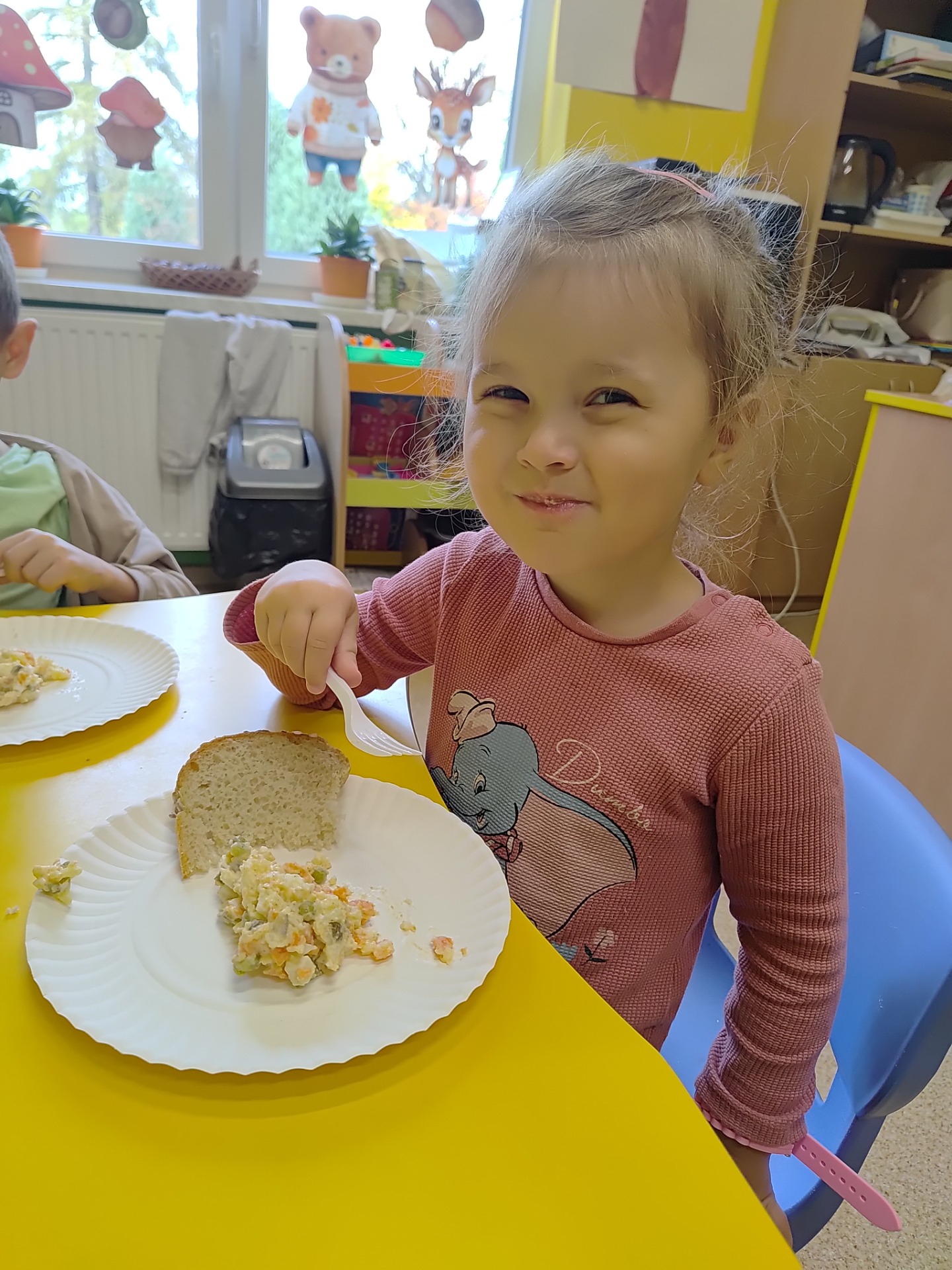 17 października obchodzony jest Światowy Dzień Owoców i Warzyw. To święto, którego głównym celem jest przypomnienie o tym, jak istotnym elementem diety są warzywa i owoce bogate w minerały, witaminy i błonnik. W nawiązaniu do tegoż święta w oddziale przedszkolnym zostały przeprowadzone zajęcia promujące zdrowe nawyki żywieniowe, które należy kształtować już od najmłodszych lat. Dzieci zostały zapoznane talerzem oraz piramidą zdrowego odżywiania. Aktywnie uczestniczyły w zabawach związanych z rozmaitymi warzywami i owocami. Przedszkolaki porównywały wygląd, kolory, smaki i kształty wybranych owoców i warzyw. Wspomniane święto było okazją do przygotowania zdrowej sałatki warzywnej. Dzieci z ogromnym zaangażowanie kroiły warzywa, dodawały i mieszały potrzebne składniki. Na koniec oczywiście odbyła się degustacja. Było smacznie, kolorowo i witaminowo. Od dzisiaj każdy przedszkolak wie co powinien jeść, aby być silnym i zdrowym!