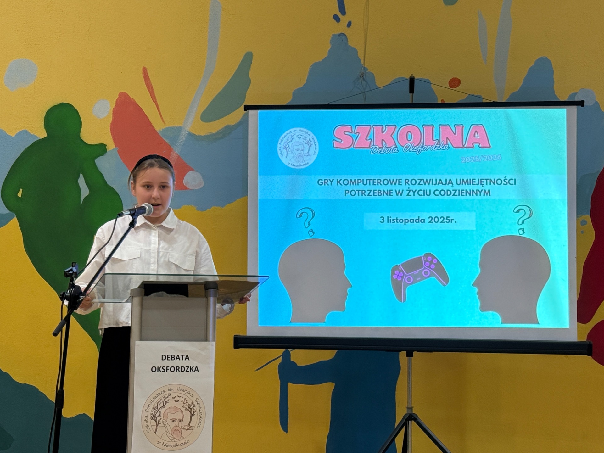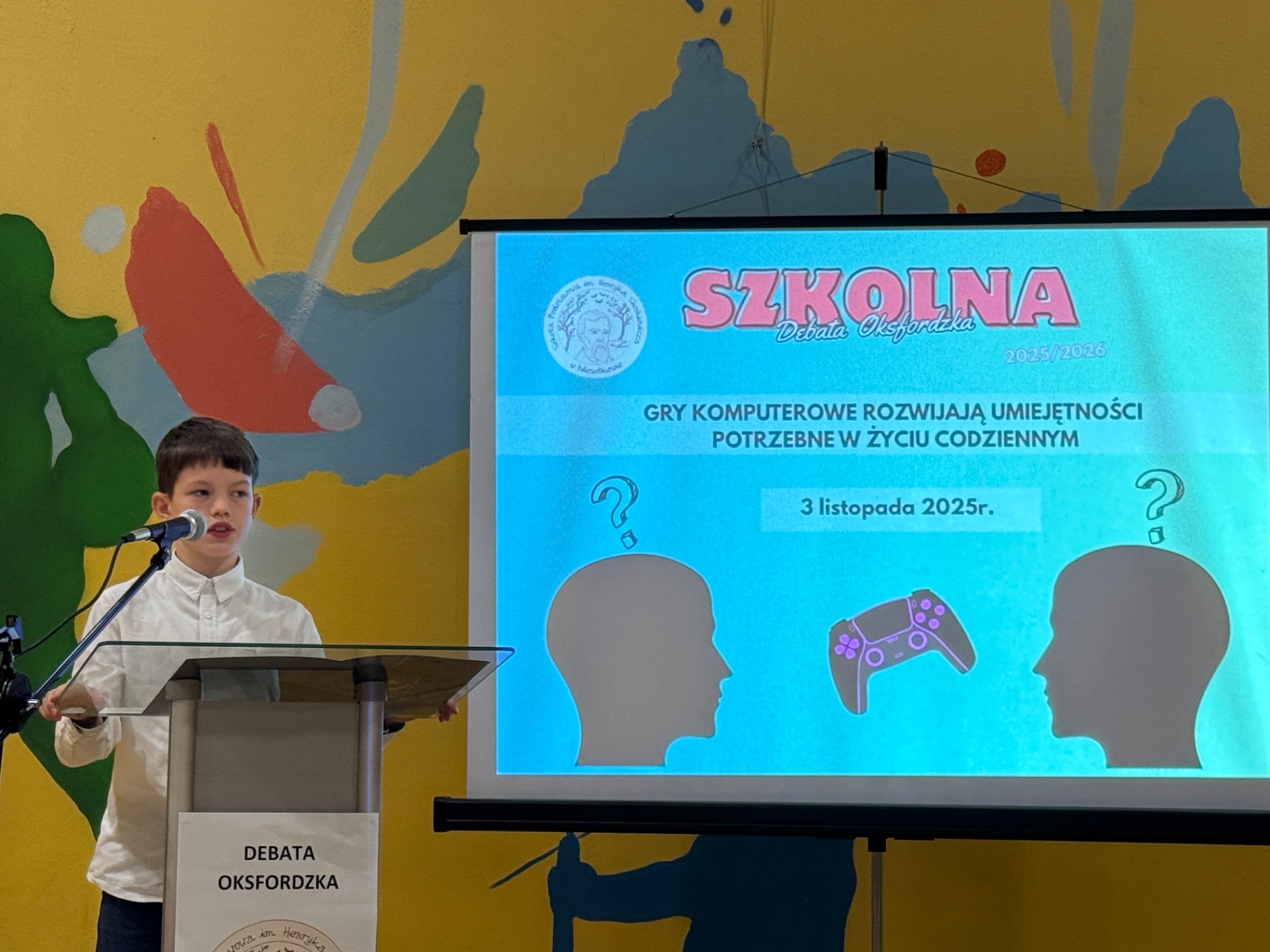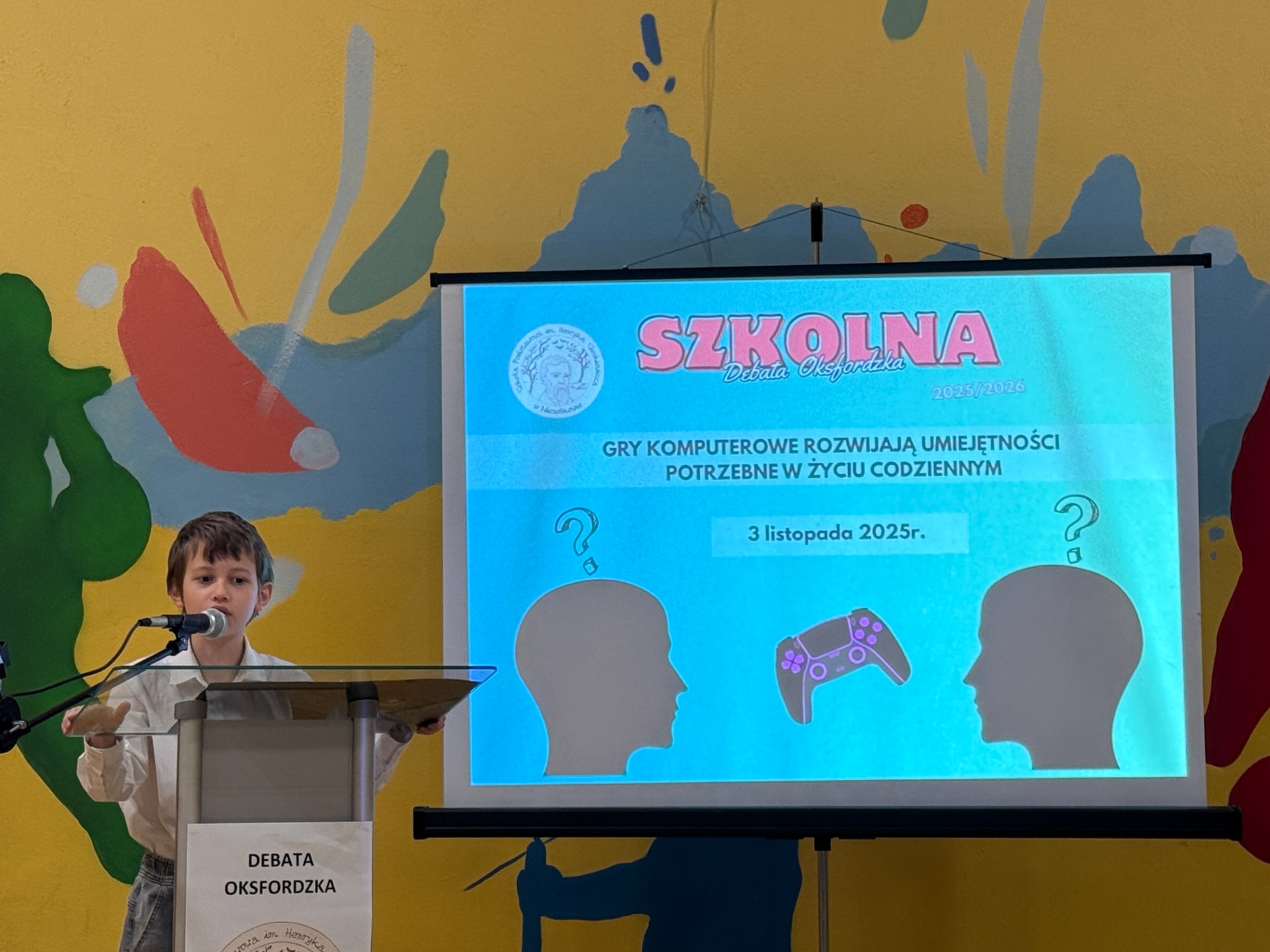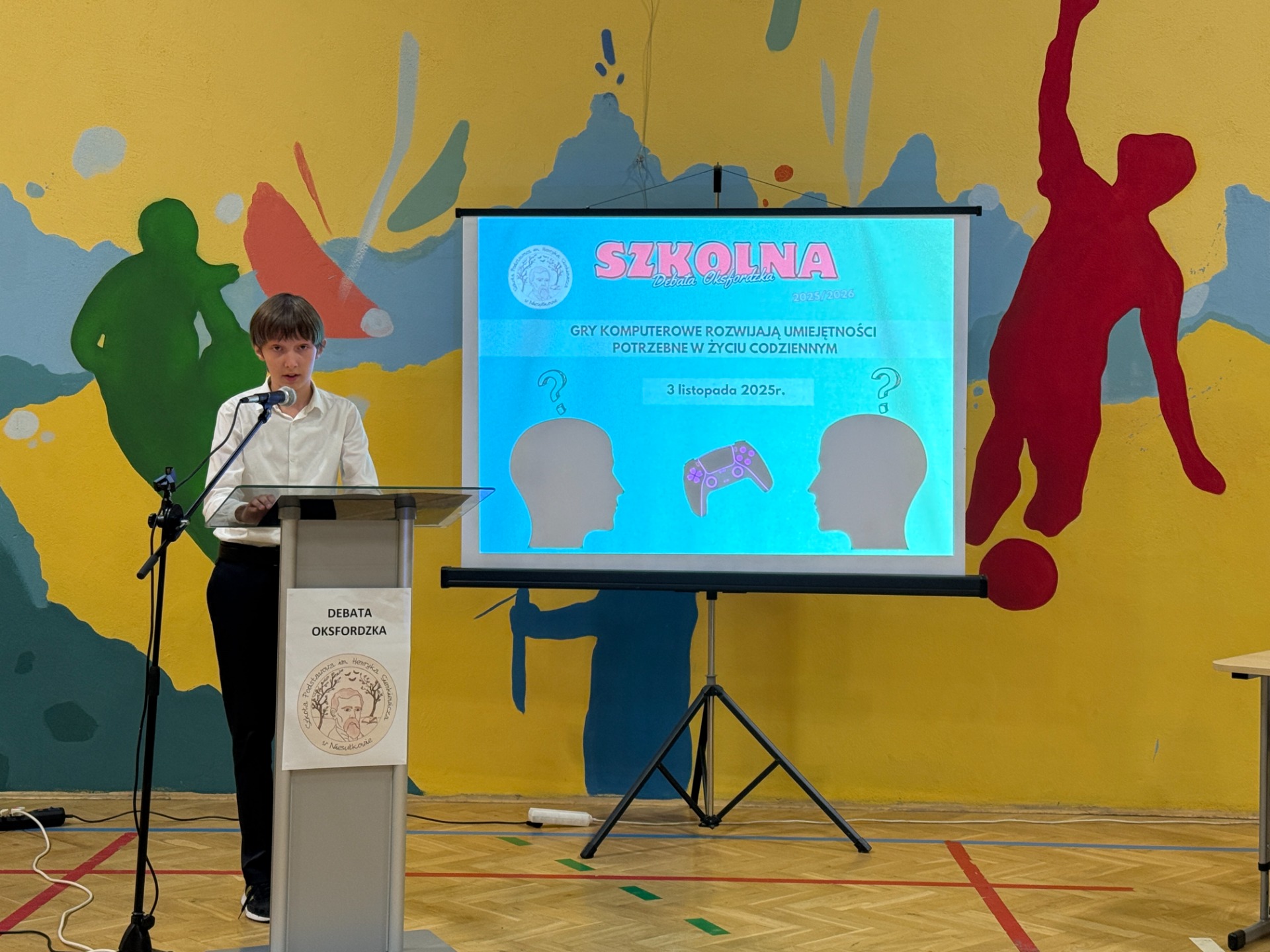 Dziś klasa piąta zamieniła się w prawdziwych mówców i uczestniczyła w pierwszej w tym roku szkolnym debacie oksfordzkiej. Temat, który rozpalił dyskusję brzmiał: „Gry komputerowe rozwijają umiejętności potrzebne w życiu codziennym.” Nie będziemy ukrywać – na początku był stres! Serce biło jak szalone, gdy trzeba było stanąć przed całą szkołą i mówić do mikrofonu. Ale z każdą minutą było coraz lepiej, a kiedy zaczęliśmy przedstawiać nasze argumenty, stres zamienił się w prawdziwe emocje i dumę.