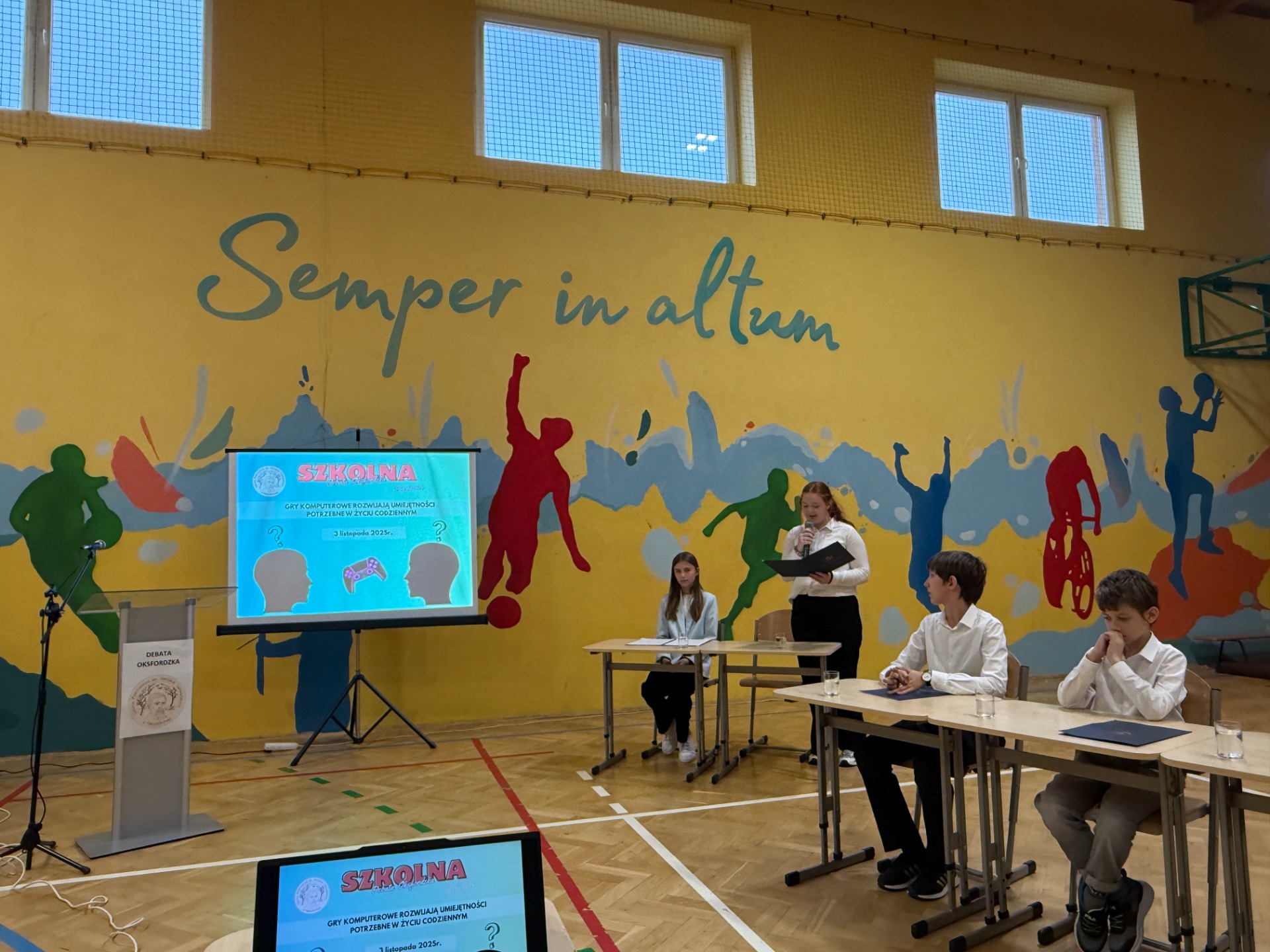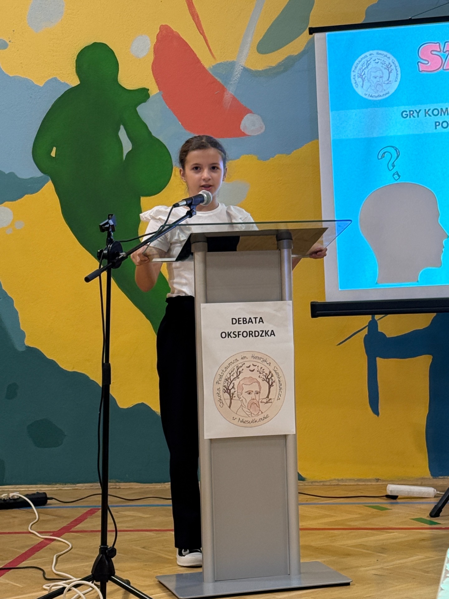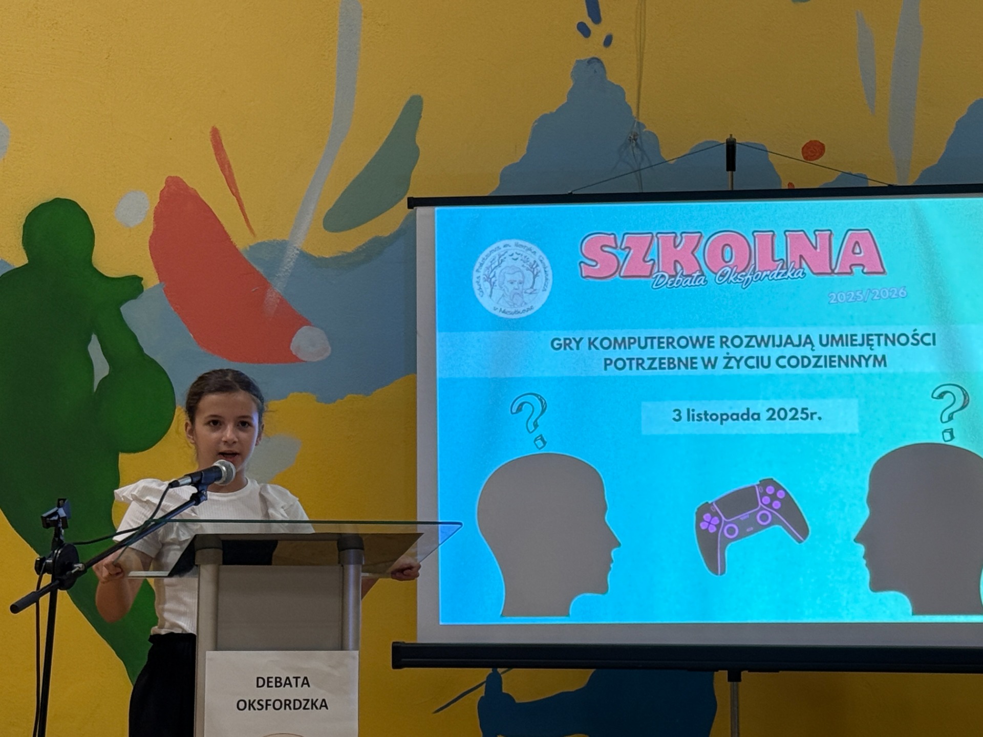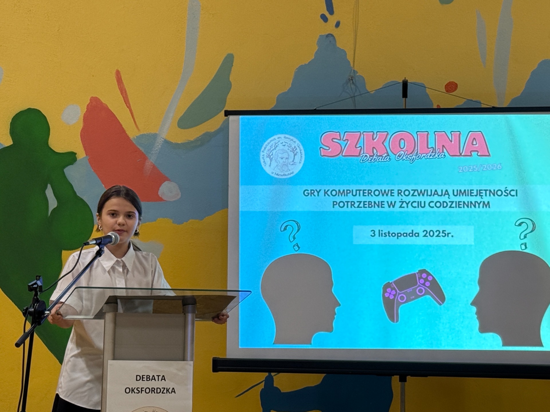 Dziś klasa piąta zamieniła się w prawdziwych mówców i uczestniczyła w pierwszej w tym roku szkolnym debacie oksfordzkiej. Temat, który rozpalił dyskusję brzmiał: „Gry komputerowe rozwijają umiejętności potrzebne w życiu codziennym.” Nie będziemy ukrywać – na początku był stres! Serce biło jak szalone, gdy trzeba było stanąć przed całą szkołą i mówić do mikrofonu. Ale z każdą minutą było coraz lepiej, a kiedy zaczęliśmy przedstawiać nasze argumenty, stres zamienił się w prawdziwe emocje i dumę.