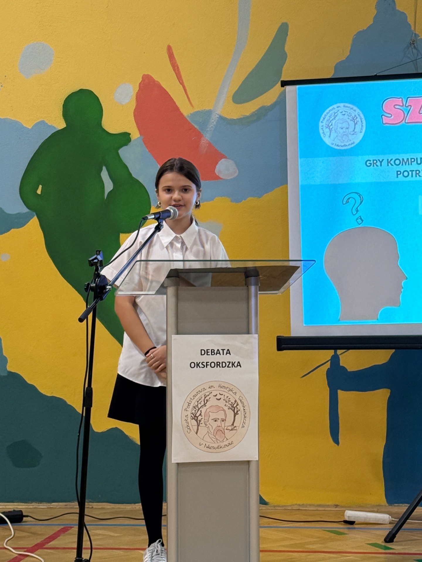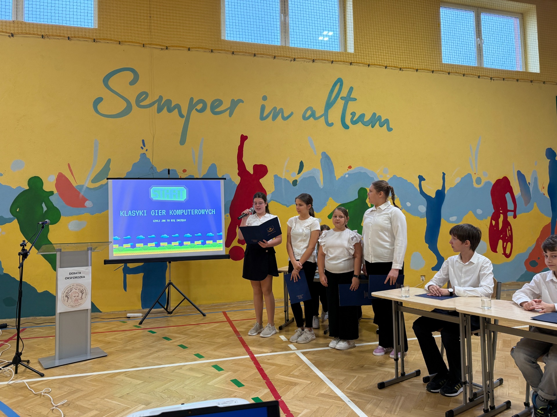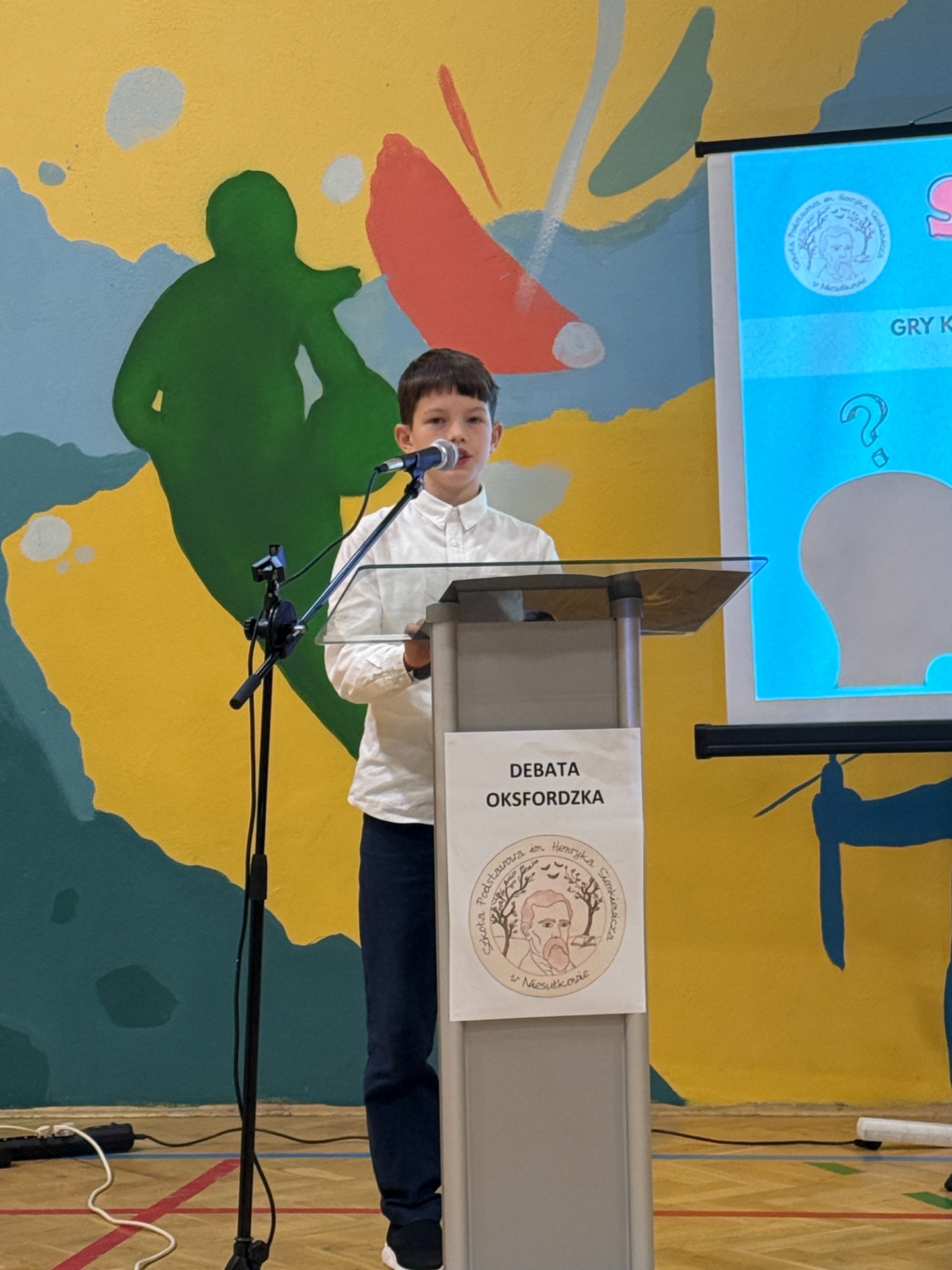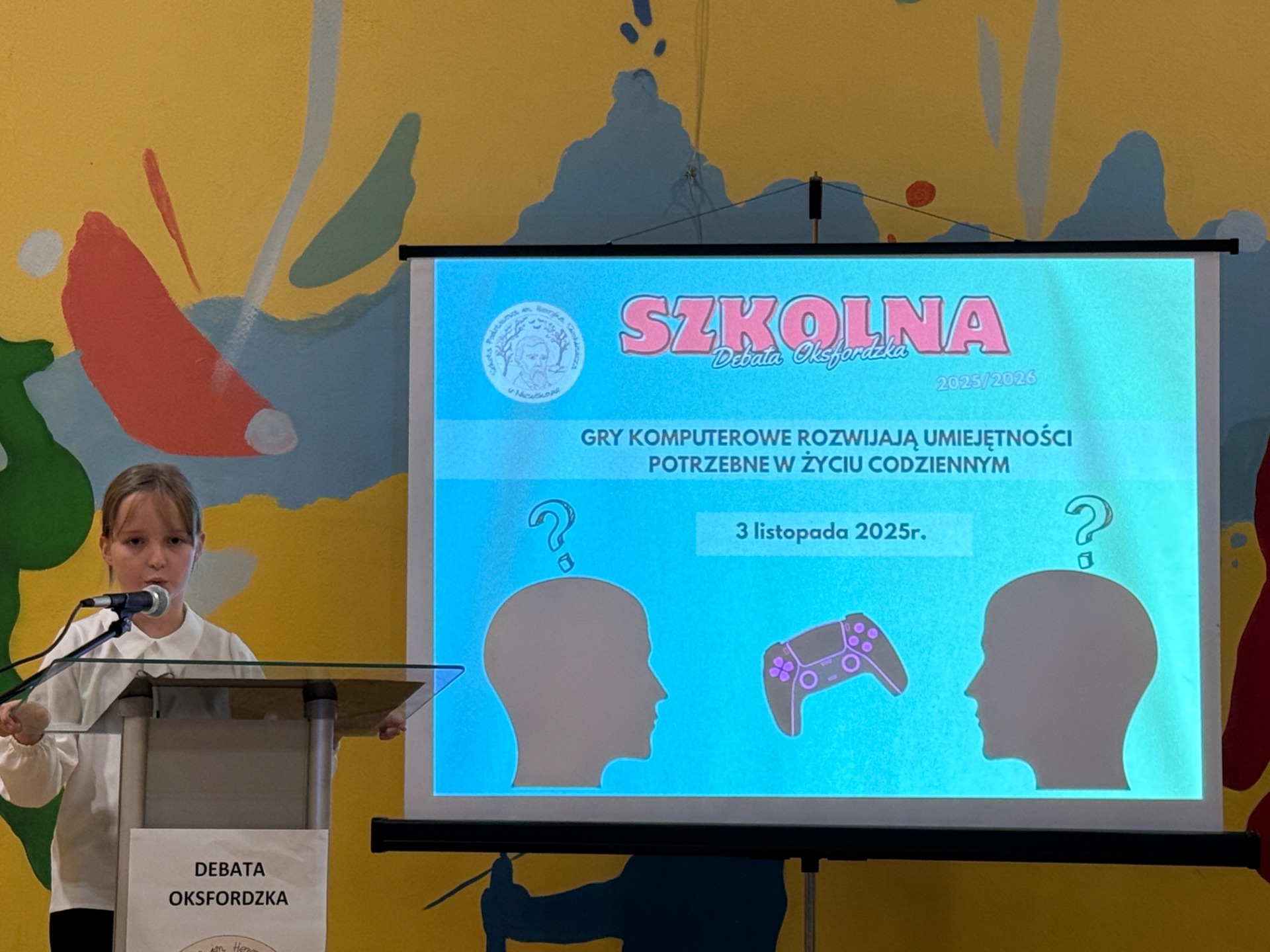 Dziś klasa piąta zamieniła się w prawdziwych mówców i uczestniczyła w pierwszej w tym roku szkolnym debacie oksfordzkiej. Temat, który rozpalił dyskusję brzmiał: „Gry komputerowe rozwijają umiejętności potrzebne w życiu codziennym.” Nie będziemy ukrywać – na początku był stres! Serce biło jak szalone, gdy trzeba było stanąć przed całą szkołą i mówić do mikrofonu. Ale z każdą minutą było coraz lepiej, a kiedy zaczęliśmy przedstawiać nasze argumenty, stres zamienił się w prawdziwe emocje i dumę.
