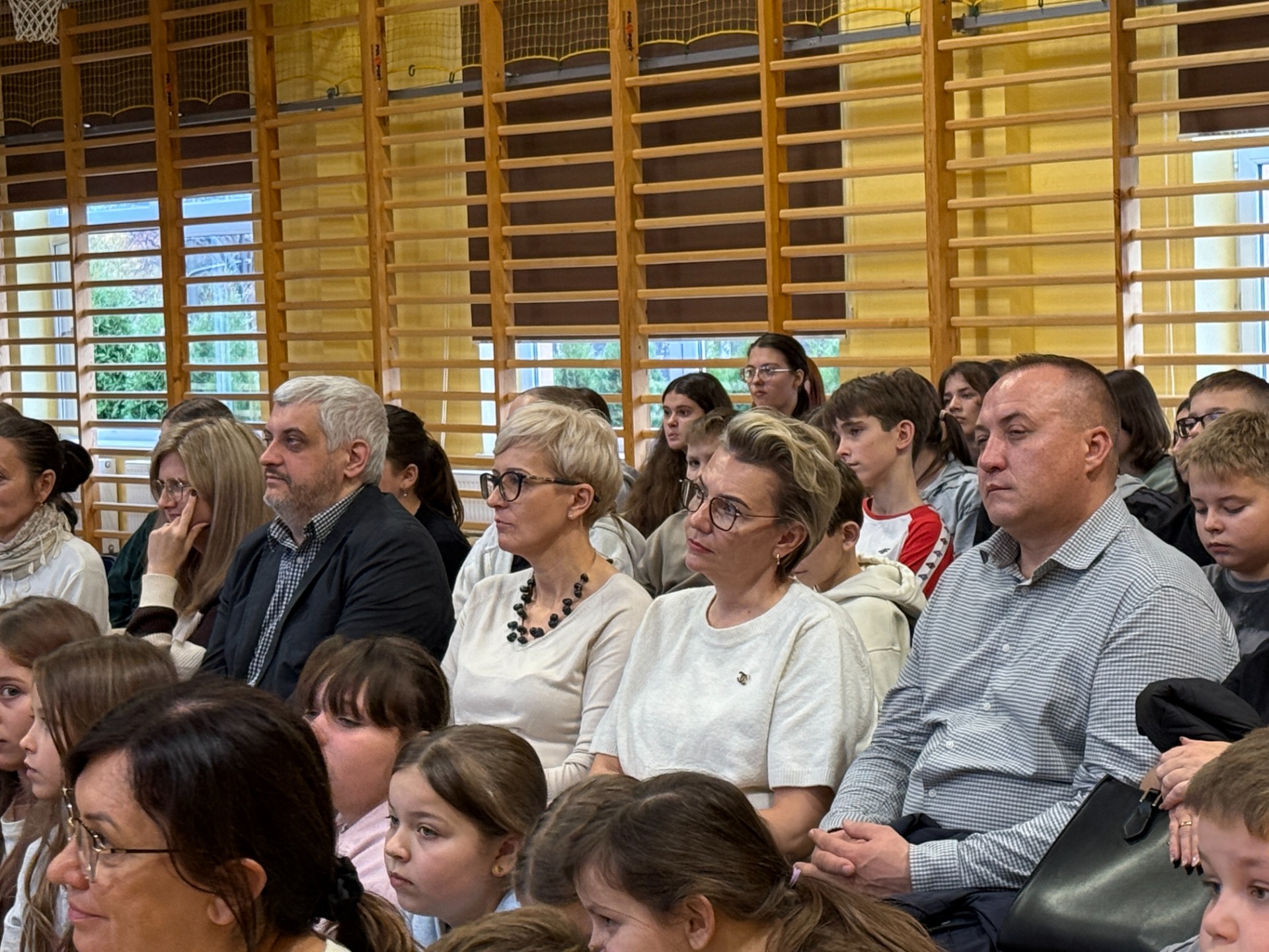 Dodatkową atrakcją była przygotowana przez nas prezentacja o starych grach komputerowych, która bardzo spodobała się publiczności, wywołując uśmiech i nutę nostalgii! Na widowni, oprócz uczniów i nauczycieli, zasiedli również nasi rodzice, którzy gorąco nam kibicowali z uśmiechem i wielką dumą, dodając nam otuchy.