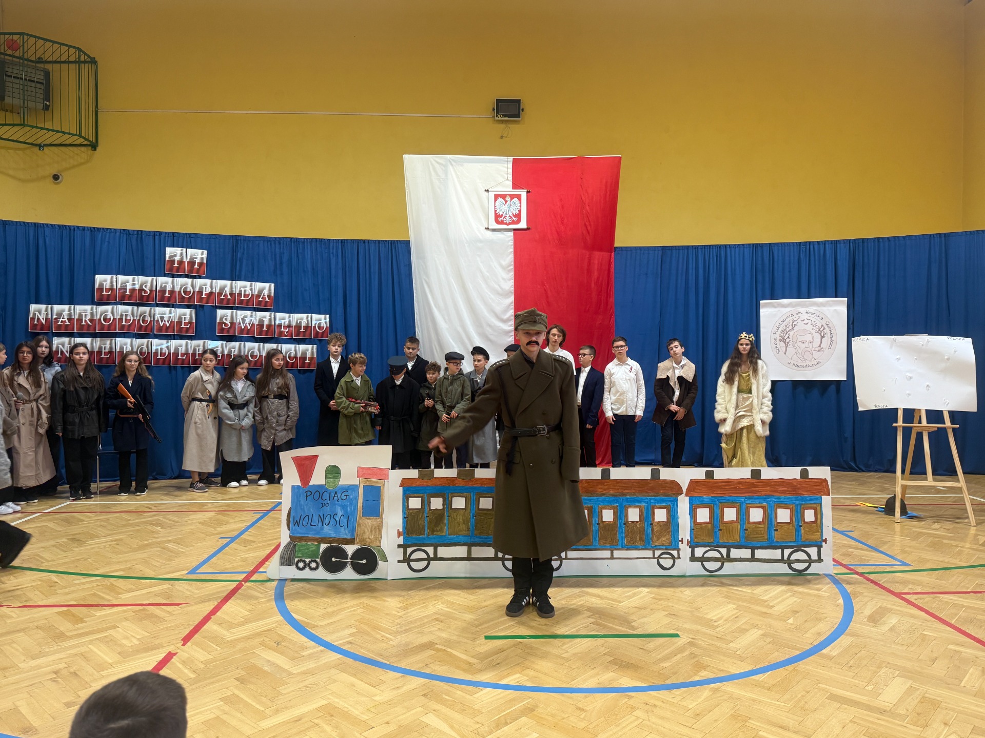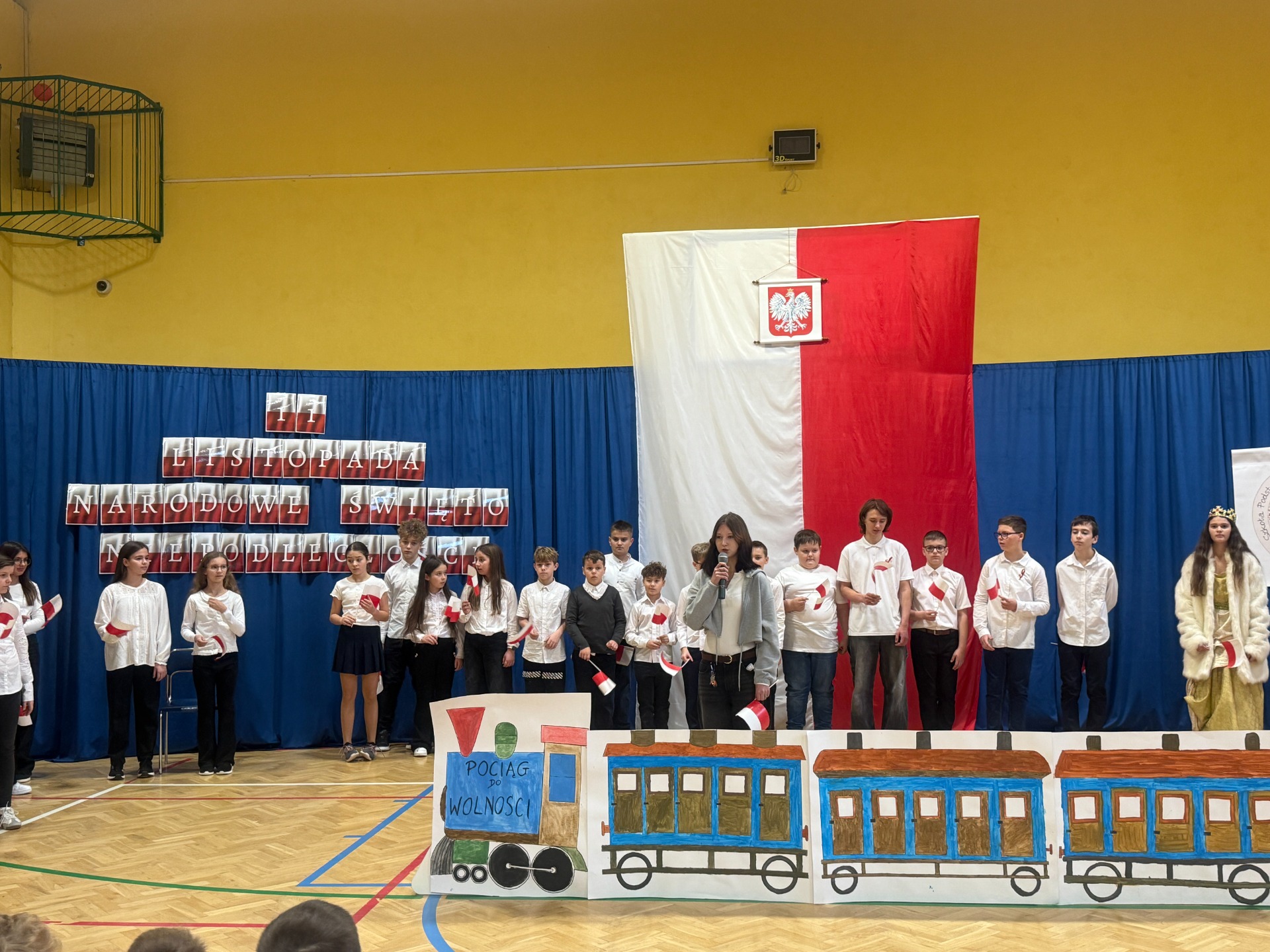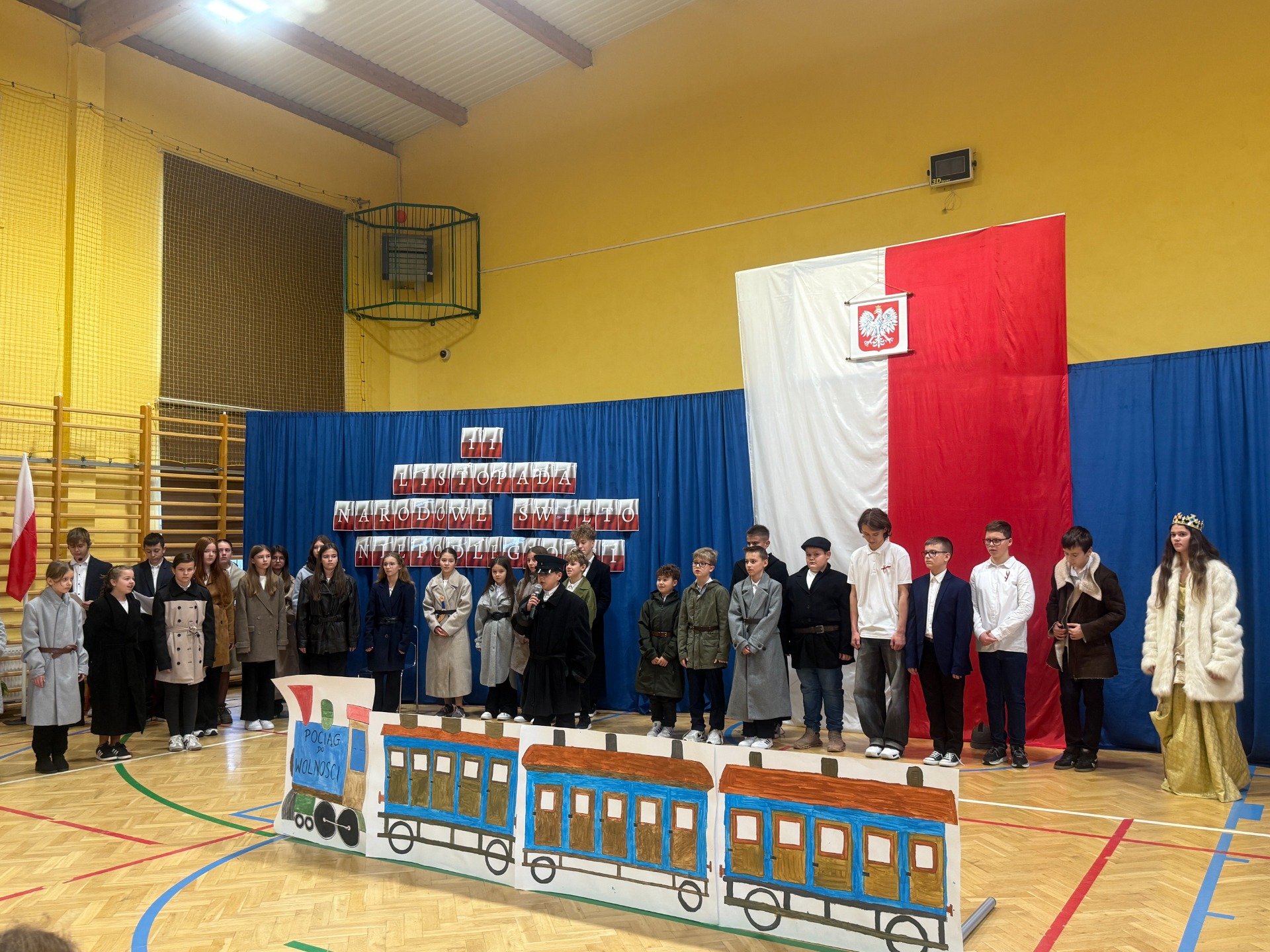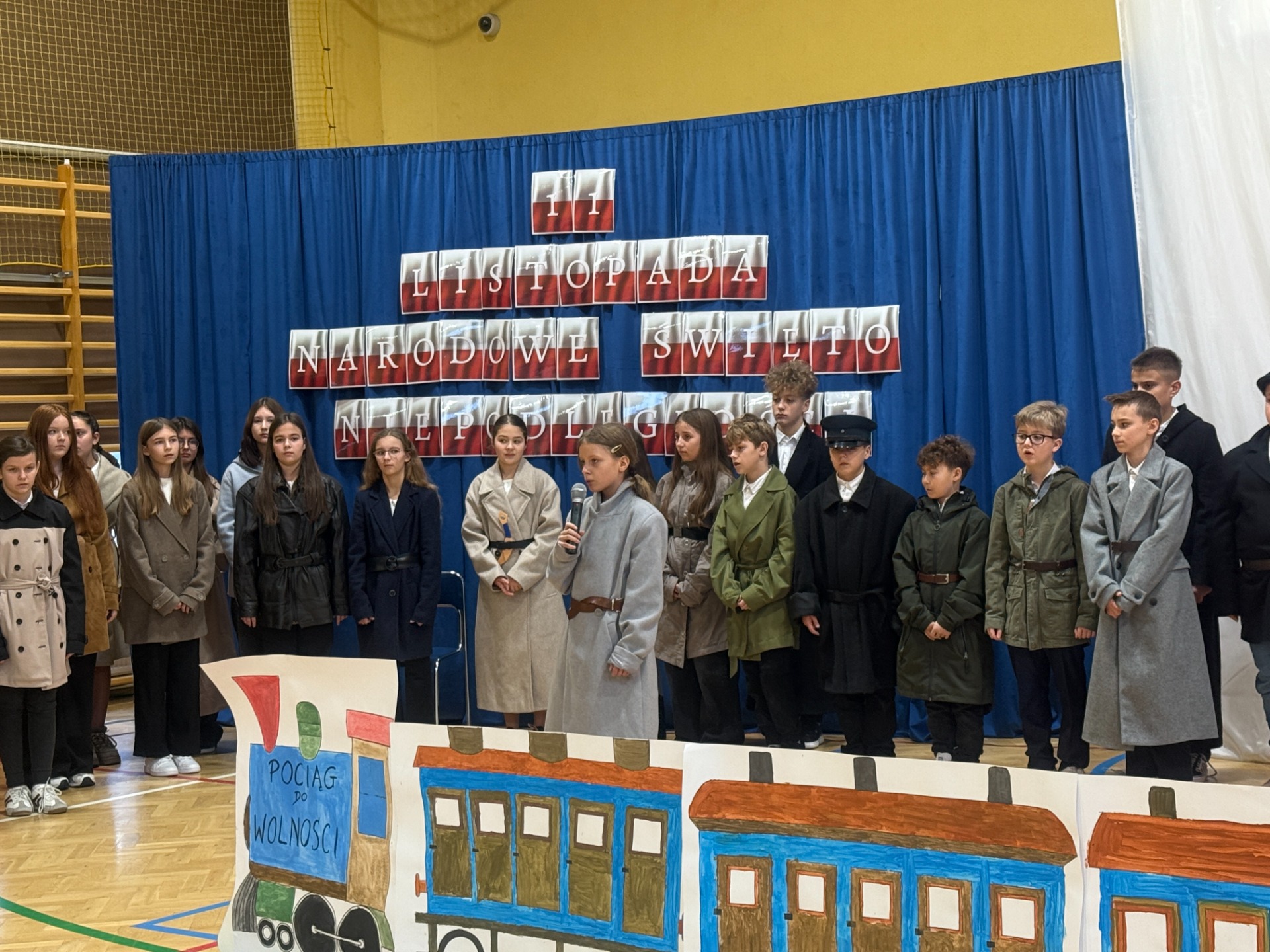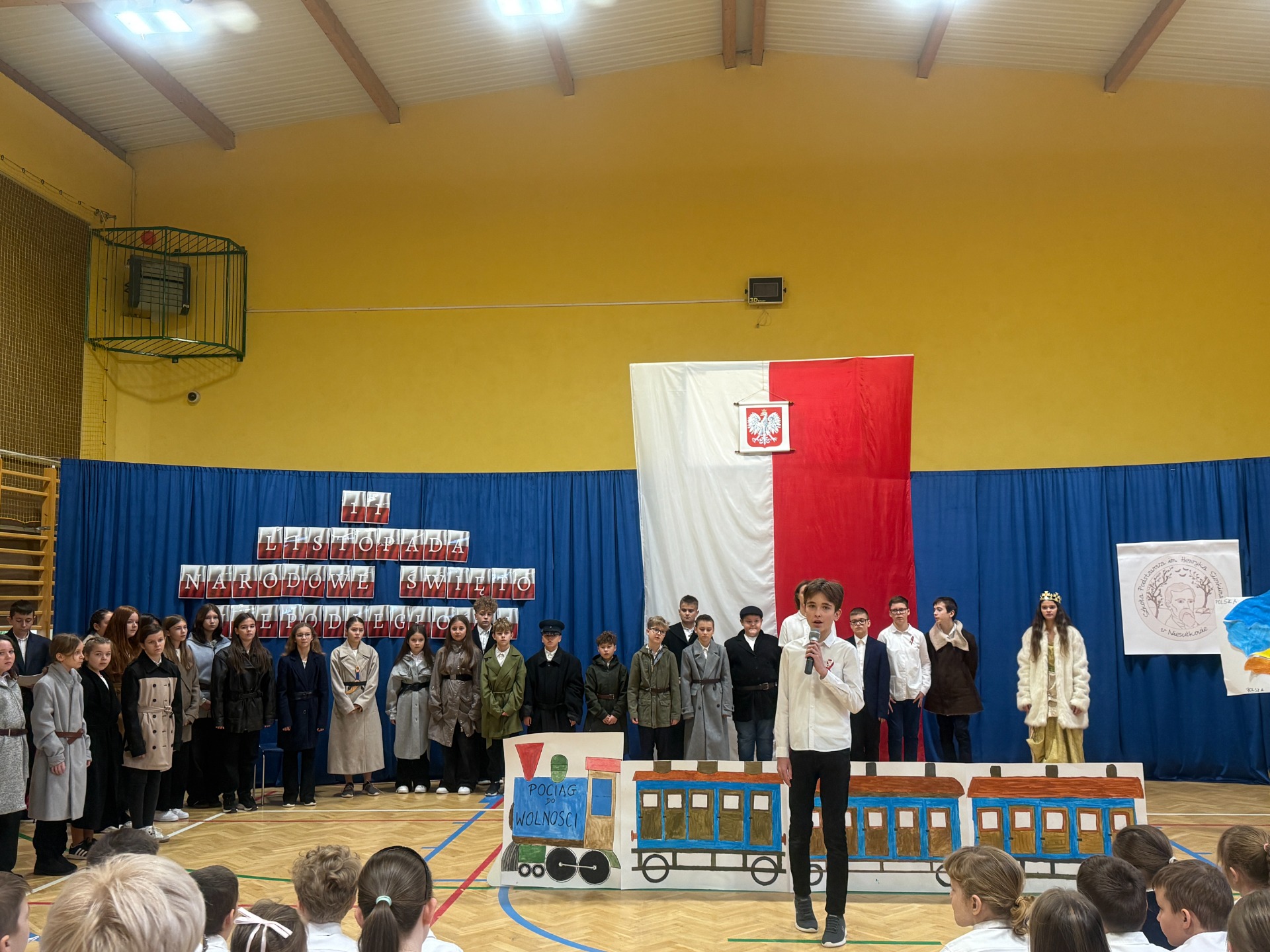11 listopada to zawsze dzień wyjątkowy – pełen zadumy, wzruszeń i dumy z polskiej historii. W tym roku zaprosiliśmy całą społeczność szkolną do niezwykłej podróży. Na scenie stanął… „Pociąg do wolności”, a uczniowie klas starszych oprowadzili widzów po symbolicznych stacjach ważnych wydarzeń z dziejów naszej ojczyzny.