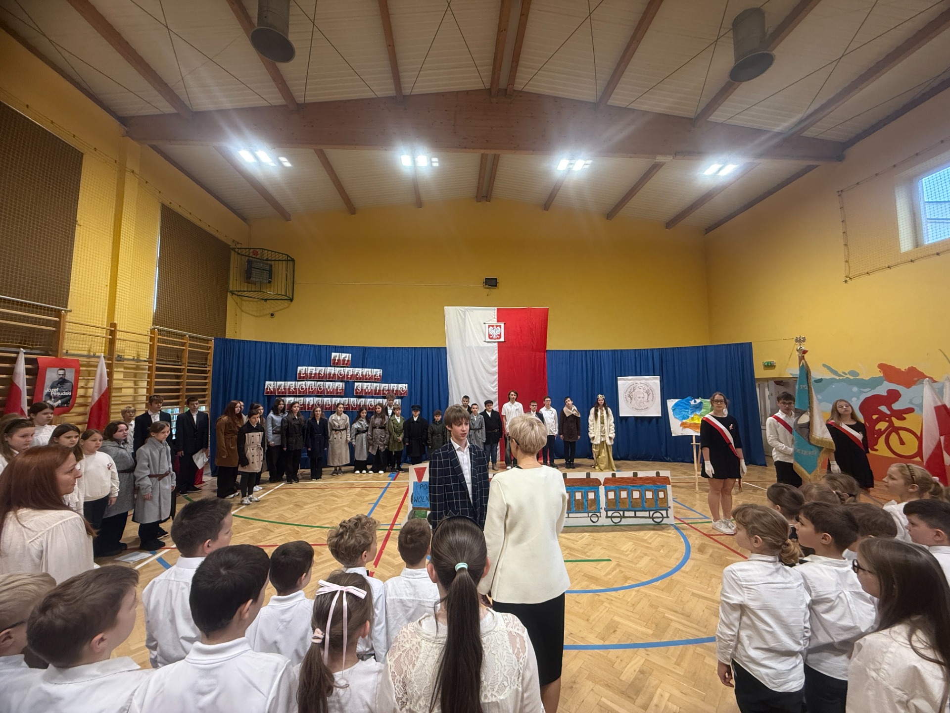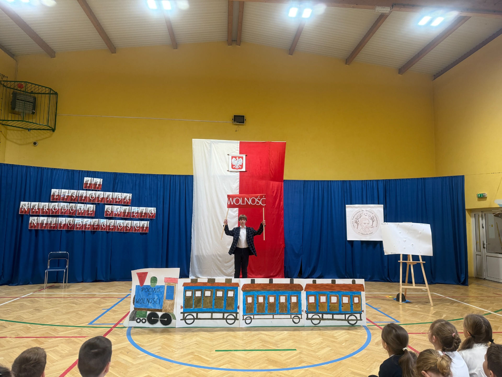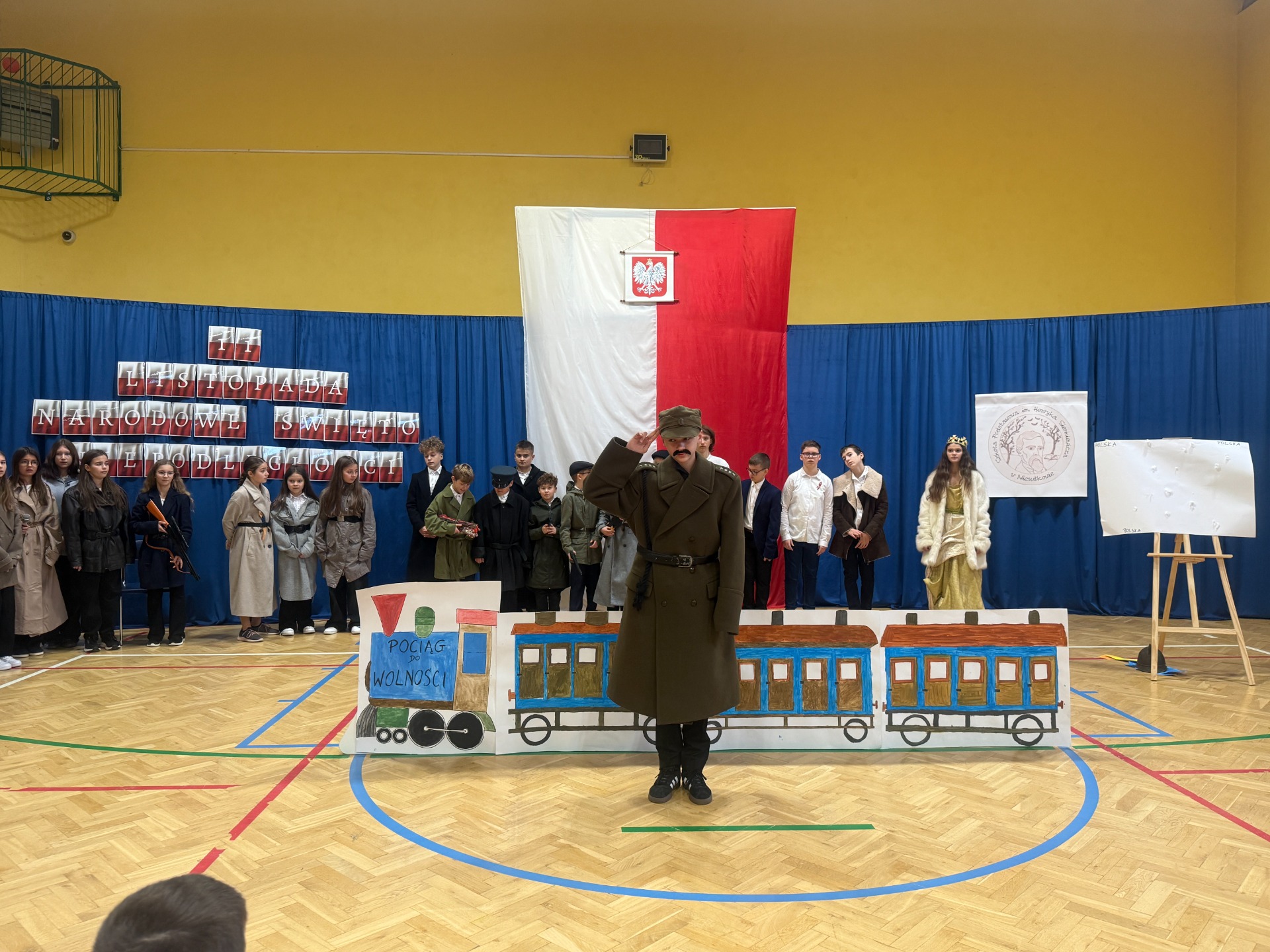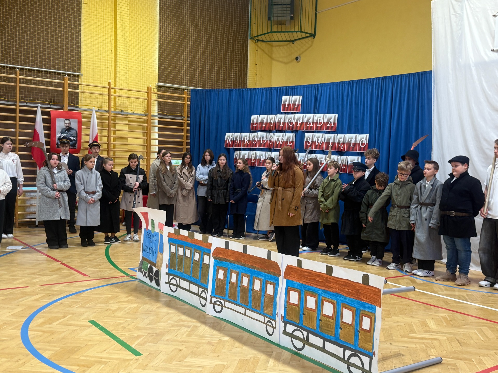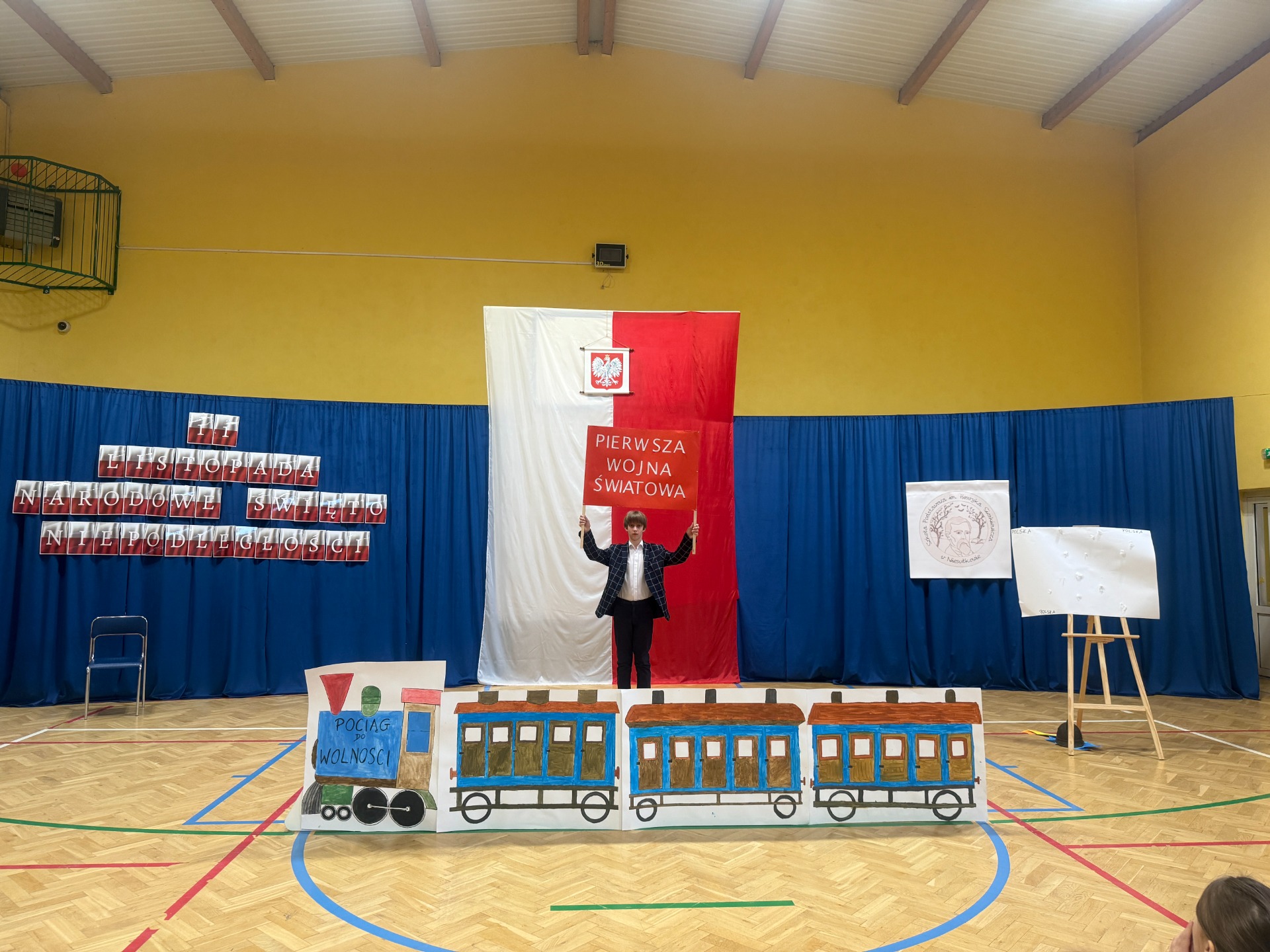 11 listopada to zawsze dzień wyjątkowy – pełen zadumy, wzruszeń i dumy z polskiej historii. W tym roku zaprosiliśmy całą społeczność szkolną do niezwykłej podróży. Na scenie stanął… „Pociąg do wolności”, a uczniowie klas starszych oprowadzili widzów po symbolicznych stacjach ważnych wydarzeń z dziejów naszej ojczyzny.
