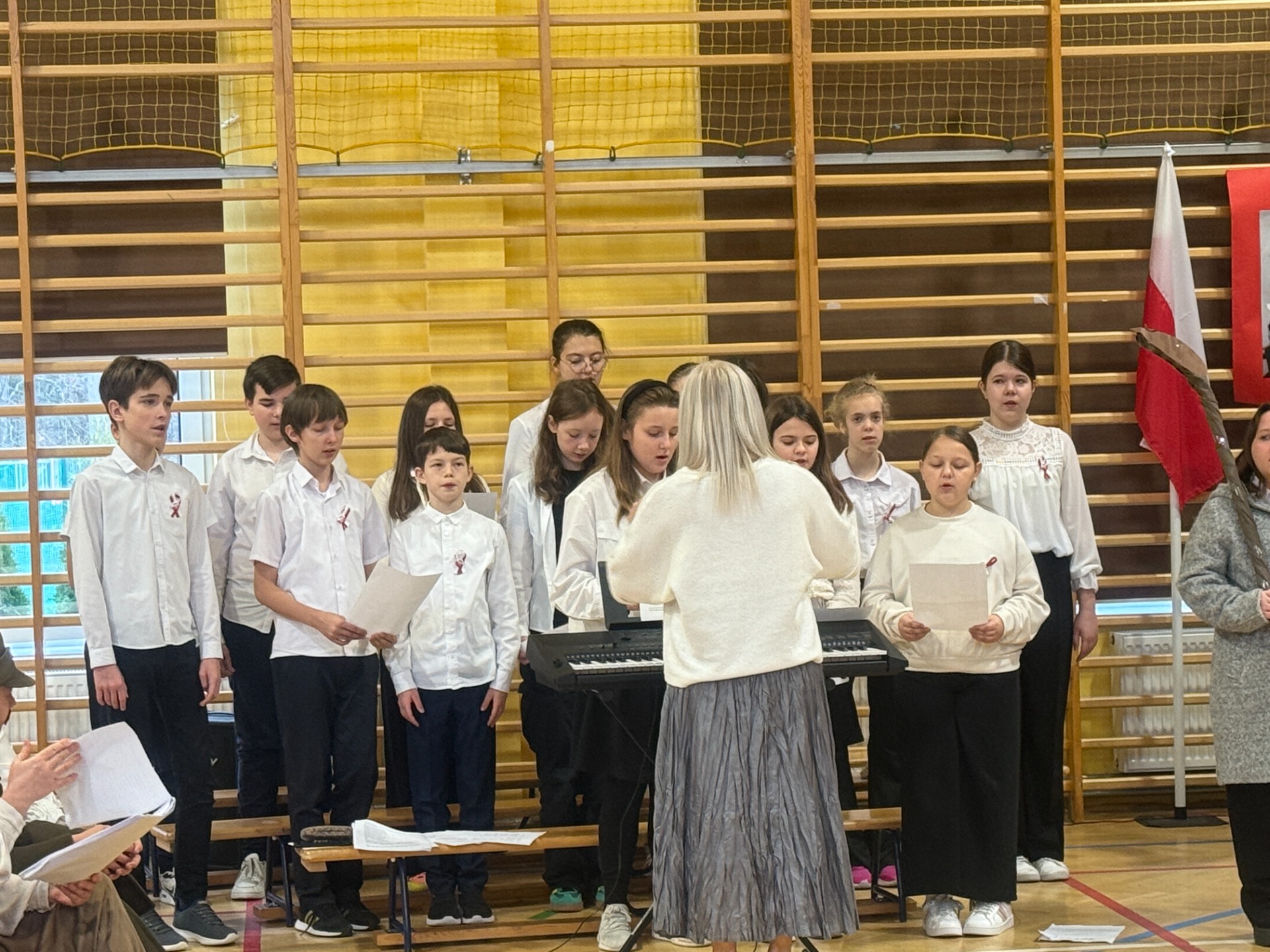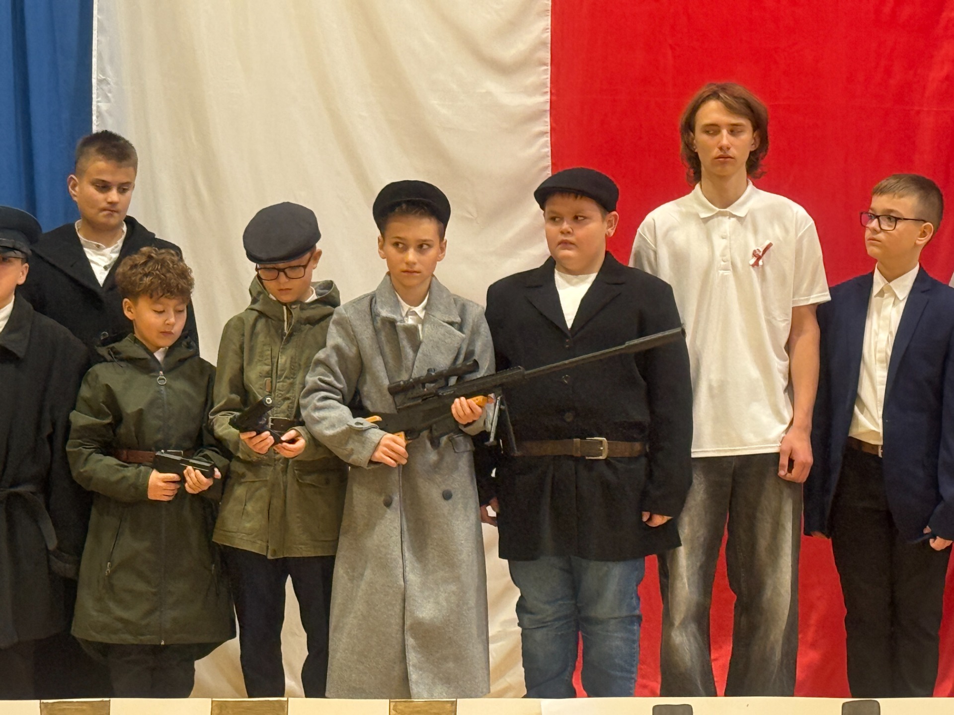 Całą inscenizację przygotowali uczniowie klasy 4 i 7, którzy z ogromnym zaangażowaniem wcielili się w role narratorów, przewodników i bohaterów poszczególnych scen, a szkolny chór swoim wzruszającym wykonaniem pieśni patriotycznych, nadał całemu wydarzeniu wyjątkową, uroczystą oprawę.